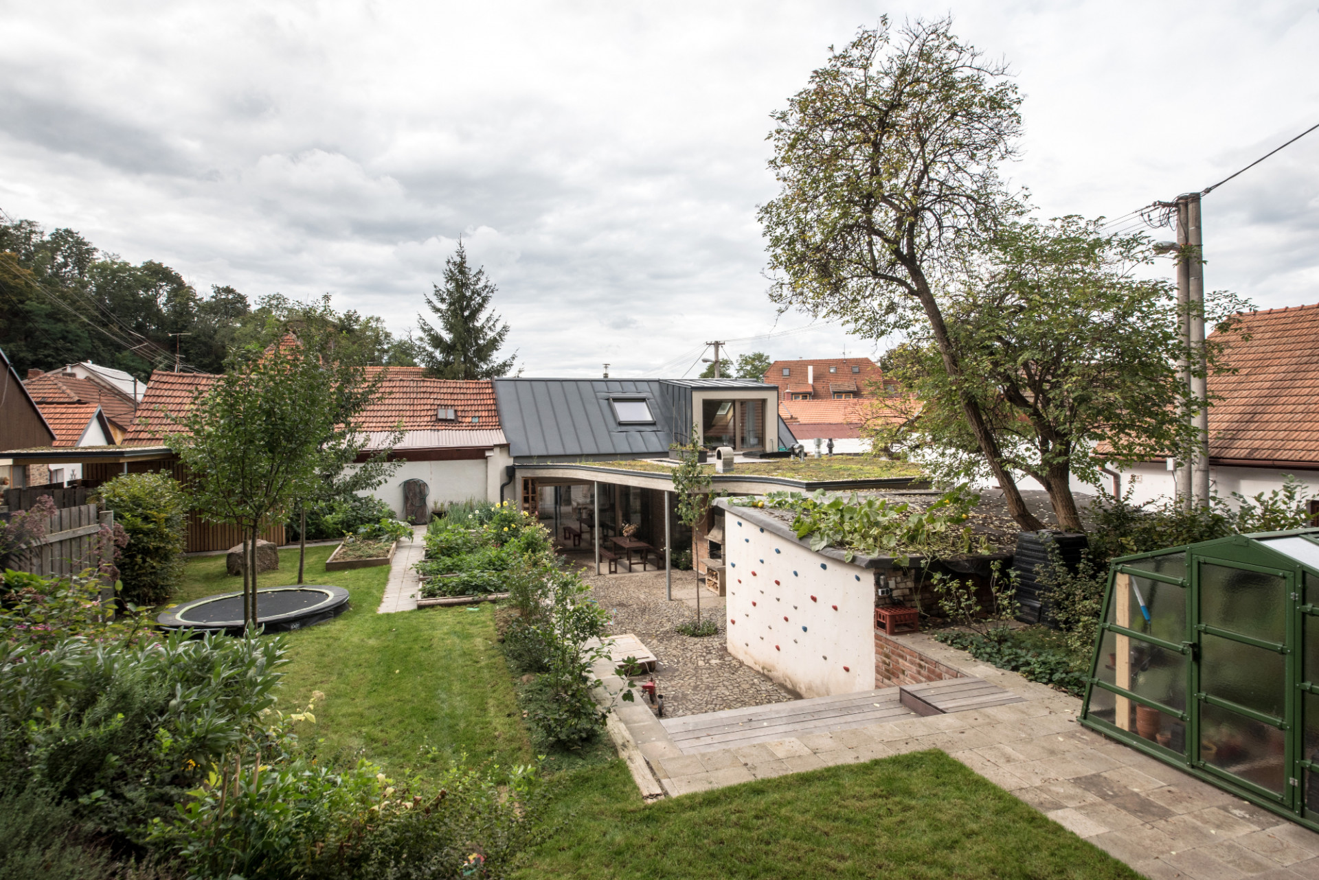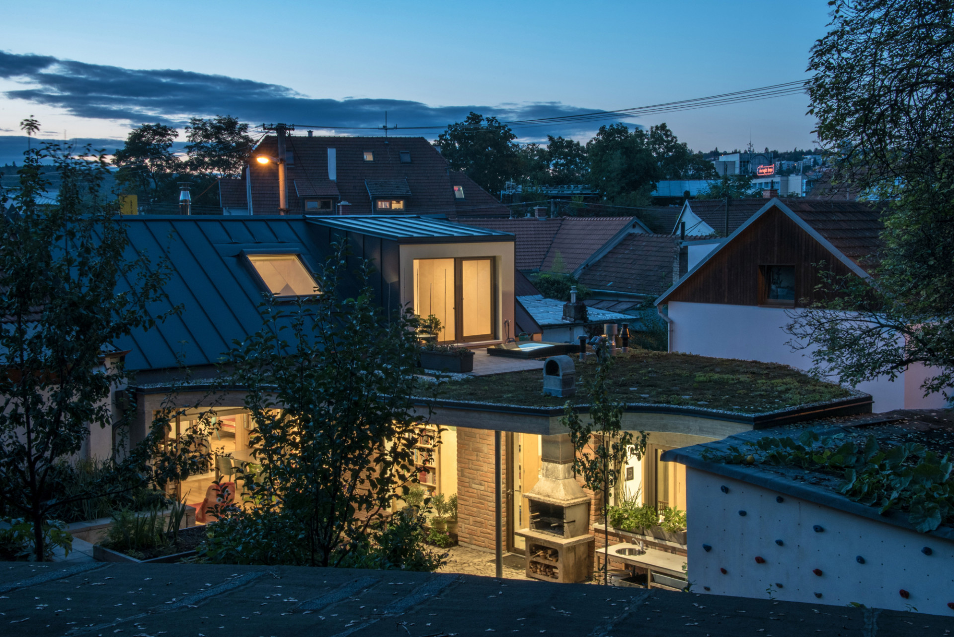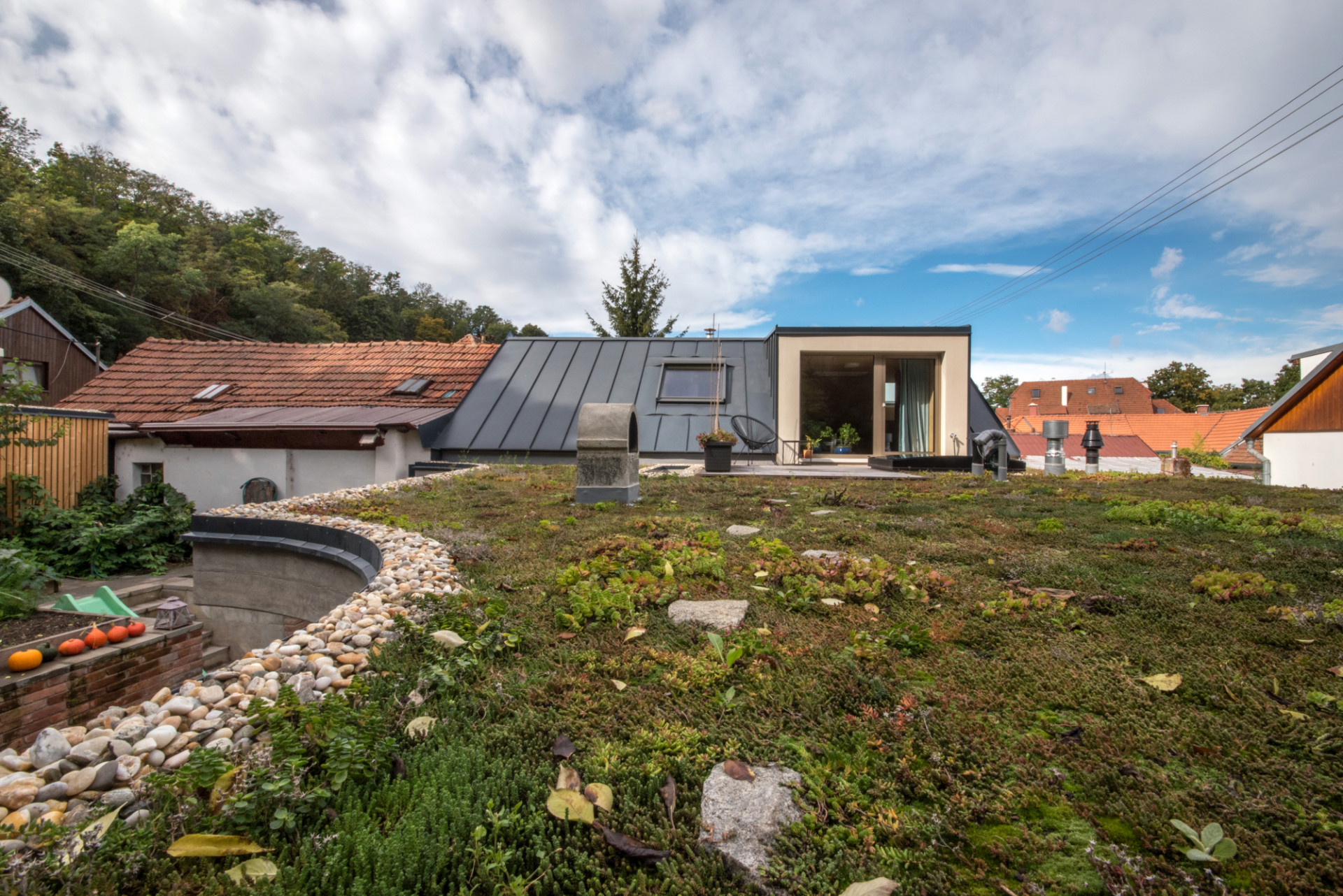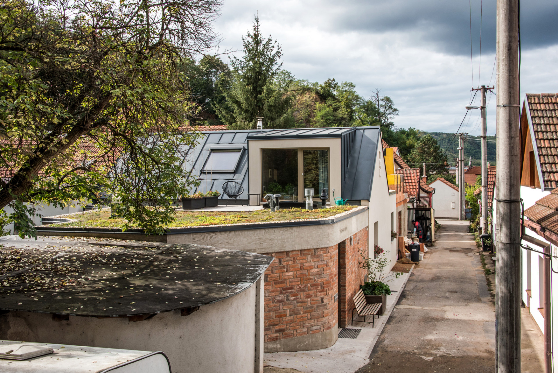 Původní část objektu architekti hmotově sjednotili a zjednodušili (přístavky jsou nově zastřešeny plochou střechou v jedné rovině). Šikmá střecha je opět pokryta plechem, ale nově v antracitové barvě (dříve byl červený), která odkazuje na někdejší použití černých asfaltových pásů jako krytiny u původních nouzových domků. Tehdy byla střešní krajina celé lokality různorodá, podtrhující „vlaštovčí hnízdo“, tak typické pro dané území. Celý původní objem byl zateplen minerální vatou a omítnut. „Dům stojí na dně lomu, takže střecha je v podstatě třetí fasádou – lidé, kteří jdou po hraně lomu, na střechu vidí, proto jsme ji řešili i pohledově. Materiálově i barevně jsme sjednotili vikýř a střešní okna s plechem střechy, proto jsme vybrali antracitový odstín,“ pokračuje Ing. arch. Radim Horák.