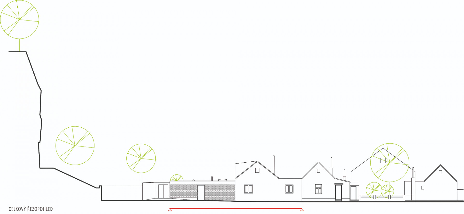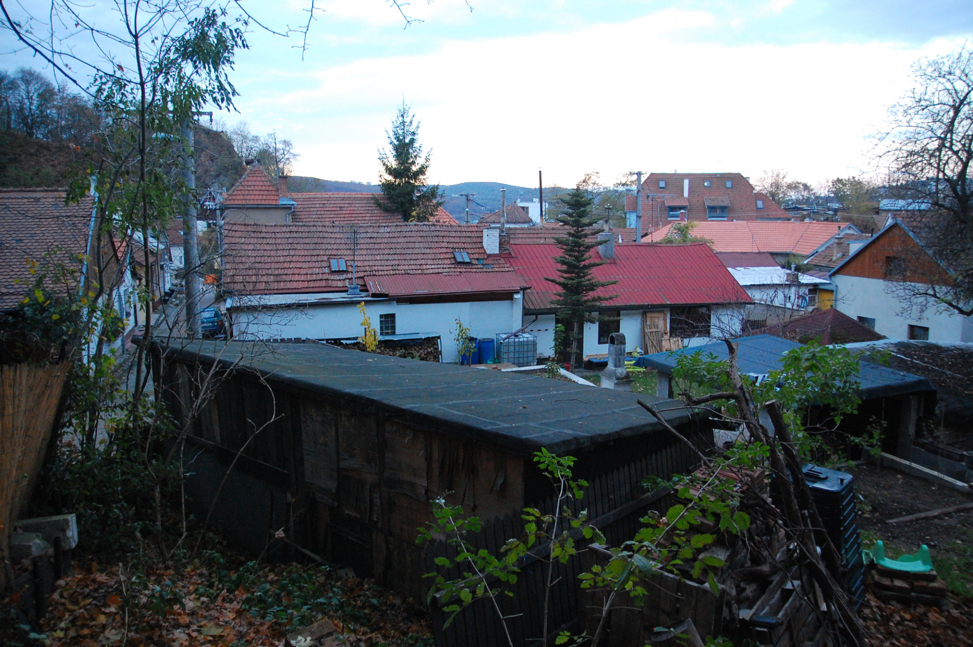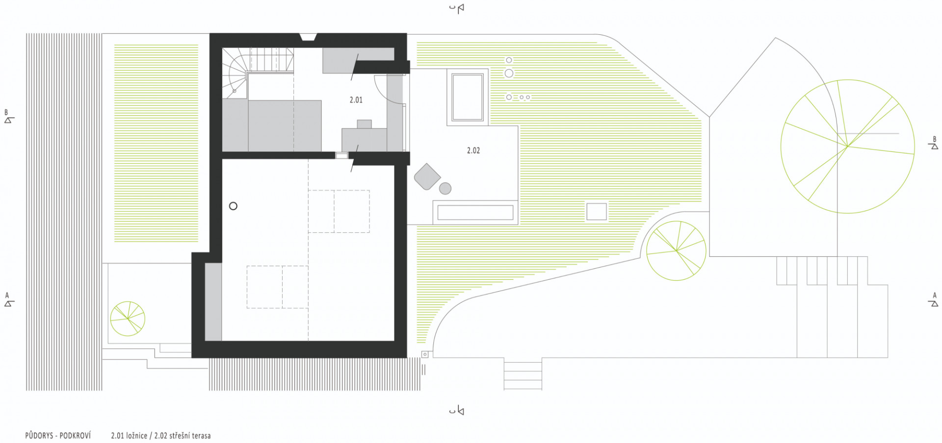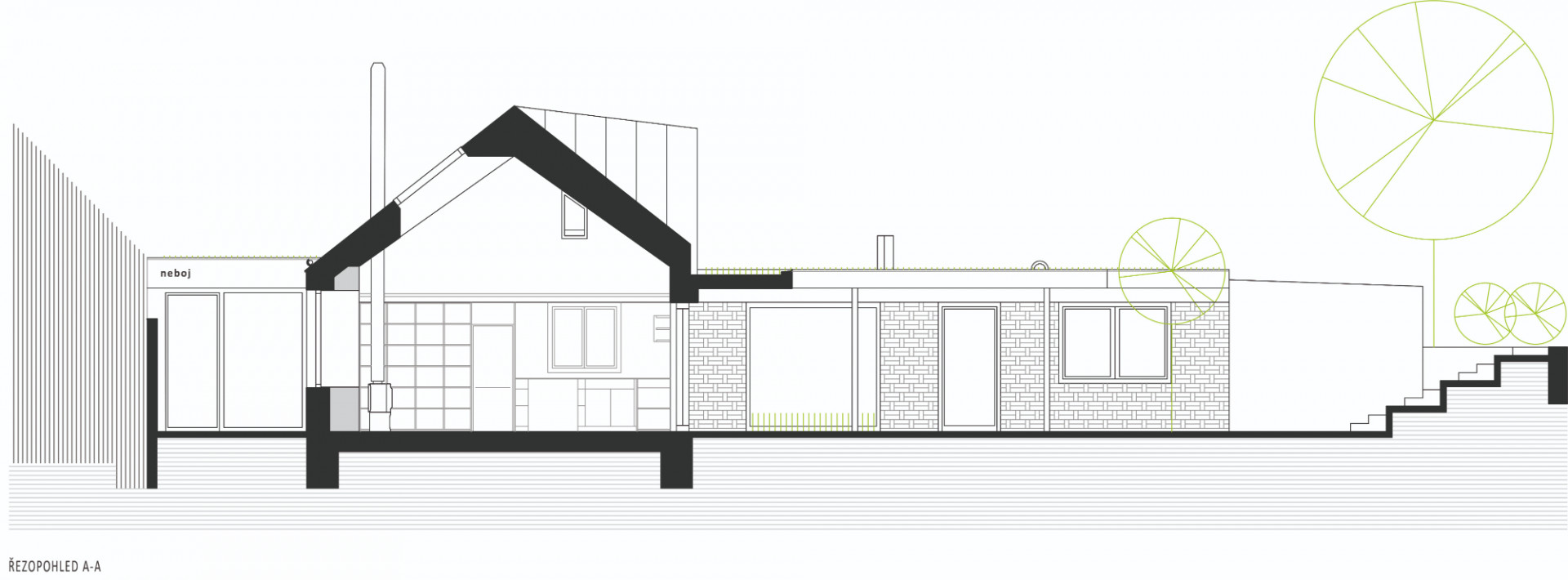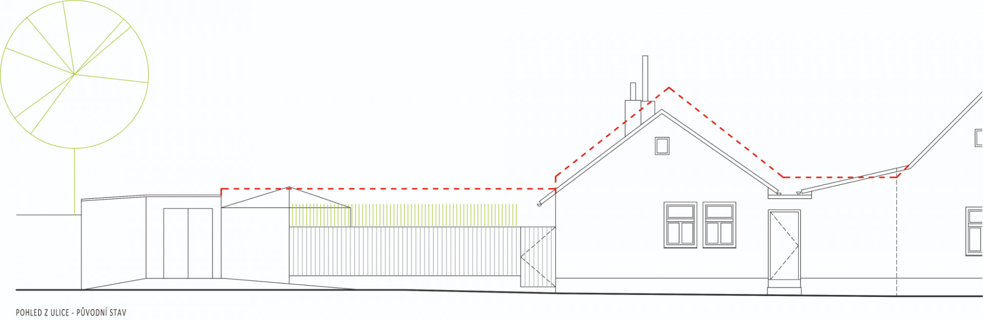 Původní část objektu architekti hmotově sjednotili a zjednodušili (přístavky jsou nově zastřešeny plochou střechou v jedné rovině). Šikmá střecha je opět pokryta plechem, ale nově v antracitové barvě (dříve byl červený), která odkazuje na někdejší použití černých asfaltových pásů jako krytiny u původních nouzových domků. Tehdy byla střešní krajina celé lokality různorodá, podtrhující „vlaštovčí hnízdo“, tak typické pro dané území. Celý původní objem byl zateplen minerální vatou a omítnut. „Dům stojí na dně lomu, takže střecha je v podstatě třetí fasádou – lidé, kteří jdou po hraně lomu, na střechu vidí, proto jsme ji řešili i pohledově. Materiálově i barevně jsme sjednotili vikýř a střešní okna s plechem střechy, proto jsme vybrali antracitový odstín,“ pokračuje Ing. arch. Radim Horák.