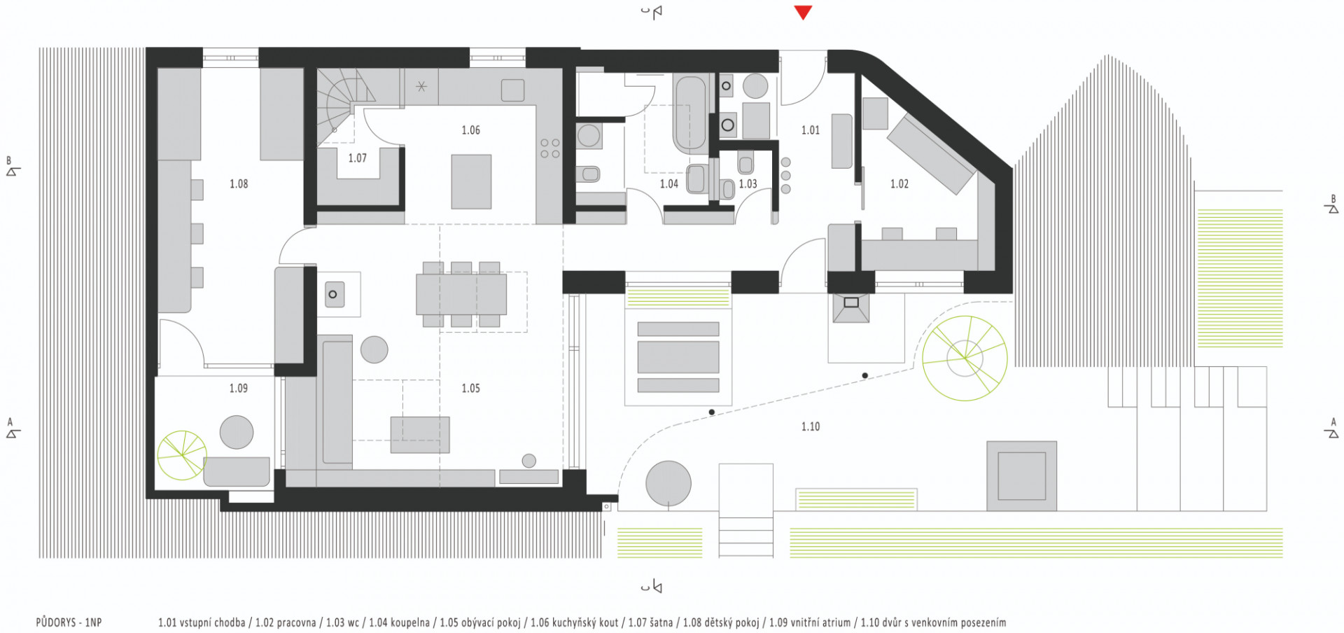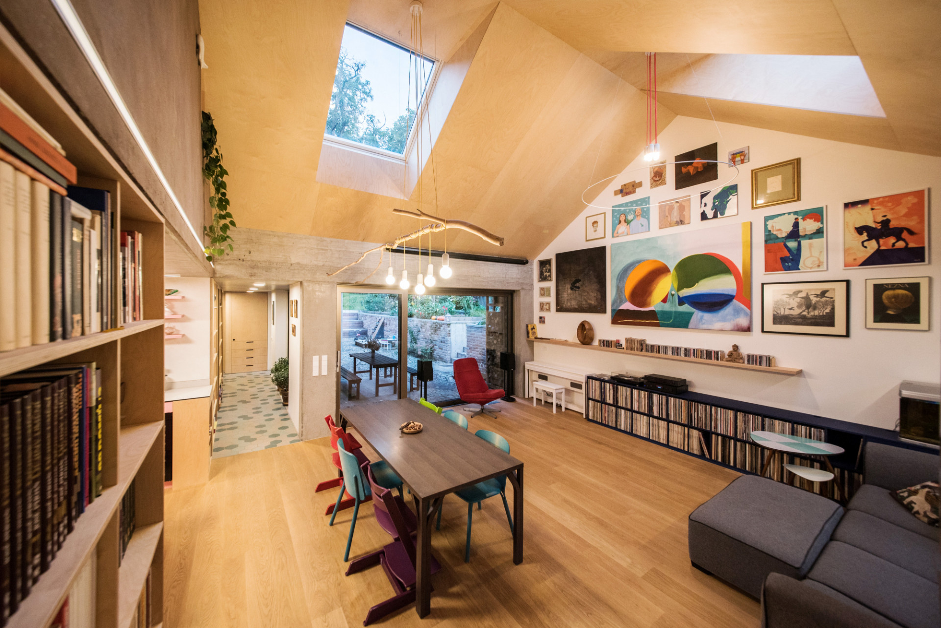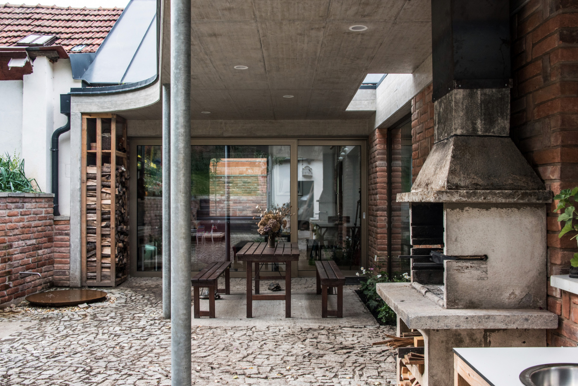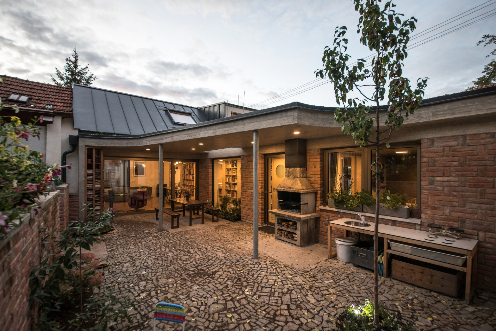 Na straně do dvora tvoří obvodovou část více skleněných ploch než neprůhledných zdí a přirozené světlo pustili do domu i střešními okny. V části pod sedlovou střechou v původním objektu je obývací pokoj s jídelním stolem. „Prostor je zcela otevřen do střechy a kromě rozsáhlé prosklené plochy z hliníkového HS portálu je prosvětlen i shora, dálkově ovladatelnými střešními okny, s vnitřním i vnějším zastíněním,“ popisuje Ing. arch. Radim Horák.