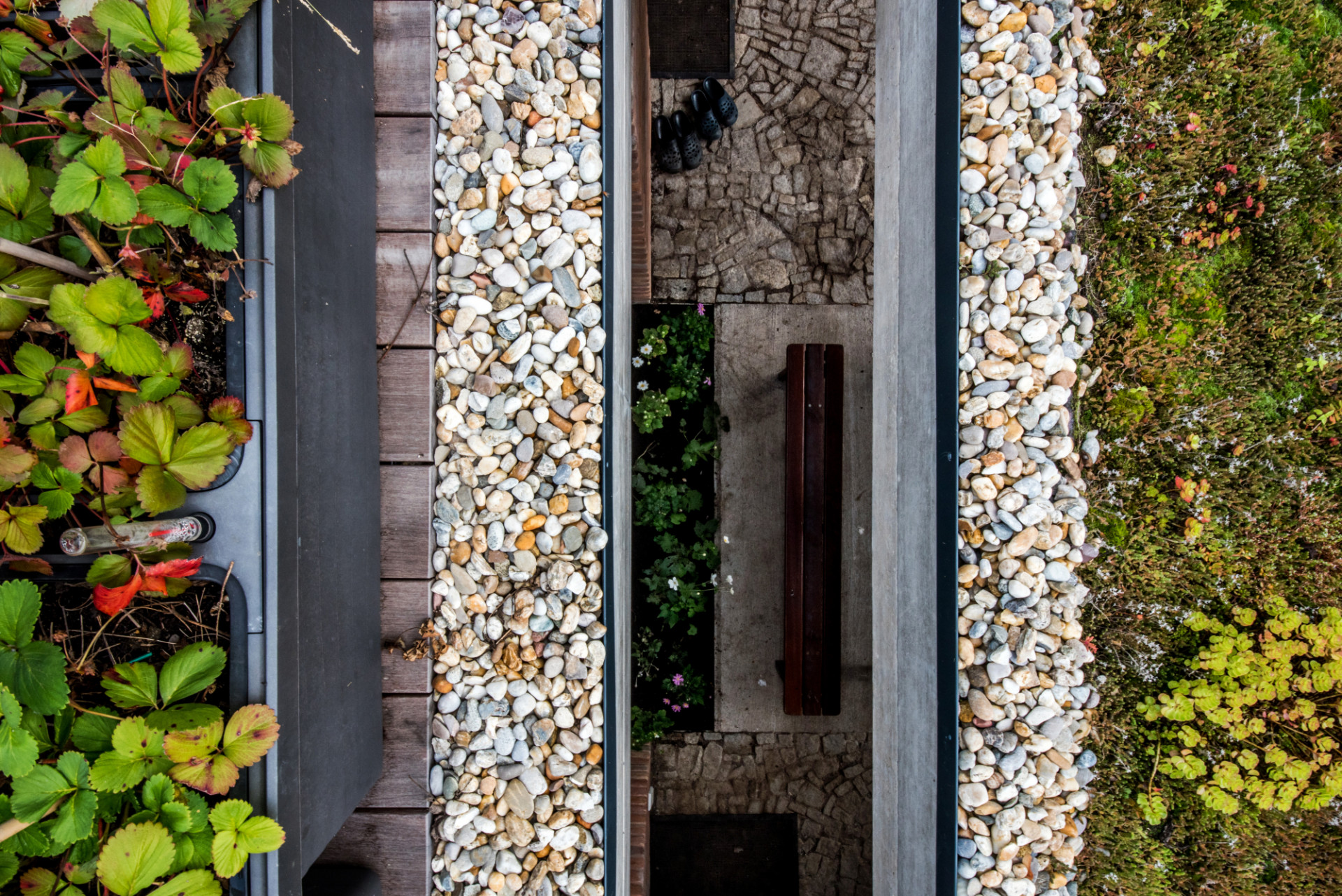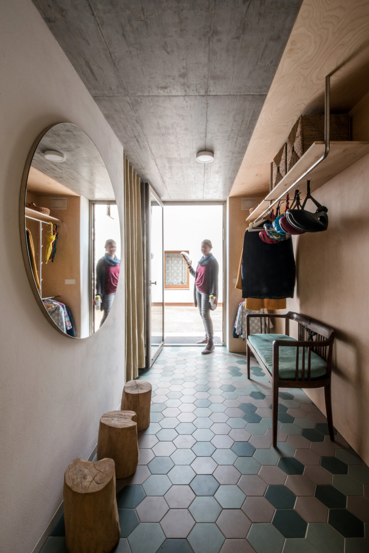 Dalším jednotícím prvkem v interiéru i exteriéru je kruh. „Kulaté prvky dojem změkčí, proto se v domě prvek kruhu opakuje - líbí se nám kulaté rohy nábytku, vana je zaoblená, zrcadlo ve vstupu má tvar kruhu, okénka ve dveřích koupelny a toalety jsou kulatá....,“ vypočítává Ing. arch. Radim Horák. Ostatně i venkovní přesah střešní terasy má oblý tvar (reaguje na strom), stejně jako vodní prvek.