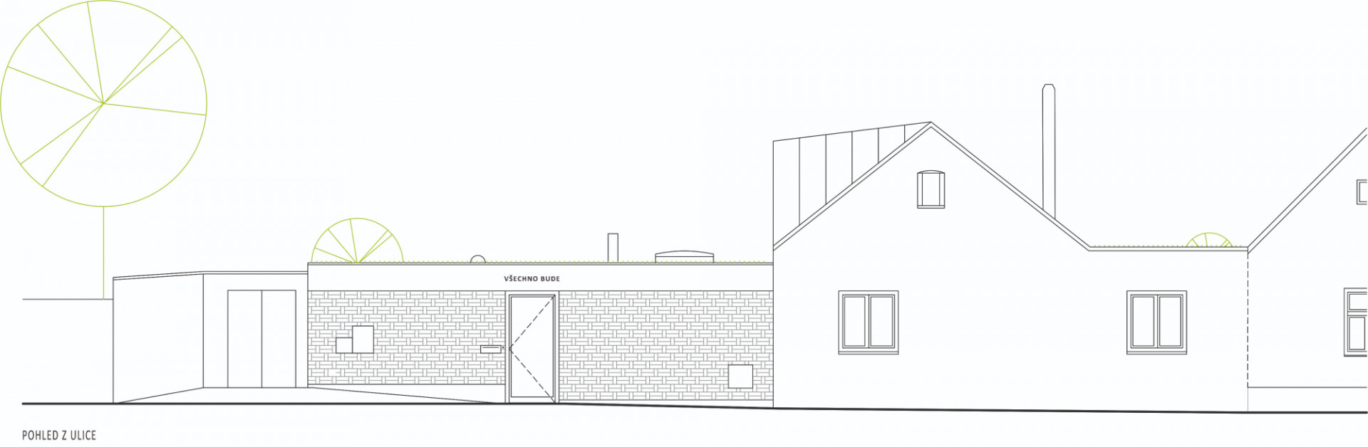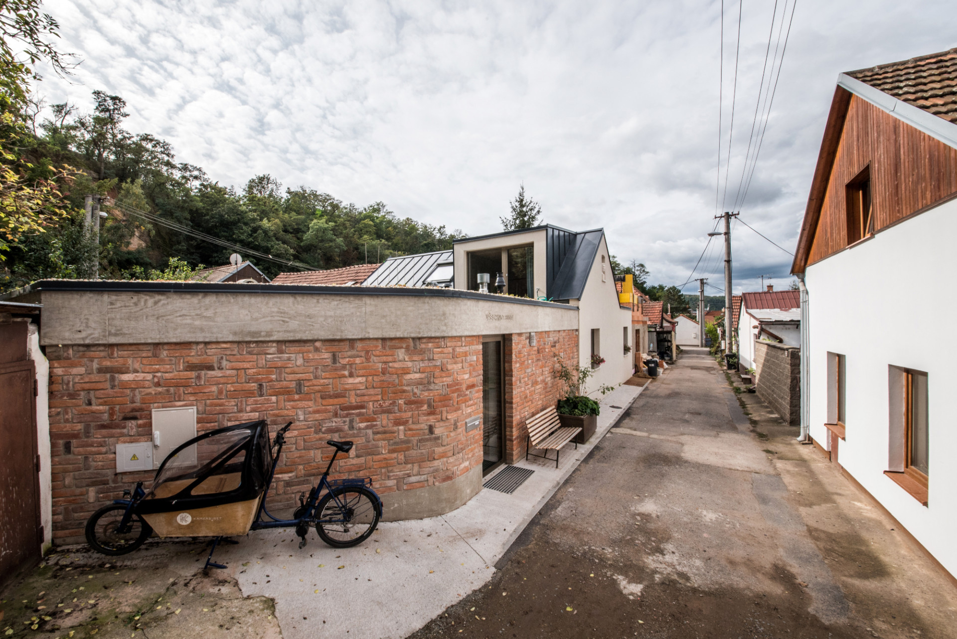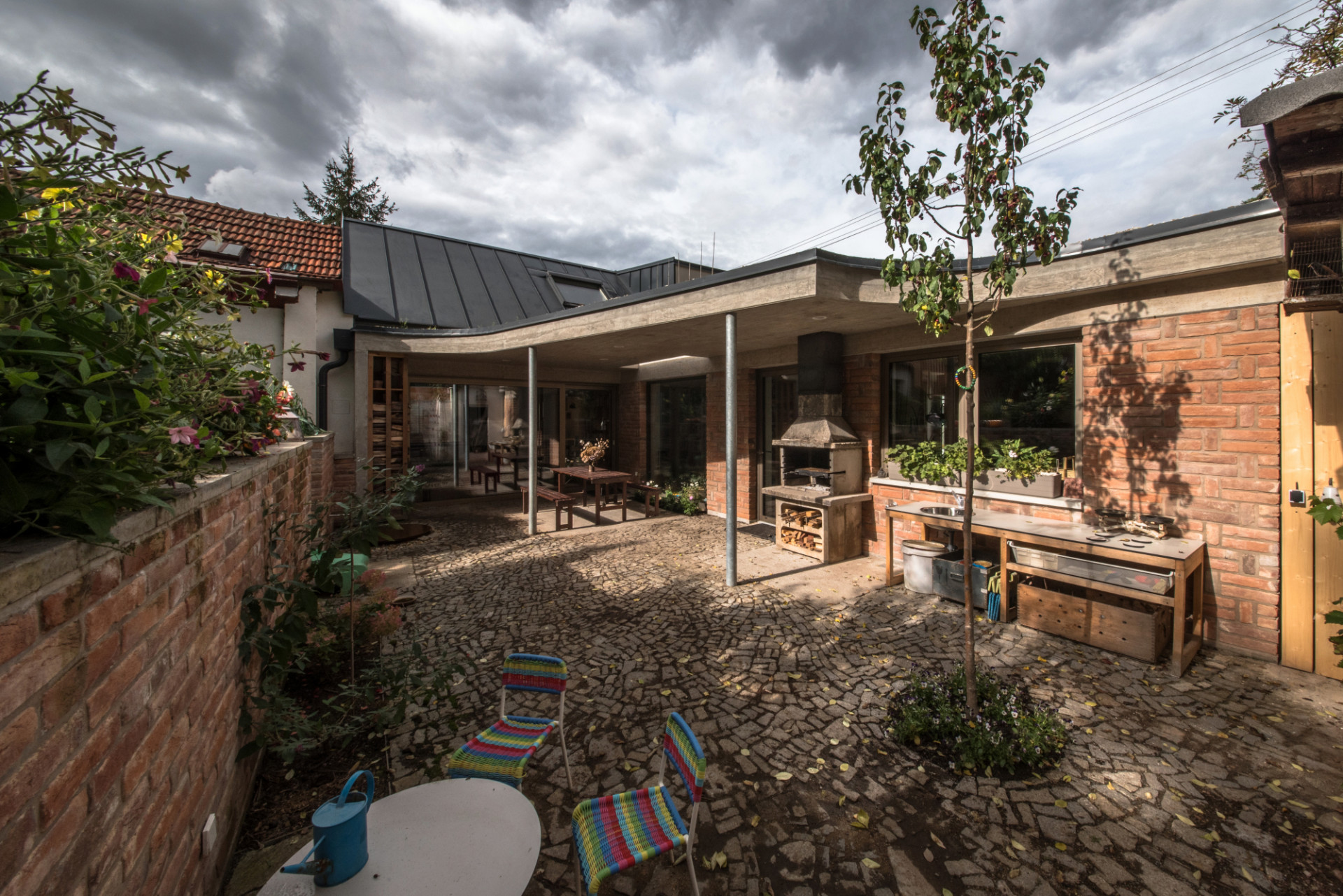 Nová přístavba je celá řešena s plochou střechou, stěny jsou sendvičové, kdy pohledové části do exteriéru tvoří vyzdívka z plných pálených cihel, získaných z bouracích prací na původním domě. Cihly mají odkazovat na někdejší obyvatele lokality, kteří byli často zaměstnanci nedalekých cihelen, z kterých si stavební materiál nosili. Cihly jsou doplněny o pohledové betony (sokl, atika), které vybíhají do dvora v jednoduché přestřešení nad venkovním sezením. Ploché střechy jsou pojaté jako zelené extenzivní, nad novou přístavbou doplněné o malou pobytovou terasu. Vnitřní zdivo, dozdívky apod. jsou z broušených keramických tvárnic.