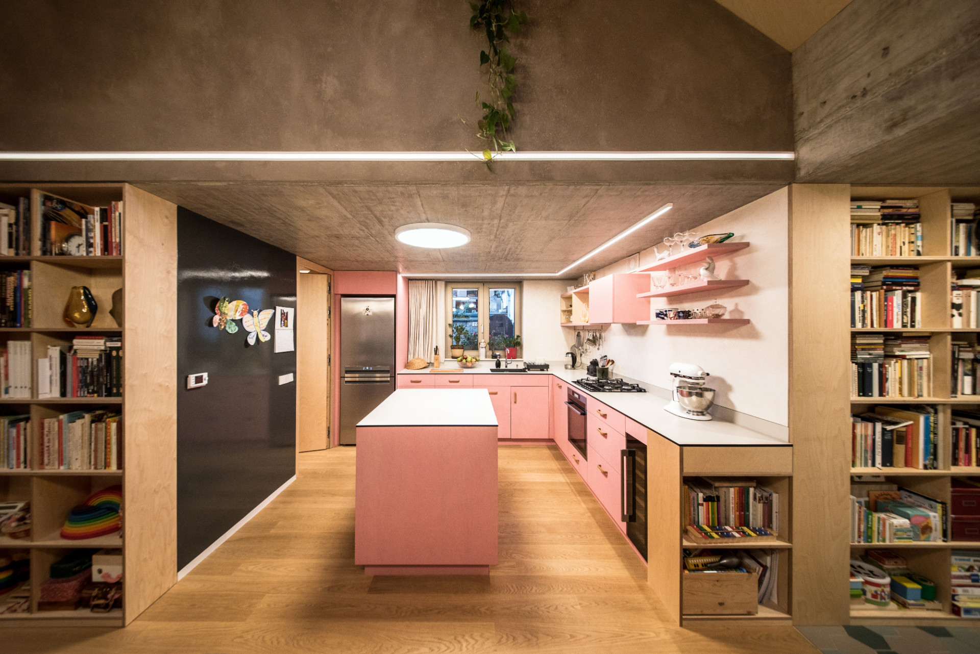 Růžová kuchyň má i chytrou stěnu pro děti i rodiče