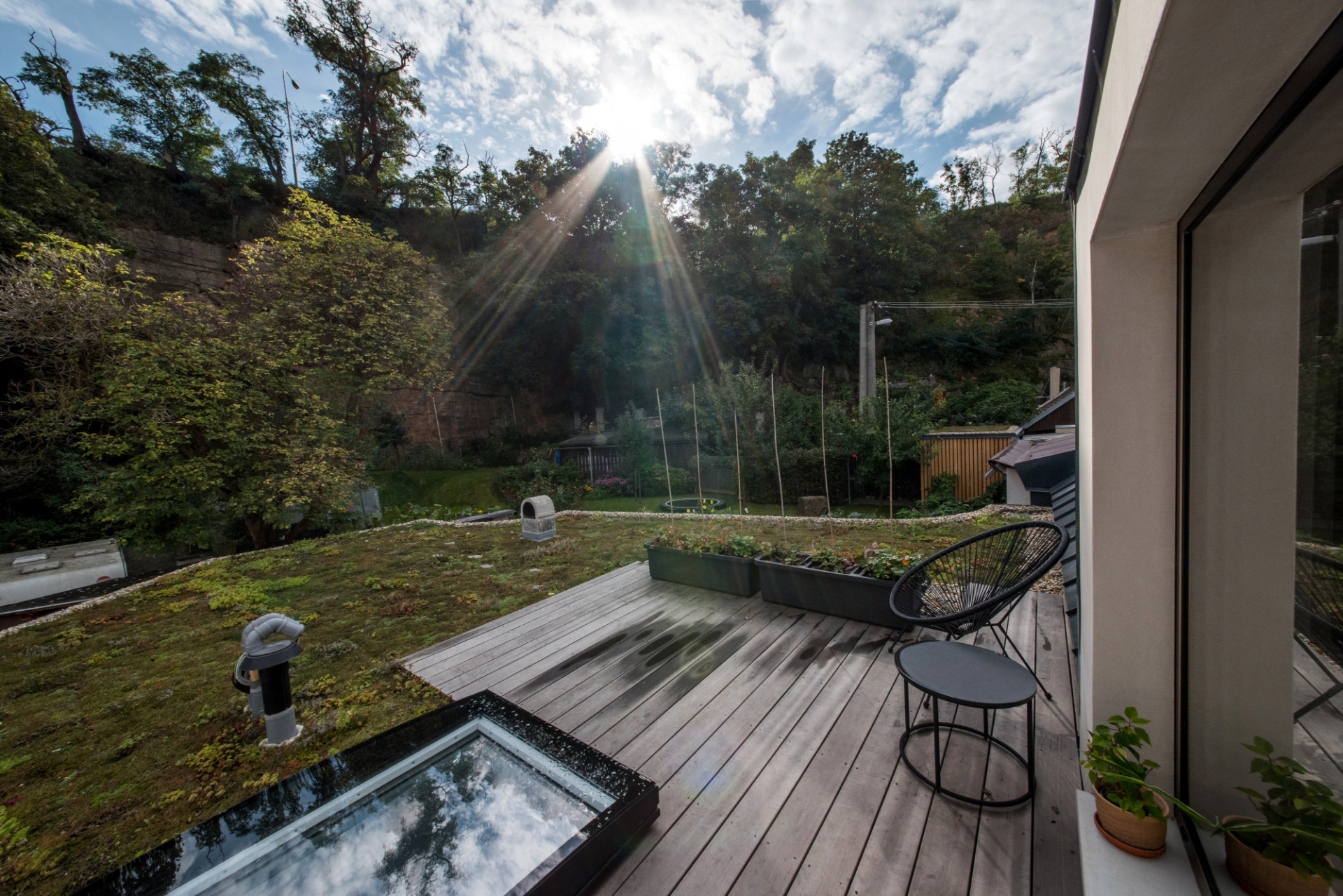 Prostřednictvím velkých prosklených ploch hliníkových oken (Schüco) nebo elektricky ovládaných střešních oken (VELUX) architekti pustili přirozené světlo do tmavého interiéru svého domku na dně lomu blízko skalní stěny. Architekti Radim a Hana Horákovi si bydlení nedaleko centra Brna a zároveň u řeky a lesa oblíbili, je to pro ně „taková vesnice ve městě“, rostoucí děti je však přiměly pustit se do rekonstrukce.