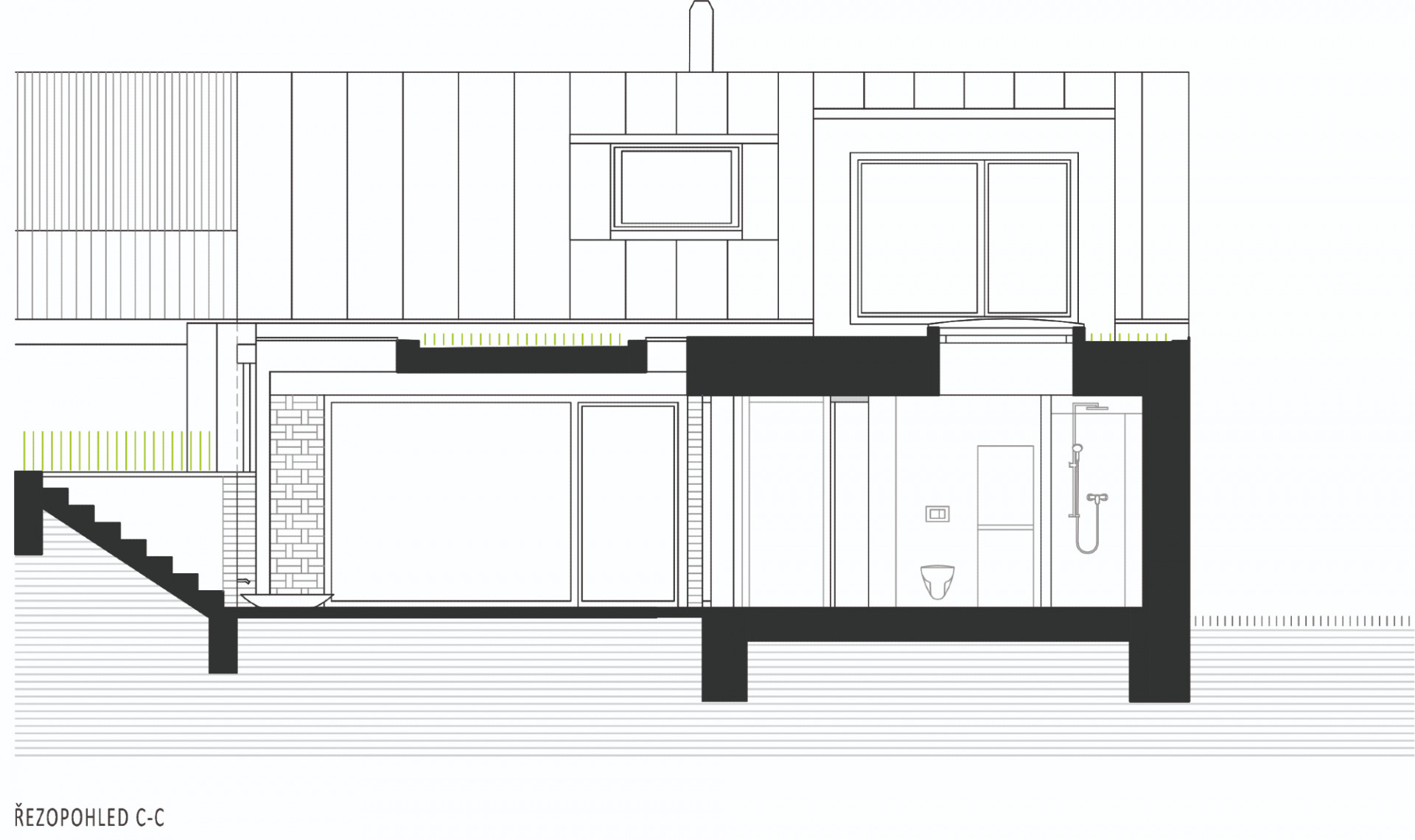 Vstup do domu byl přesunut do nové přístavby, která je navržena s co nejmenší konstrukční výškou (světlá výška uvnitř je jen 2.3 m a stropy jsou řešené jako pohledové železobetonové). Na vstup navazuje chodba, kterou lze projít domem do dvora, hned za dveřmi při vstupu je navržen technický kout, na druhé straně je za posuvnými dveřmi malá lichoběžníková pracovna (reaguje na tvar pozemku). Před dveřmi do dvora se chodba stáčí podél krytého venkovního sezení a míří do původního objektu, podél ní je navržena knihovna, ve které jsou umístěny dveře na samostatné wc a do koupelny. Ta je uvnitř prosvětlena střešním světlíkem, rovněž elektricky ovládaným (VELUX).