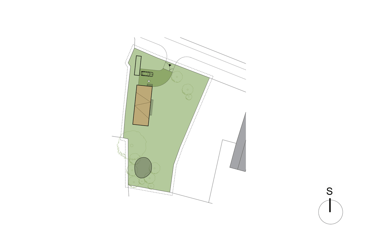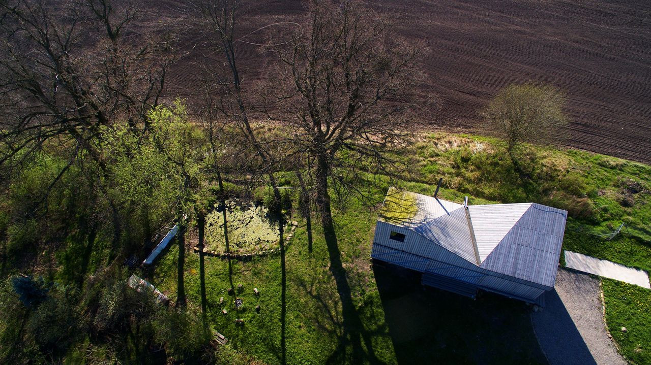 Objekt je navržen do stávajícího zastavitelného území malé obce ve východních Čechách. Nachází se na konci uliční řady a od otevřené krajiny jej odděluje jen několik vzrostlých stromů. Zadáním investora bylo vytvořit nízkoenergetickou dřevostavbu sloužící jako druhé bydlení pro tříčlennou rodinu. Vegetace, přírodní jezírko na zahradě i okolní vesnická zástavba pak vedly k návrhu jednoduchého objektu (prostoru) s variací na šikmé střechy. Především vzhledem k vysoké hladině spodní vody byl objekt odsazen od terénu a spočívá na kruhových pilířích z monolitického betonu. Provětrávaný prostor pod podlahou domu pak stavbu opticky odlehčuje. Materiálově dům nevyčnívá, splývá s okolím, neupozorňuje na sebe, poskytuje příjemné prostředí svým obyvatelům i dětem. Objekt je na pozemku usazen citlivě a s okolím komunikuje prostřednictvím velkoryse pojatých prosklených ploch a díky terase, která prochází od vchodu podél celého domu až na druhý konec stavby.
