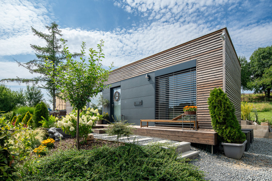 Plášť objektu je tvořen polyuretanovými panely tl. 100mm, kotveným k ocelovému rastru. Povrch panelů je z plechu v barevné úpravě s jemným prolamováním, zvoleným zejména kvůli větší tuhosti a odolnosti vůči poškození. Jednotlivé panely jsou k sobě spojovány zámky, které představují určité slabé místo v tepelně-izolačním plášti, z tohoto důvodu je navržena doplňková tepelná izolace ze strany interiéru, která zlepšuje tepelně-izolační vlastnosti domu a eliminuje slabší místa v zámkových spojích. Jelikož je objekt posazen na patkách, je dostatečně izolován i zespodu. Asi největším problémem v tepelné obálce budovy byly od samého počátku ocelové patky, které tvoří stavbě podpory a bylo třeba je ochránit. Patka je proto navržena z trubky vsazené mezi dvojici patních plechů, umožňující vyplnění její dutiny izolační PUR pěnou a obalení izolací tak, aby byly eliminovány veškeré tepelné mosty.