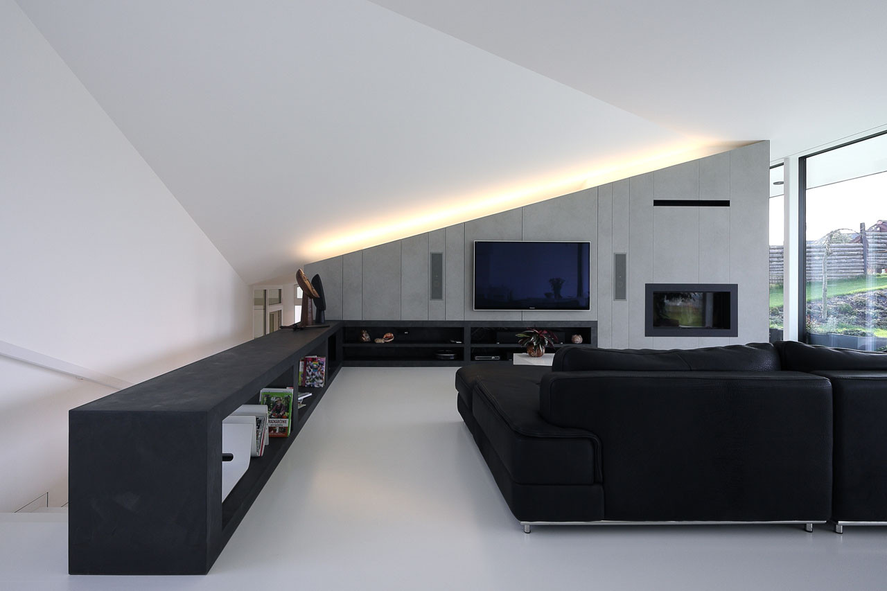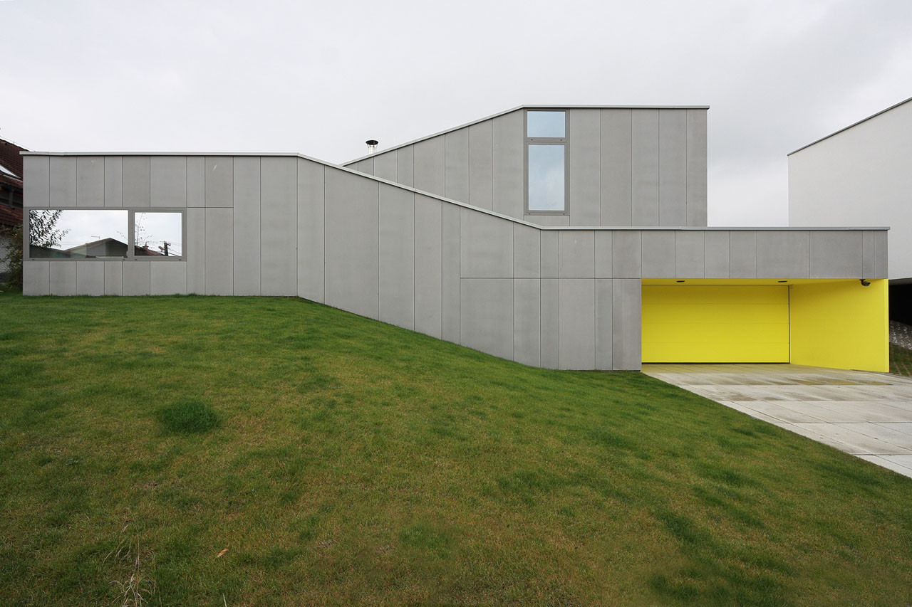 Minimalistická budova stojící v malé slovenské vesničce Kynceľová působí směrem do ulice velmi uzavřeně, neboť dominují šedé sklocementové desky přerušené jen několika okny. Pouze žlutě omítnutý výřez garáže naznačuje něco o vnitřním životě domu. Architekti používají tuto signální barvu i v obytných prostorách a spolu s víceúrovňovým členěním vytvářejí napínavý dojem z interiéru. Směrem do zahrady se jinak nepřístupně působící dům otevírá velkými francouzskými okny lemovanými průběžným rámem a přesahem střechy. Z garáže vedou schody do mezaninu, kde je pokoj pro hosty s odděleným vstupem. V horním patře se nachází velký obývací a jídelní prostor, luxusní koupelna a ložnice.