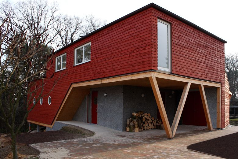 Jedná se o dvoupodlažní nízkoenergetickou tesařsky na místě postavenou dřevostavbu, která je jakoby nabalená na zděném akumulačním jádru nosných zdí kolem obytného prostoru v přízemí. Usazení dřevostavby na zděném jádru vytváří v exteriéru i interiéru přiznanou dynamickou terasovitou postupně ustupující kompozici hmot připomínající lodní palubu. Hlavním hmotovým a konstrukčním prvkem domu je výrazné sochařsky řešené tvarování přiznaných nosných konstrukcí na fasádě i interiéru, které jsou navržené s ohledem na celkový výraz a siluetu domu. Ta je doslova podtržena křivkou hlavní nosné dřevěné římsy probíhající v různých výškách kolem celého půdorysu domu. Kolem ložnice rodičů ve snížené zadní části domu prochází v úrovni dřevěné podlahy přízemí na pilotech díky snížení pozemku cca 1 metr nad zemí. V prostoru zastřešeného vstupu pod vykonzolovaným prvním patrem přechází v přiznané šikmině jednoramenného schodiště do úrovně stropu – podlahy patra, a v této úrovni pokračuje na zastřešené automobilové stání, pergolu a obytnou terasu, kde je podepřená staticky prostorově tuhými šikmými sloupy do V.