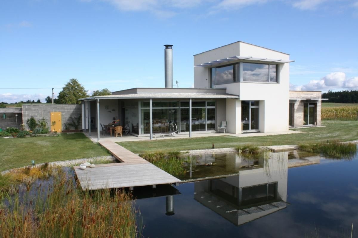 Dva na sebe kolmé kubusy vytváří chráněný vstupní parter a vjezdy do garáží, k nimž se vine od brány příjezdová cesta ze starých dřevěných pražců lemovaných kamennými dlažebními kostkami. Hmota garáže je ze severozápadu zasypána terénním valem, který byl navršen z vytěžené zeminy a který přechází ve vegetační střechu. Do terénního valu je vsazen sklep pro skladování vína, ovoce a zeleniny. Obytný blok je na jihozápadě řešen výrazným celoplošným prosklením, které vtahuje okolí domu do interiéru a opticky jej zvětšuje. Tohoto je využito při dimenzování vnitřního obytného prostoru, který je relativně skromný. Venkovní terasu kryje před horkým letním sluncem předsazené loubí, jehož paluba přechází formou dřevěného mola do nově vytvořeného rybníka s vnitřní koupací zónou. Tato vodní plocha v bezprostřední blízkosti jižní fasády tvoří výrazný vizuální prvek, jehož je druhotně využito pro rozptyl slunečních paprsků dovnitř dispozice. Nový biotop přinesl do jinak poměrně obyčejného a jednotvárného pole vodní svět s jeho pestrými formami v podobě ryb, plazů, obojživelníků, vodního ptactva a celé škály vodních rostlin.