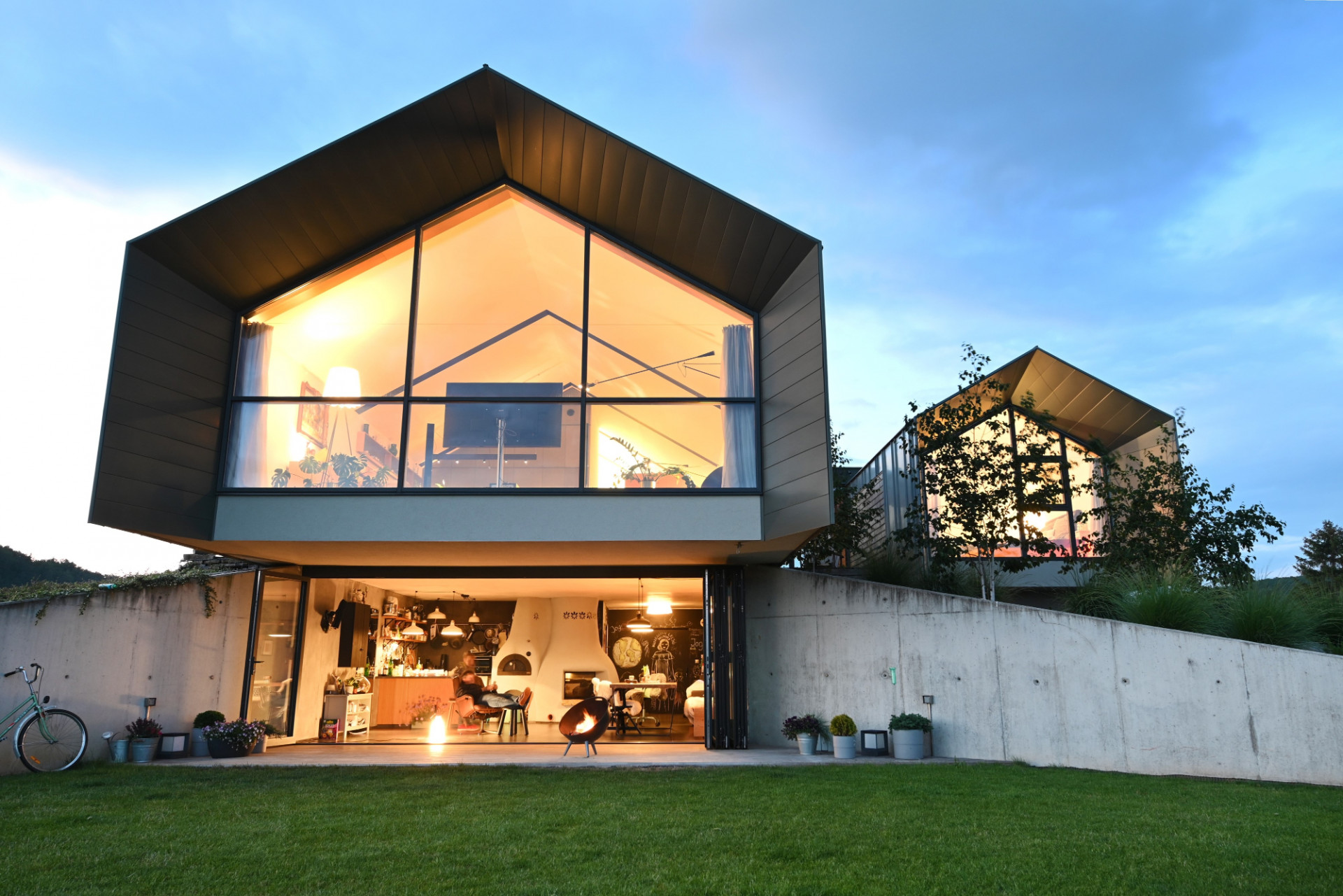 „Celkovou podobu pak ovlivnila i rodinná situace investora – ten jako svobodný bezdětný muž původně zvažoval pouze jeden dům pro sebe, ale nakonec jsme se dohodli, že uděláme vedle něj i druhý. A vyplatilo se – dnes se ten menší, vedle stojící domek, který je prosklenou chodbou spojen s hlavní stavbou, stal oblíbeným prostorem dětí z blízké rodiny, které ho často navštěvují a využívají na rodinné oslavy a setkání," pokračuje autor.