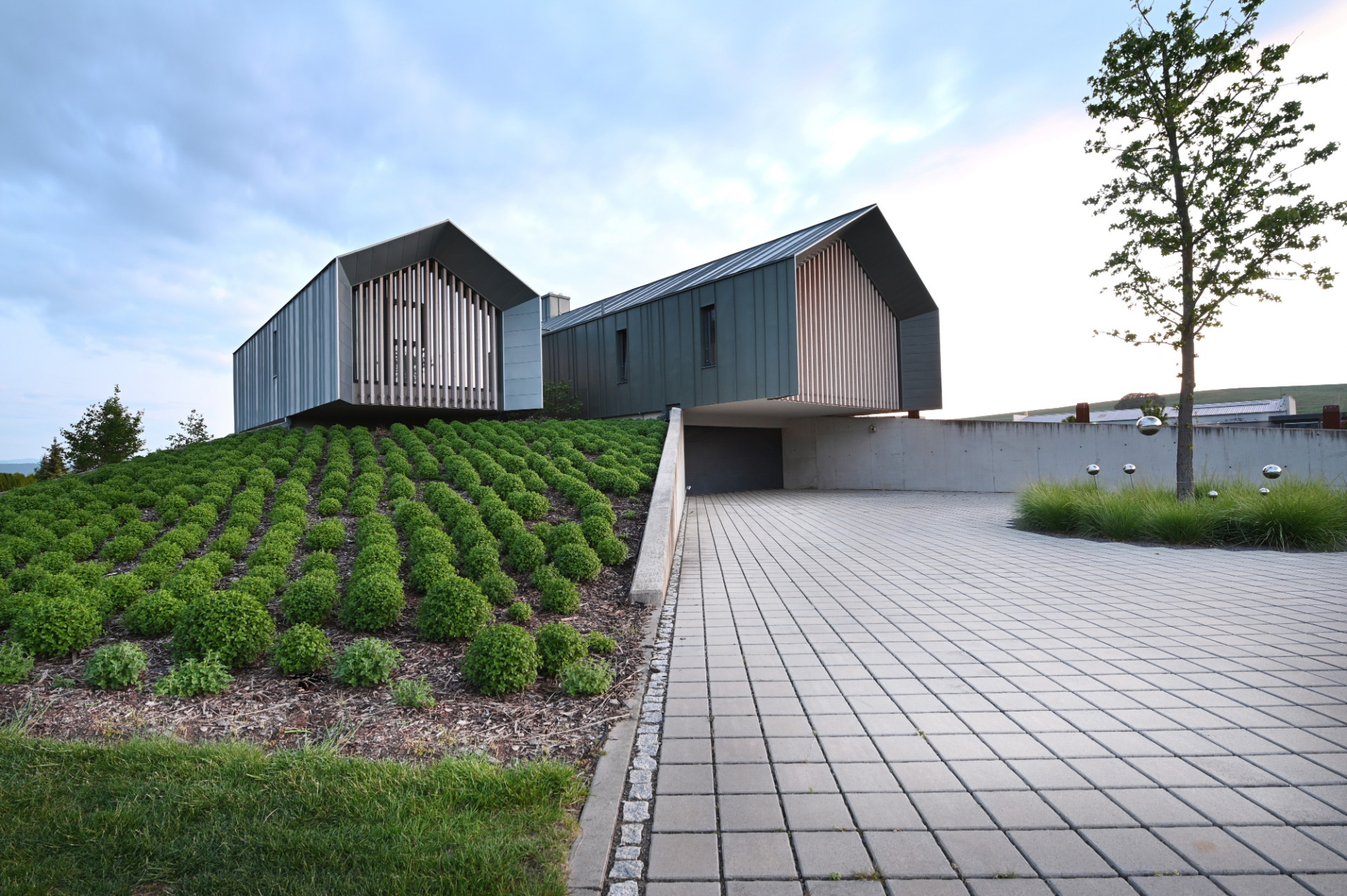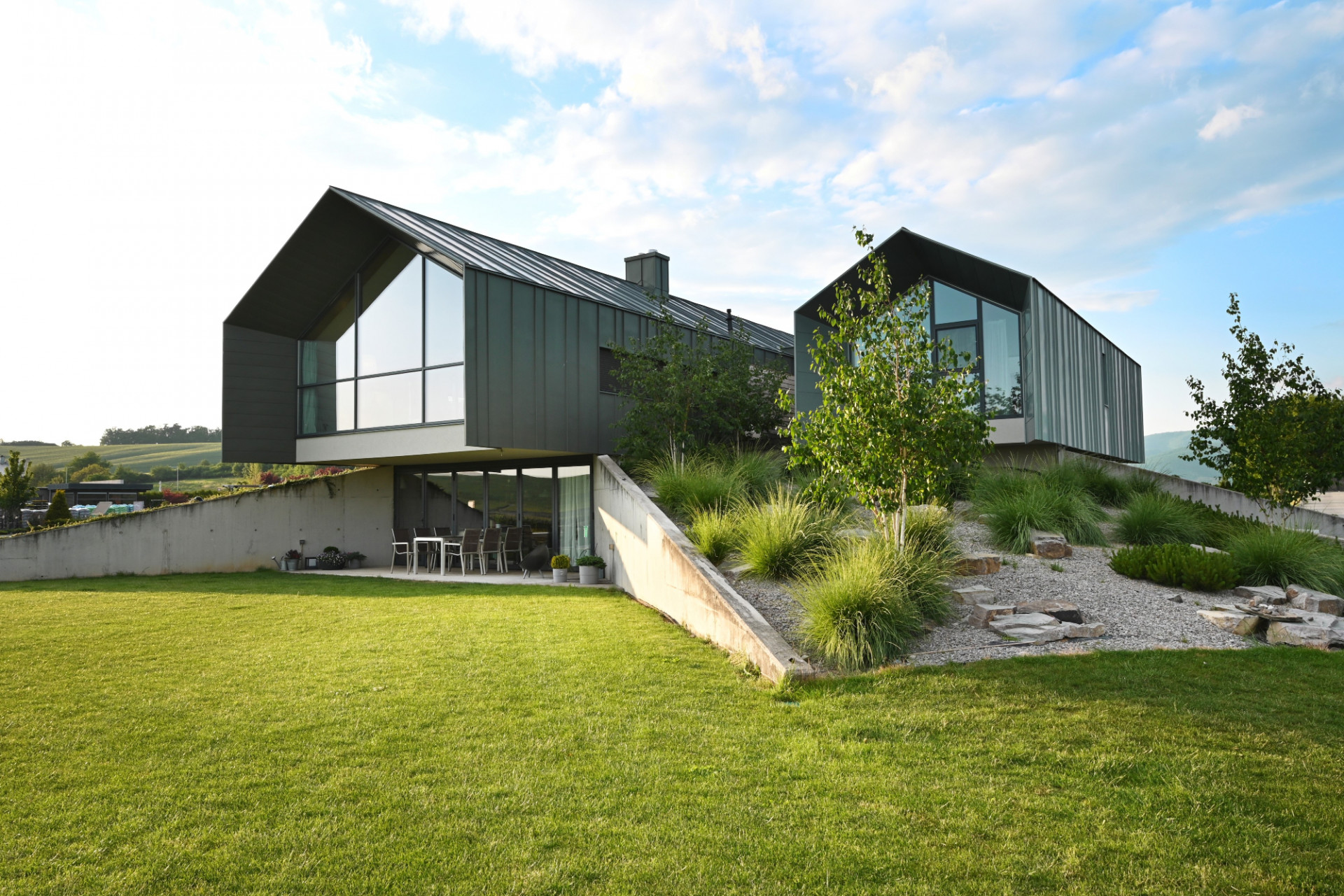 Na okraji slovenské obce Skačany, kterou obklopují pole a louky, vyrostl před dvěma lety nepřehlédnutelný rodinný dům. Architekt Marián Minarovič ho pojal jako dvě propojené moderní stodoly usazené na uměle vytvořeném pahorku.