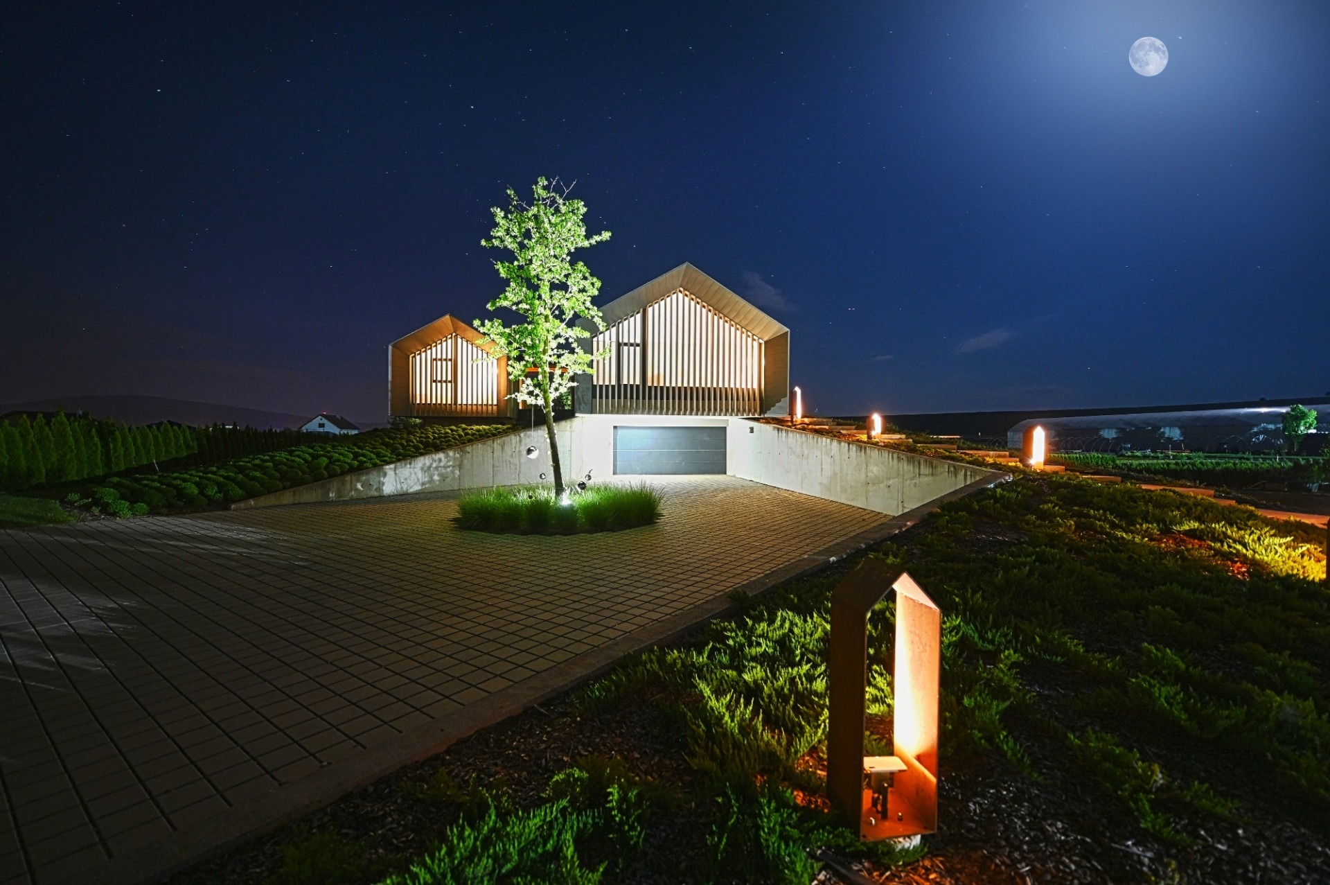 „Tak jsme to museli celé překopat, a proto obytná část domu stojí na uměle vytvořeném vršku, ukrývajícím hospodářskou část. V přízemí je hobby prostor, kde člověk může být v přímém kontaktu s exteriérem, horní podlaží zase poskytuje pěkný výhled a maximální komfort. To zvednutí domu pak dalo ráz i siluetě – bylo jasné, že dům bude jako solitér zeširoka-daleka viditelný, a proto jsem dal přednost tvaru stodoly, která je pro tuto zemědělský orientovanou oblast typická,“ přibližuje okolnosti návrhu architekt Marián Minarovič.