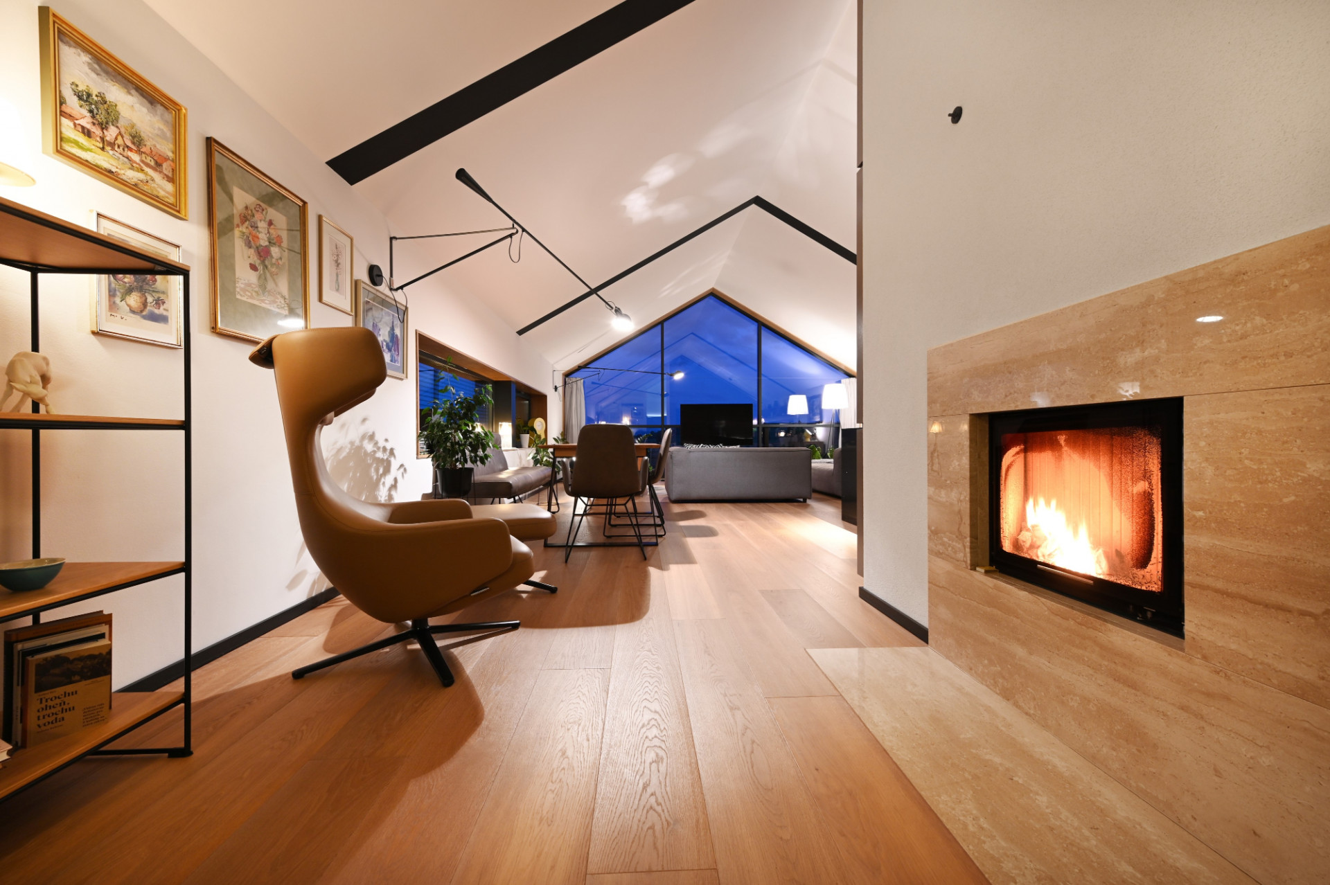 Spolu s obývacím pokojem, jídelnou a kuchyní tvoří otevřený velký prostor, umocněný vysokým šikmým podhledem a prosklenou štítovou fasádou, která umožňuje ničím nerušené výhledy do okolní krajiny.
