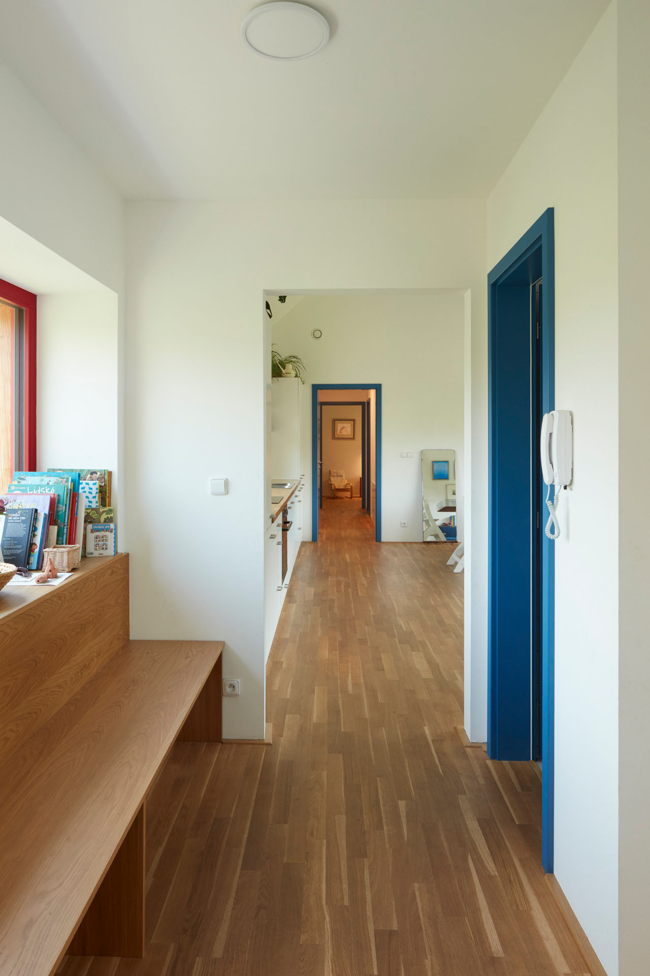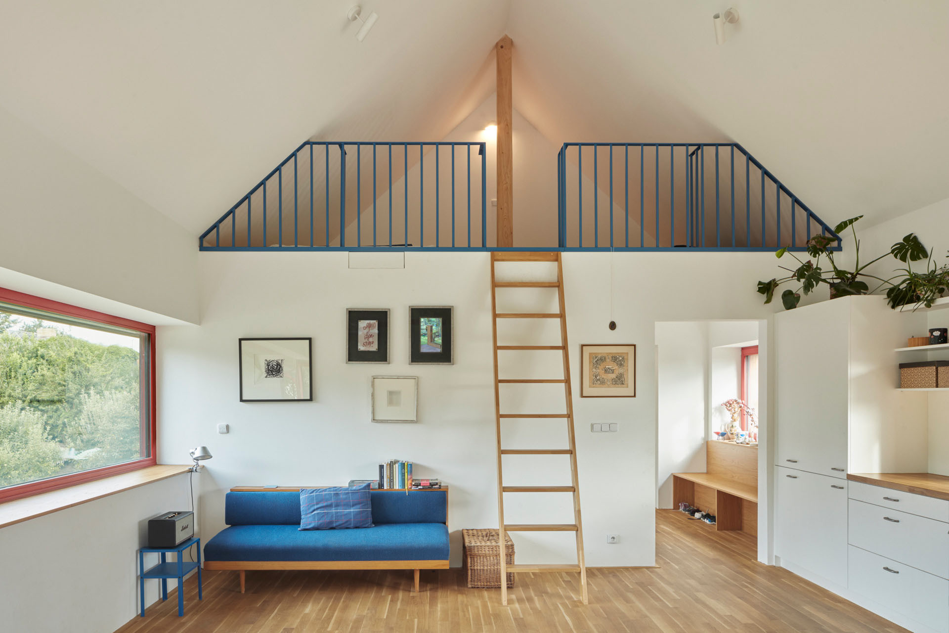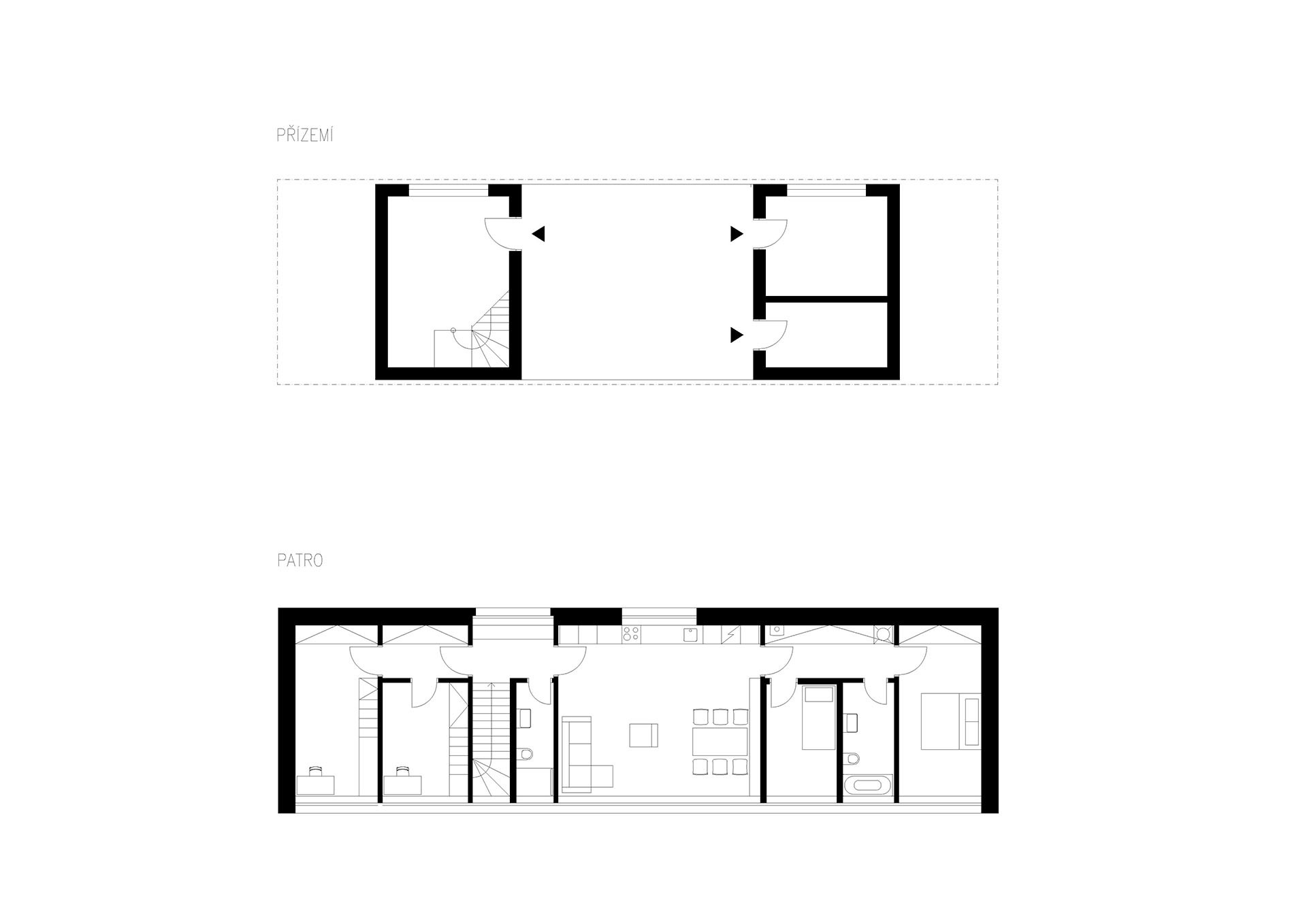 Dvě betonové podstavy, dvě „nohy“ v přízemním patře slouží jako vstupní hala se schodištěm a šatnou, a druhá obsahuje pracovnu a sklad. Když vyjdete po schodišti do prvního patra, ocitnete se v chodbě, která propojuje čtyři pokoje, obytnou místnost a dvě koupelny. A co je umístěno mezi vstupními kvádry v exteriéru? Nachází se zde krytý průchod, který funguje jako zastřešené stinné místo pro letní posezení.