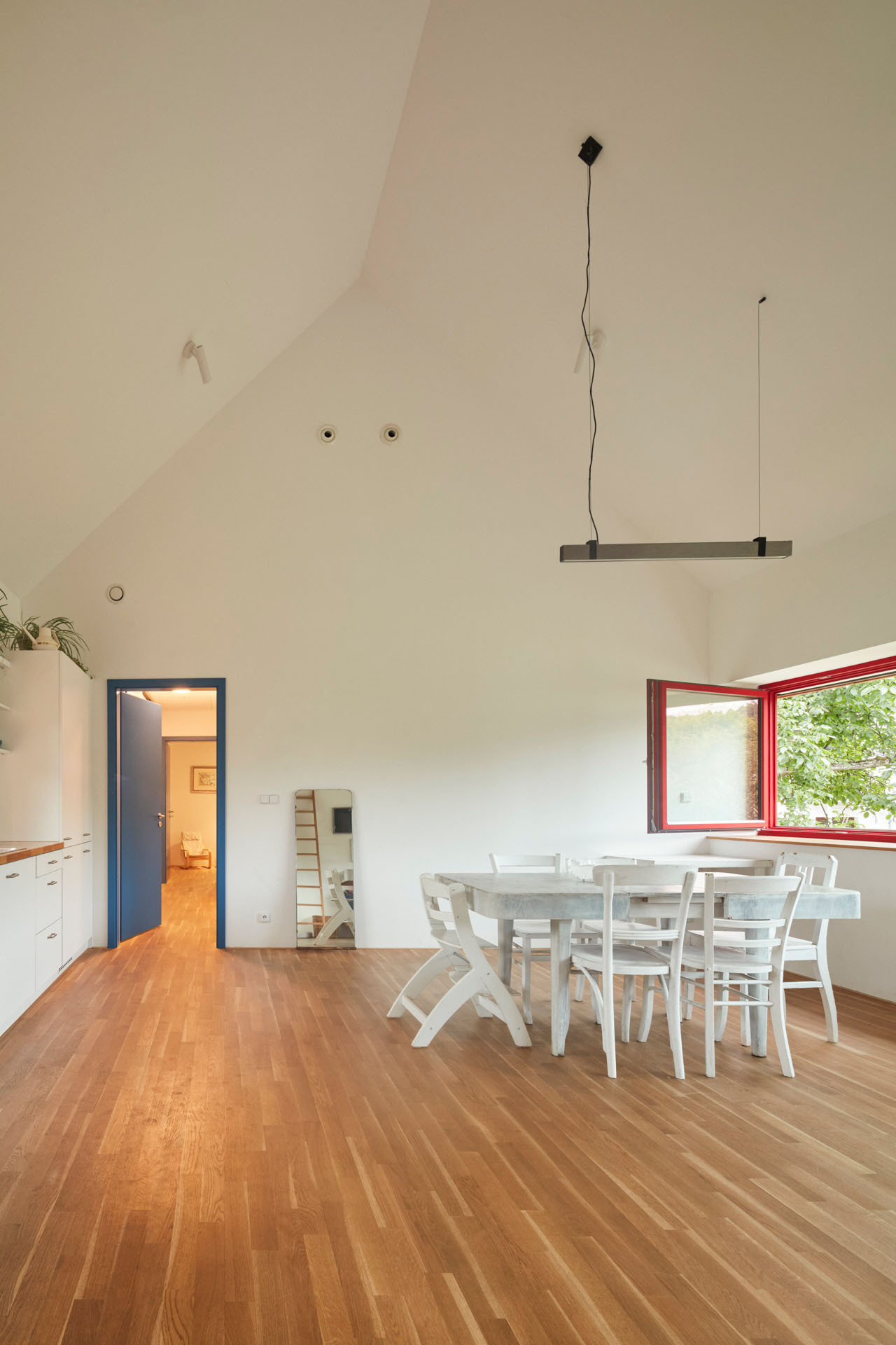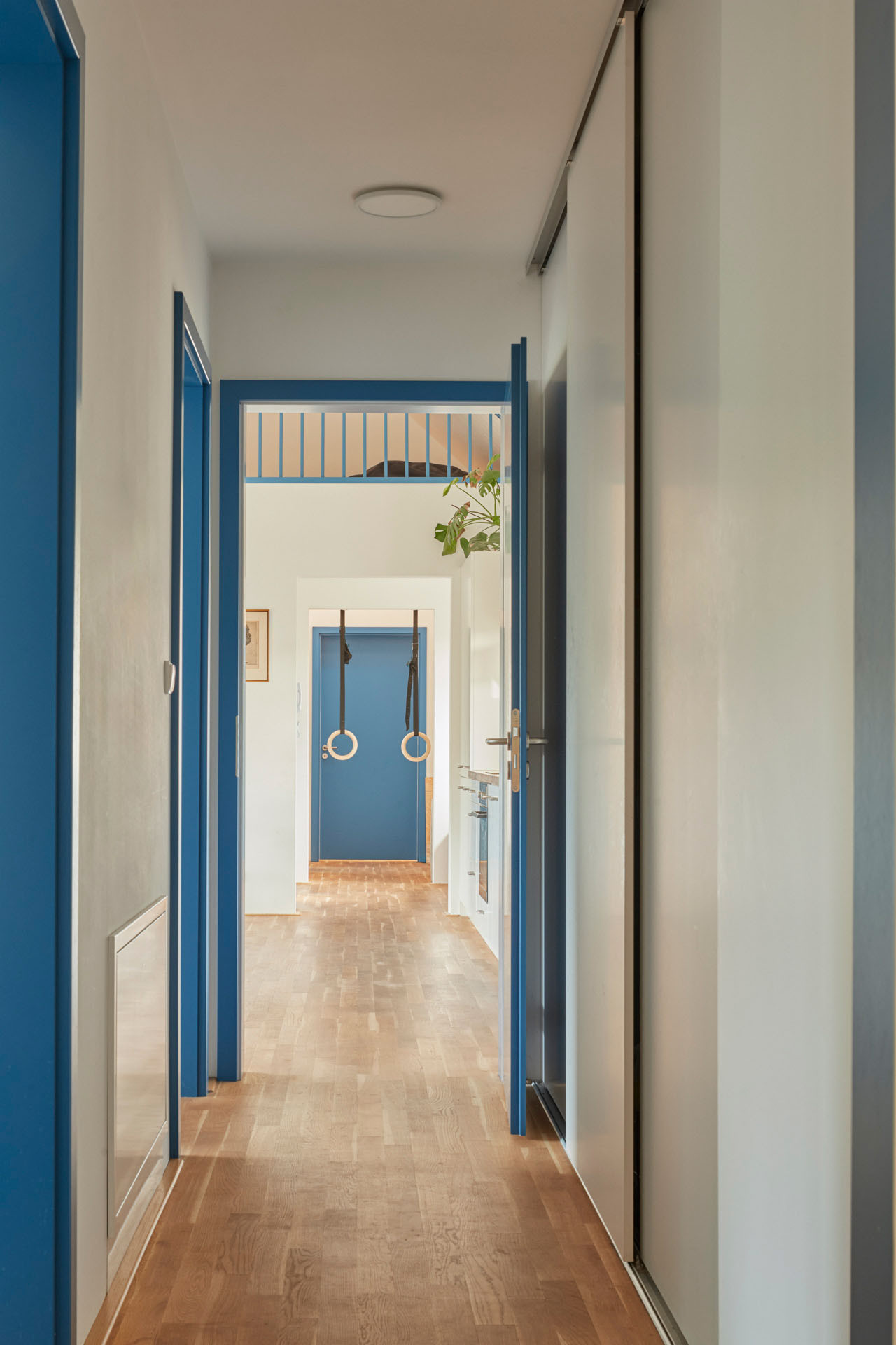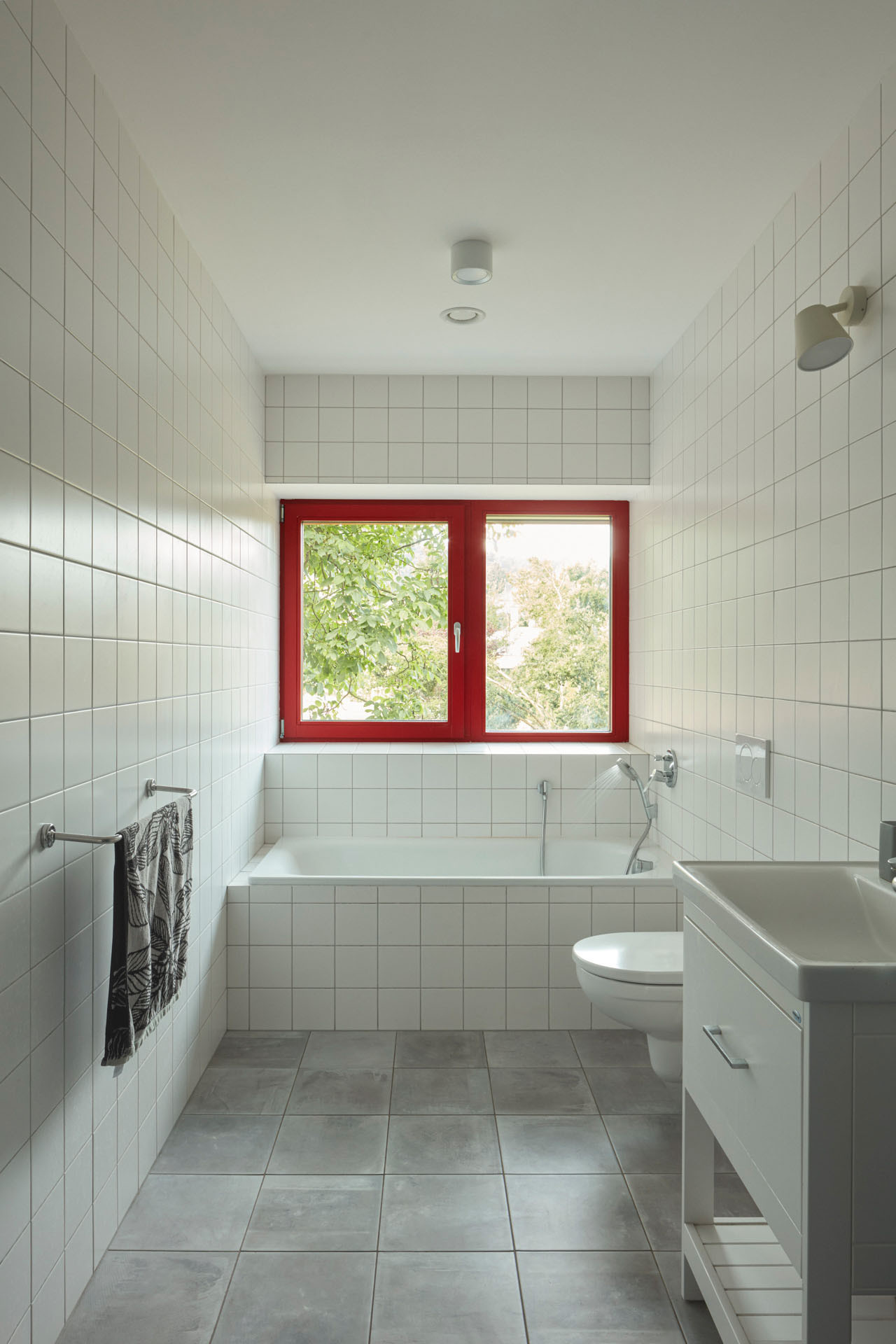 Dvě betonové podstavy, dvě „nohy“ v přízemním patře slouží jako vstupní hala se schodištěm a šatnou, a druhá obsahuje pracovnu a sklad. Když vyjdete po schodišti do prvního patra, ocitnete se v chodbě, která propojuje čtyři pokoje, obytnou místnost a dvě koupelny. A co je umístěno mezi vstupními kvádry v exteriéru? Nachází se zde krytý průchod, který funguje jako zastřešené stinné místo pro letní posezení.