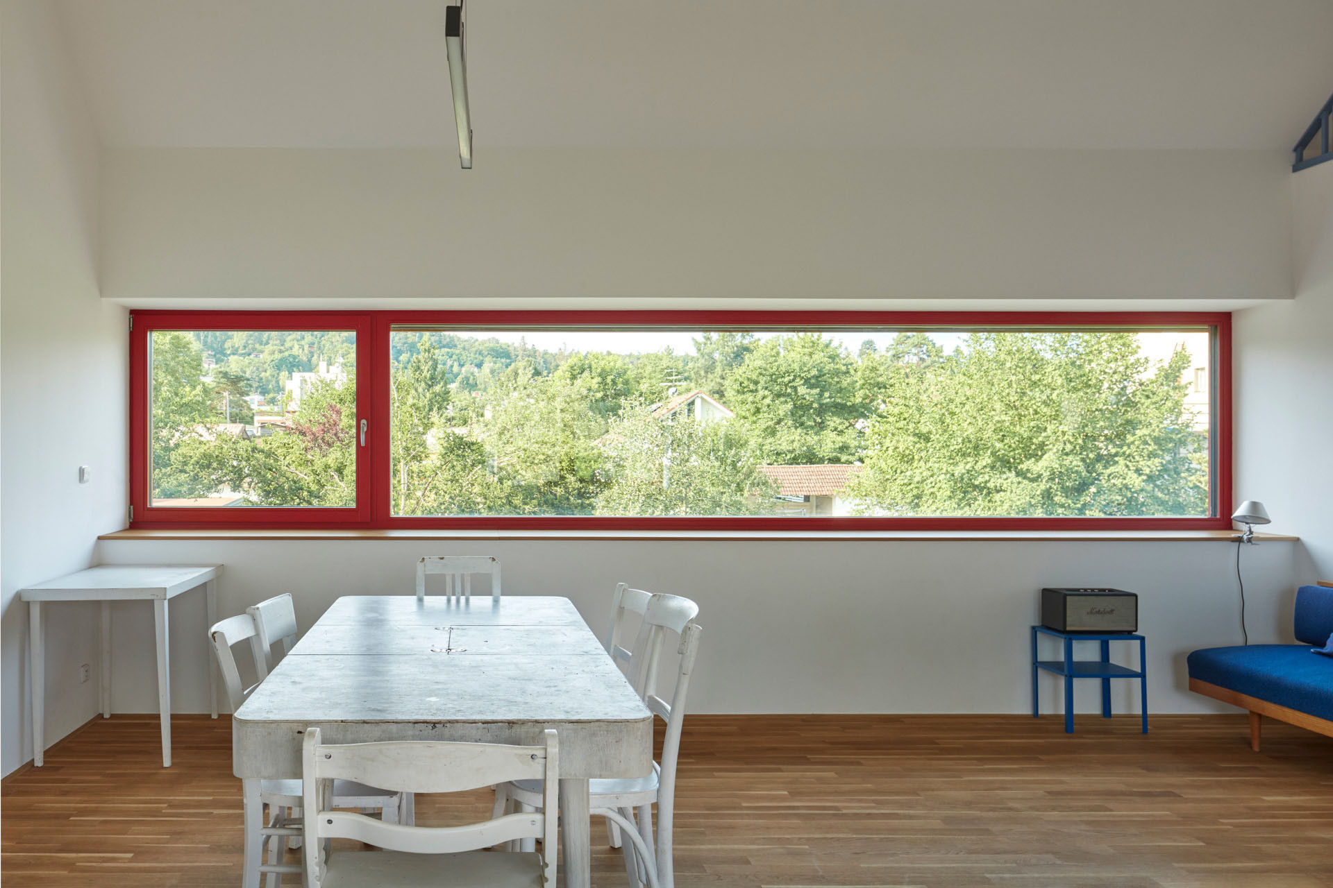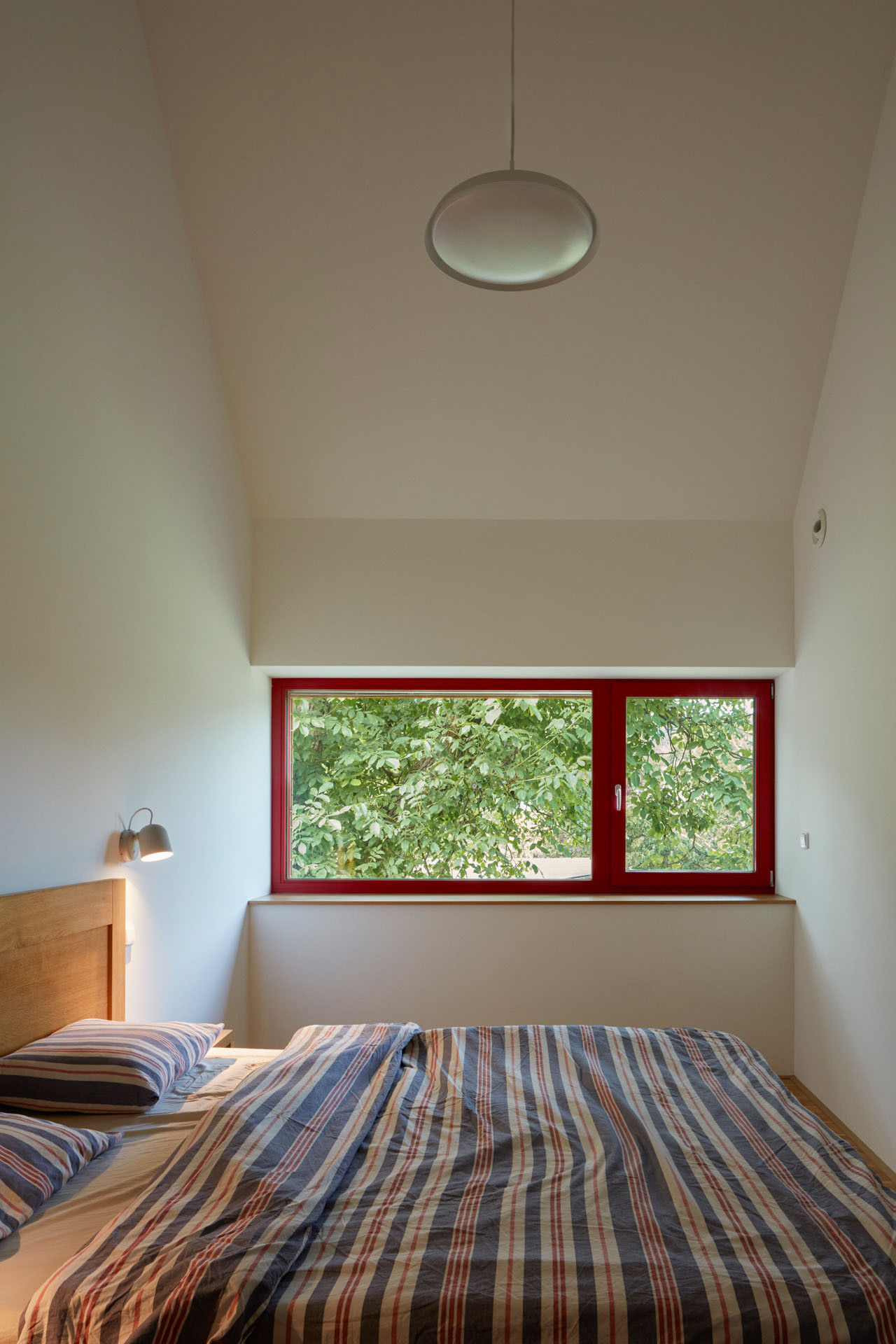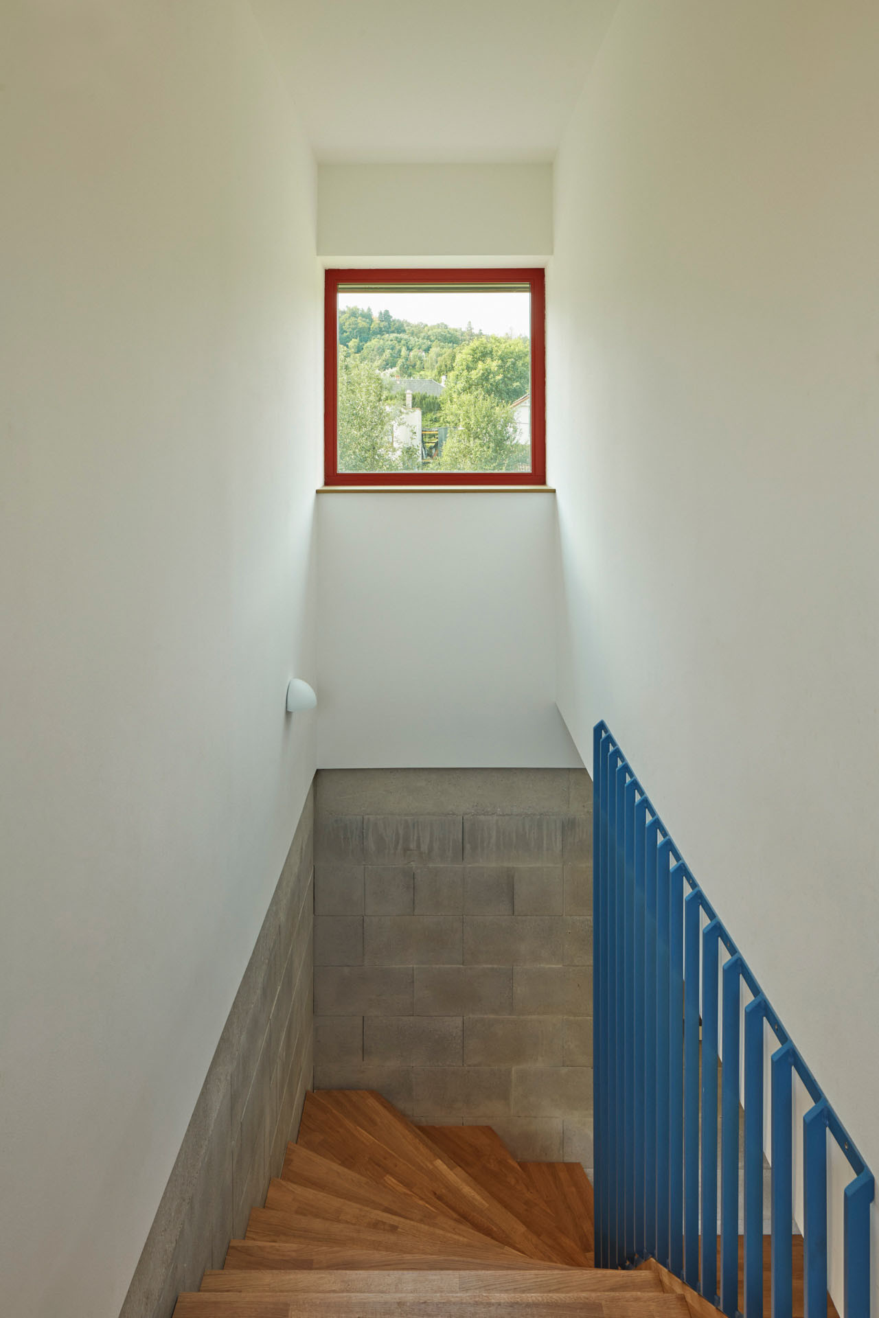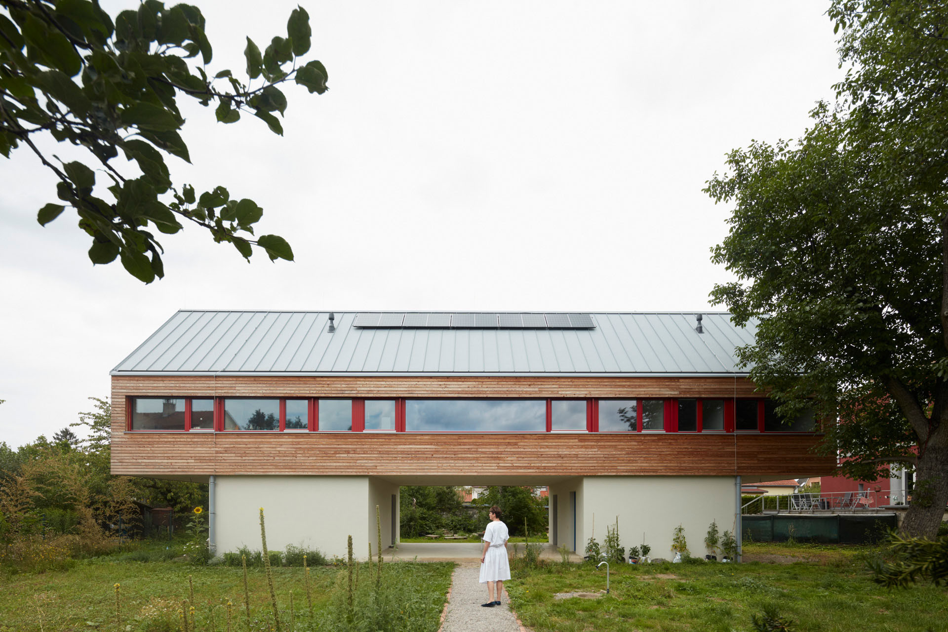 Když si odmyslíme dvě betonové „nohy“, tak vypadá rodinný dům poměrně tradičně. Sedlová střecha a horizontální dřevěný obklad ladí s okolní zástavbou a krajinou Řevnic. Novostavba je charakteristická především svojí jasnou dramaturgií objemů, symetrická hmota posazená na dvou identických kvádrech. Ale také barevností rámů oken, architekti zvolili výraznou červenou a světle modrou.