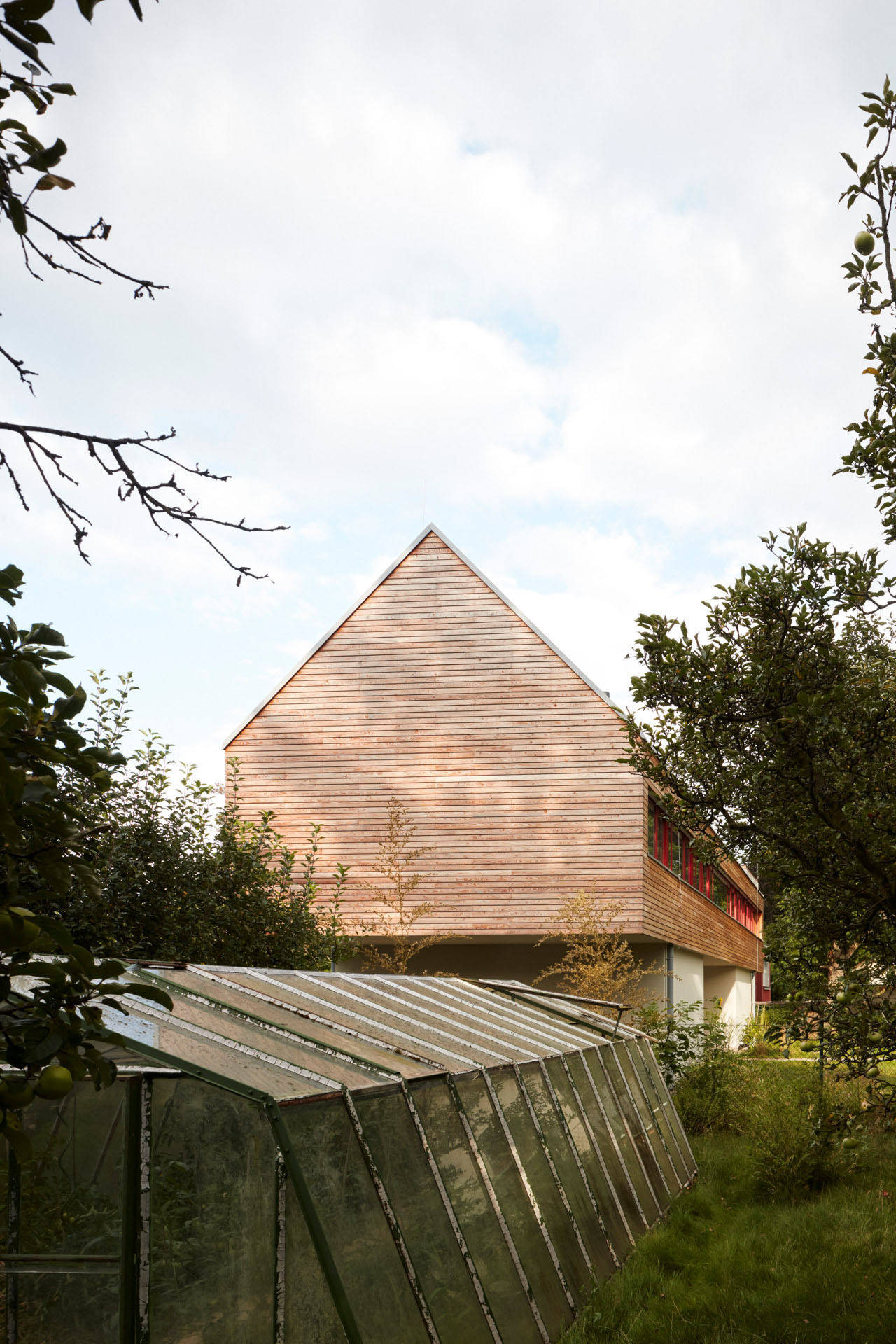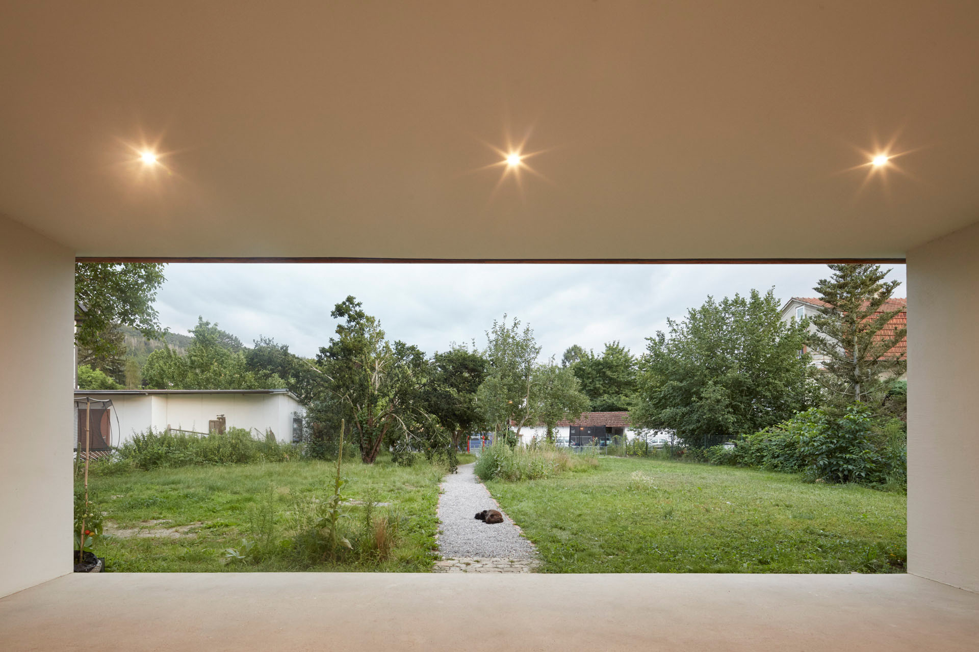 Zahrada domu je natolik rozsáhlá, že se do ní vešly dvě různé atmosféry. V blízkosti domu je upravená pro každodenní potřeby rodiny, zatímco ve vzdálenější části od novostavby má divoký charakter. Nachází se tam sad s ovocnými stromy. Samotní architekti říkají, že: „tento přechod z kultivovaného prostoru k přírodní krajině dokonale doplňuje celkový koncept domu.“