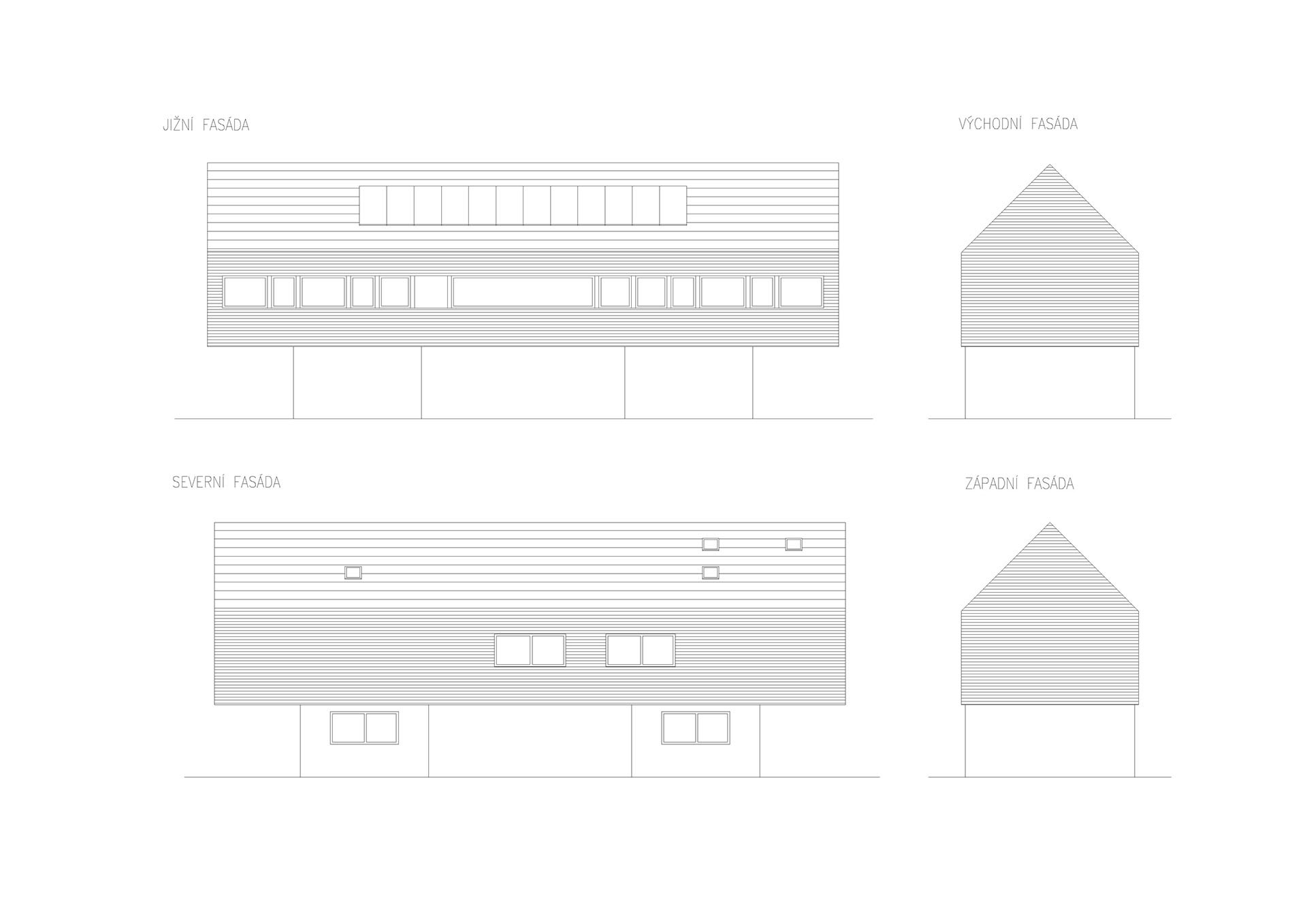 Výrazným prvkem v exteriéru je i členění fasády. Jižní fasáda je prosklená dlouhým pásovým oknem, které poskytuje výhled do zahrady a okolí, zatímco na severní fasádě najdeme pouze dvě malá okna. V této části domu se nachází chodba a jiné zázemí domu.