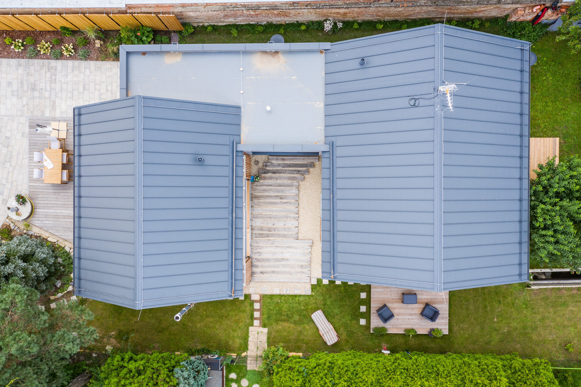 Dvě dřevostavby se sedovými střechami propojené krčkem, atrium, dvůr a intimní zahrada se vzrostlými stromy, z nichž ani jeden nemusel být během výstavby pokácen. Rodinný dům na Hané od brněnského studia No-a architekti zajišťuje majitelům maximální kontakt se zahradou díky půdorysnému řešení ve tvaru písmene C. Vlastní dřevěné terasy mají také všechny ložnice a obytné pokoje, tak aby majitelé mohli rovnou vkročit do zeleně. Hlavní společenský prostor s kuchyní, jídelnou, obývákem a velkou knihovnou se pak otevírá na celou výšku krovu, přičemž sluneční světlo do něj kromě velkého prosklení přivádí také kruhové okno.