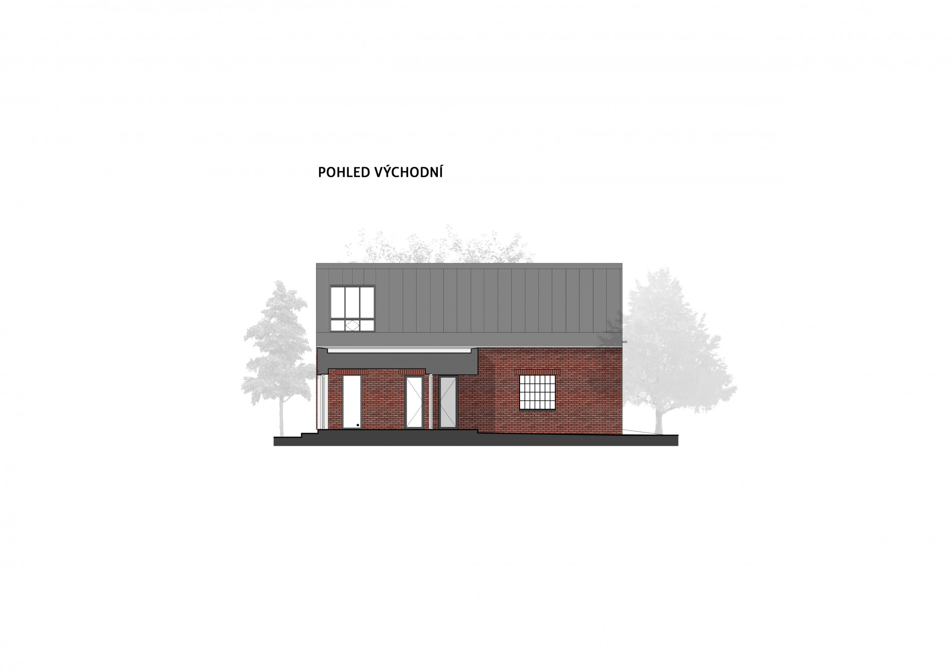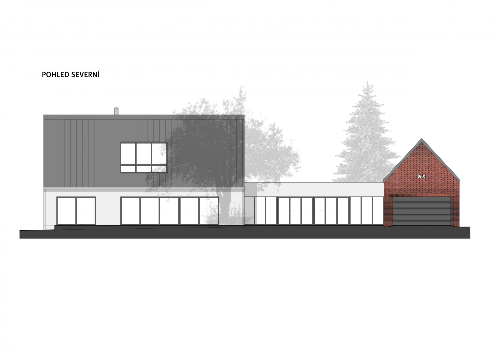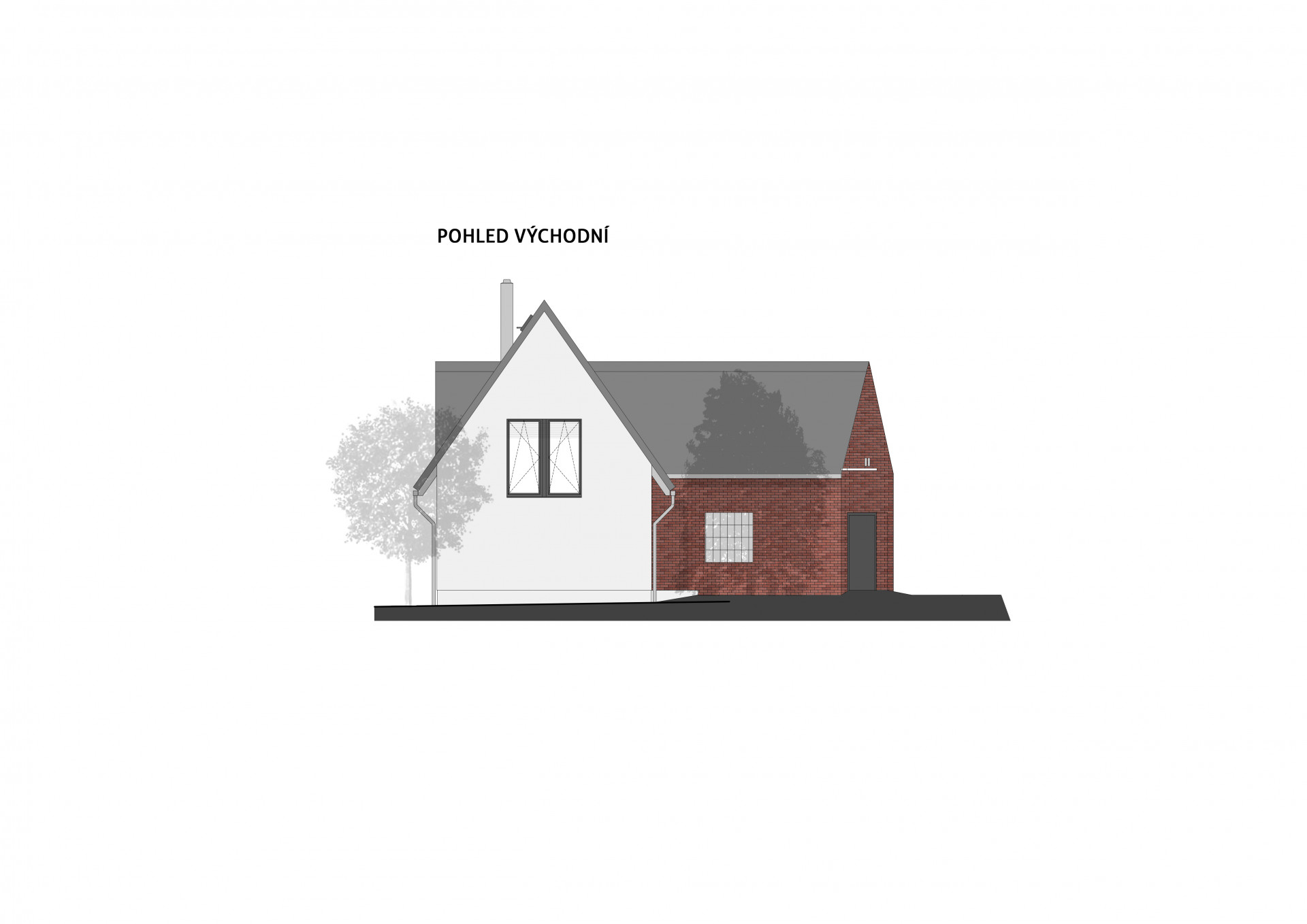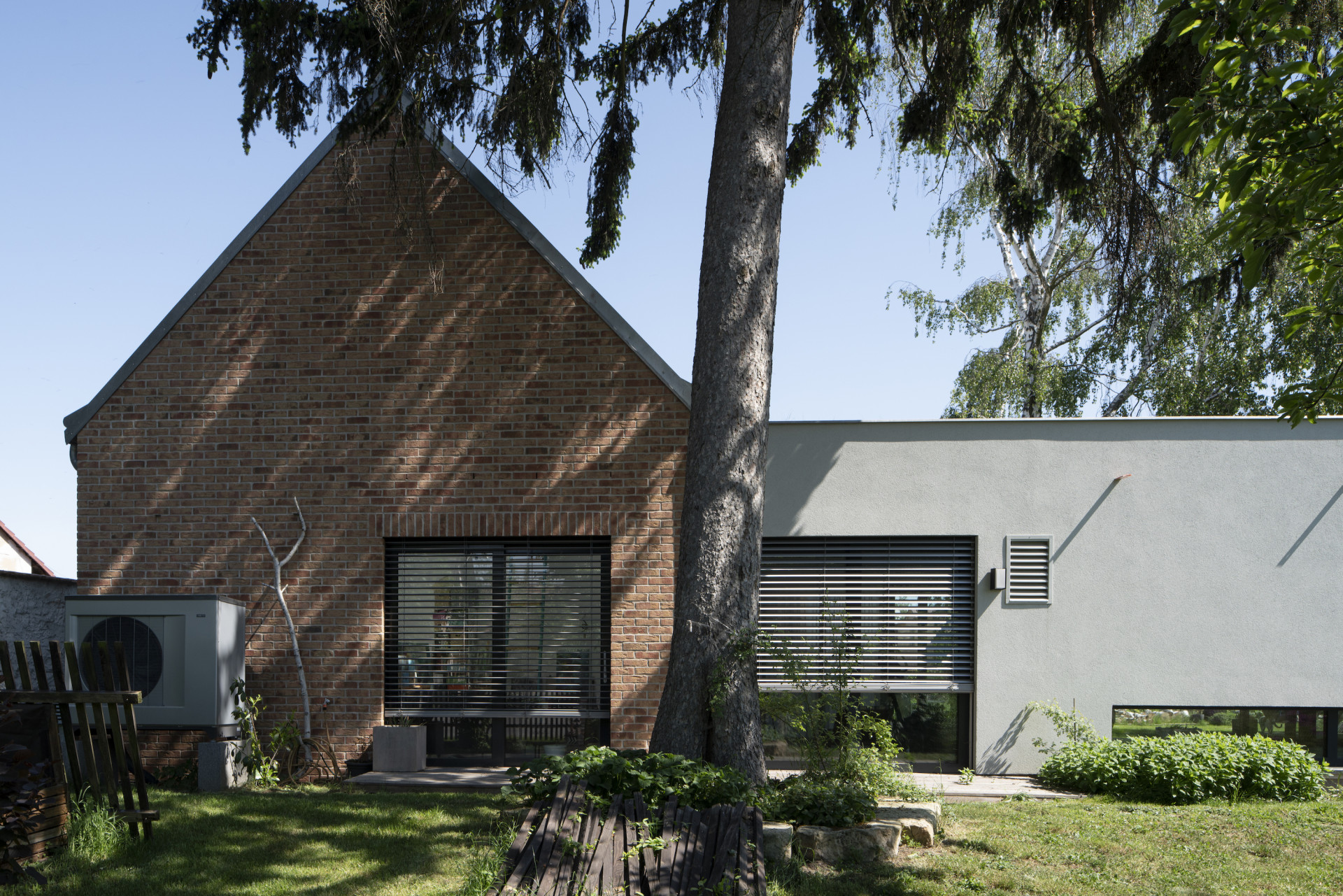 Rodinný dům se skládá celkem ze 3 částí, které architekti od sebe jasně odlišili. U vstupu na pozemek vás v první řadě přivítá stavba se sedlovou střechou a cihlovým obkladem, která v sobě obsahuje dvojgaráž a také malířský ateliér. Druhý objekt rovněž se sedlovou střechou, který však tentokrát získal bílou omítku, slouží k bydlení. Přízemí patří převýšené obytné hale, nad kterou se nachází ateliérové okno.