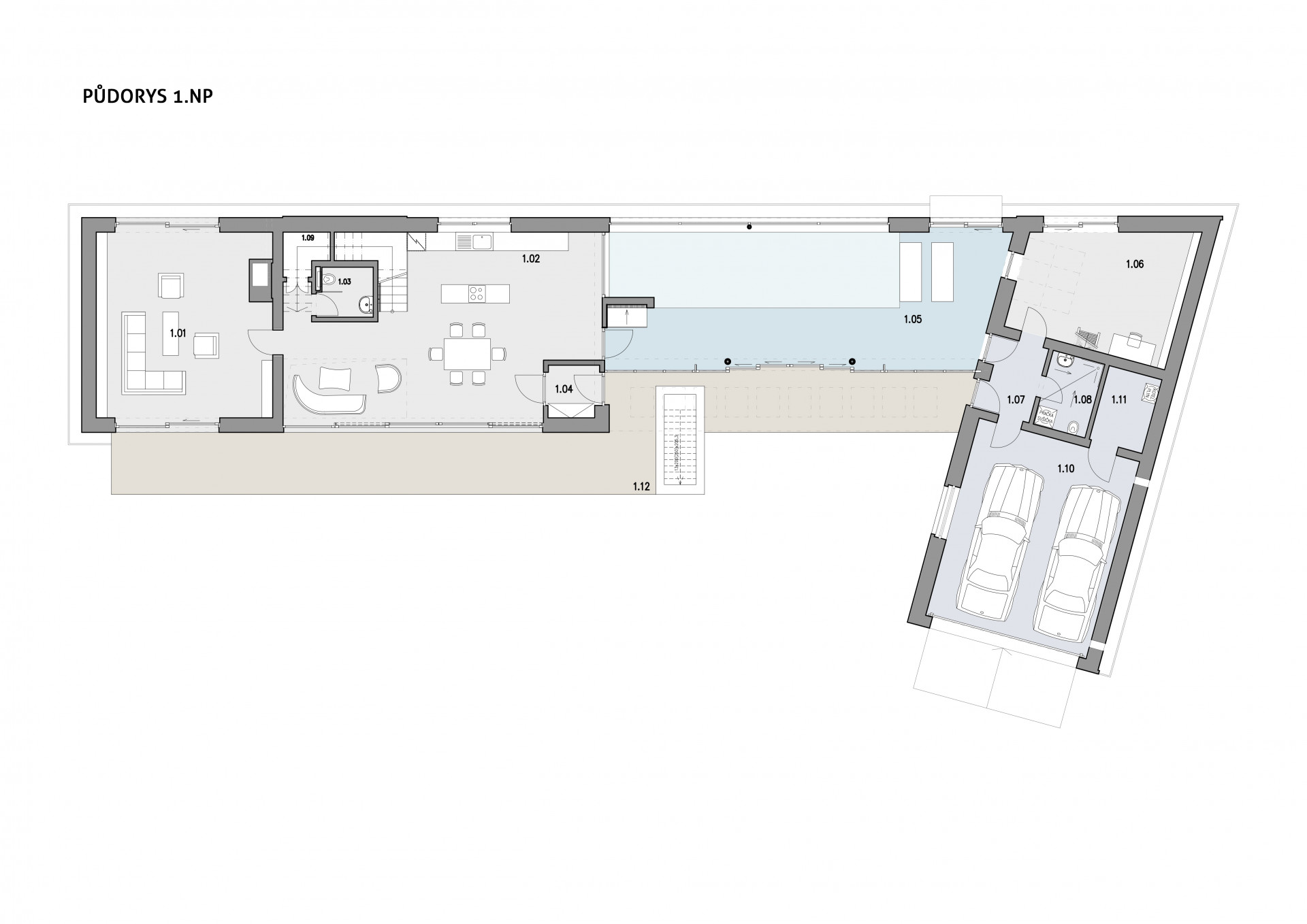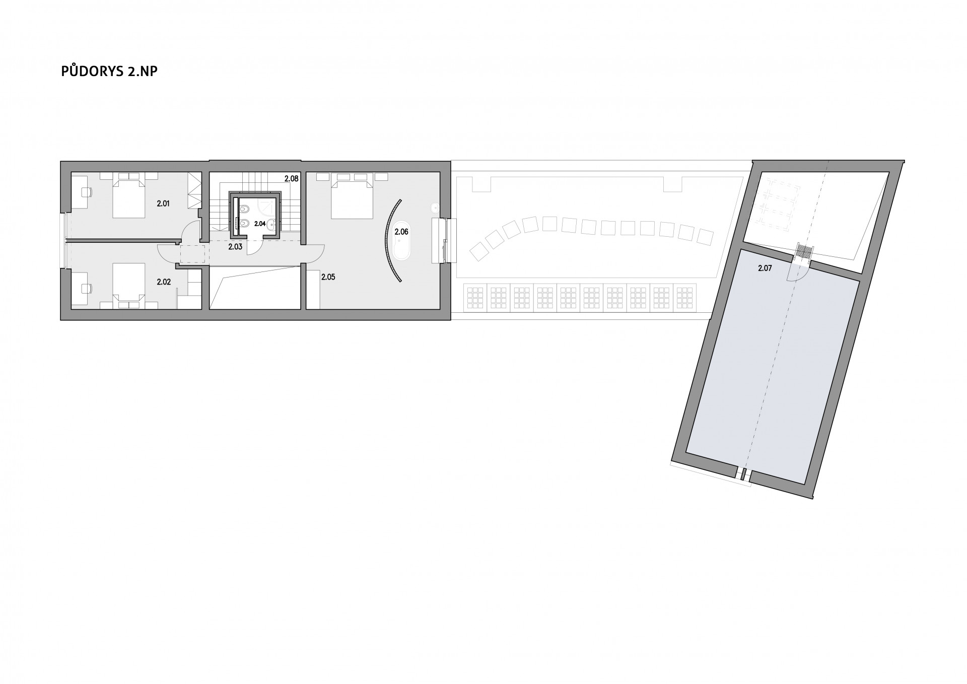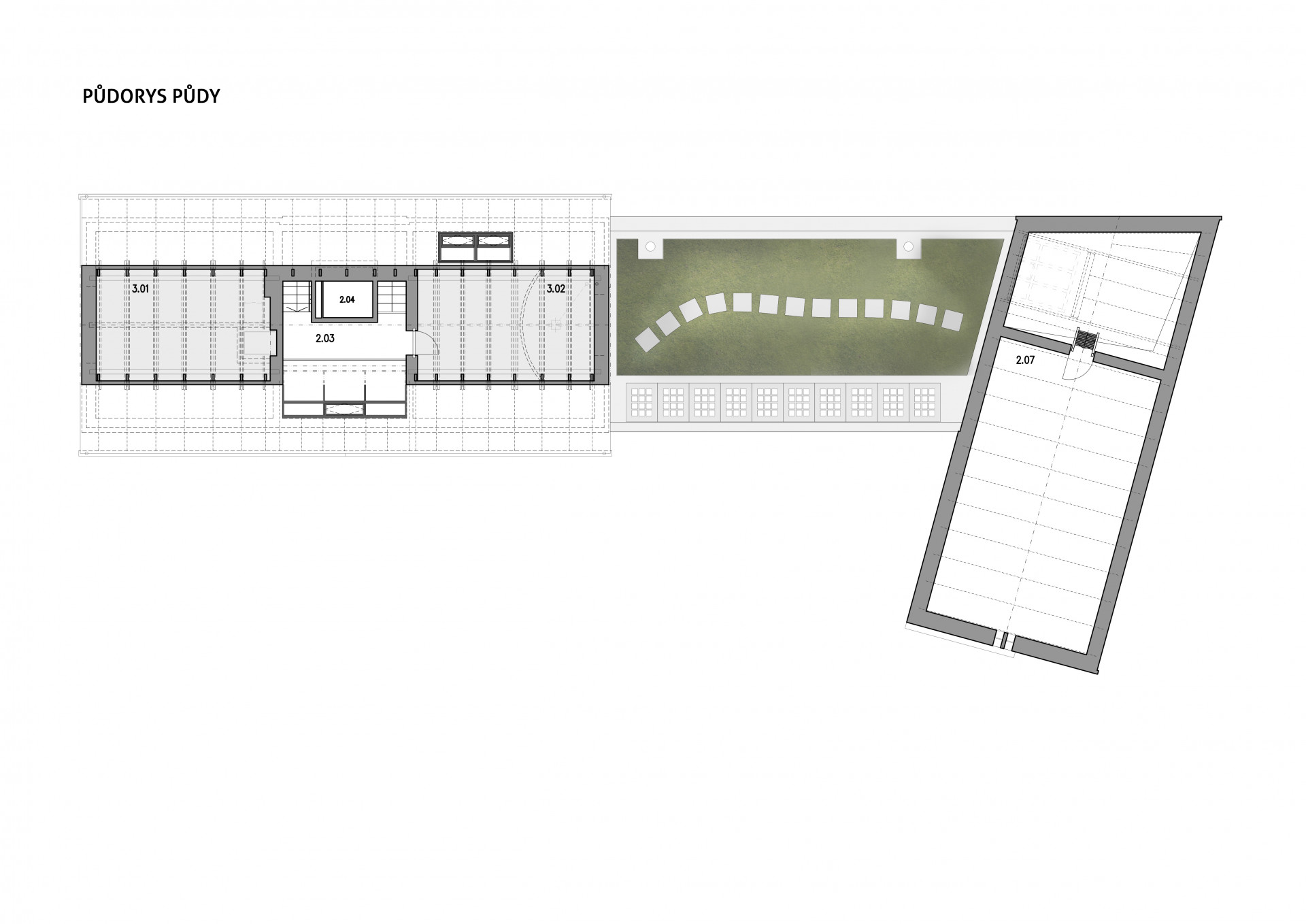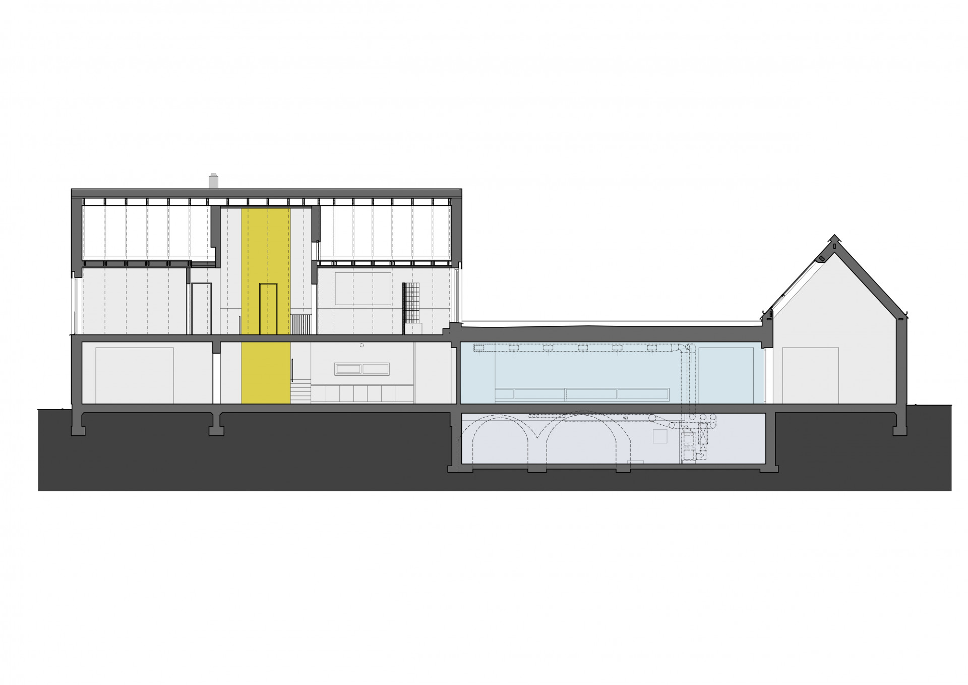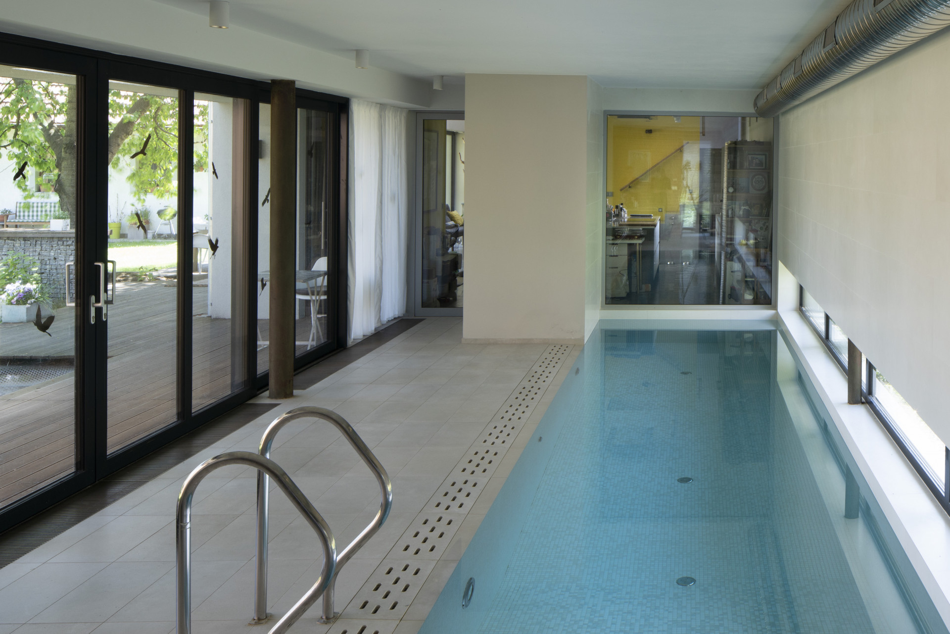 Tyto dvě hlavní hmoty propojuje přízemní objekt s plochou střechou, ve kterém najdeme bazén. Díky vnitřním oknům dochází k vizuálnímu propojení obytného prostoru, bazénu a ateliéru. Na zelenou střechu bazénu vede přímý vstup z hlavní ložnice umístěné v patře.