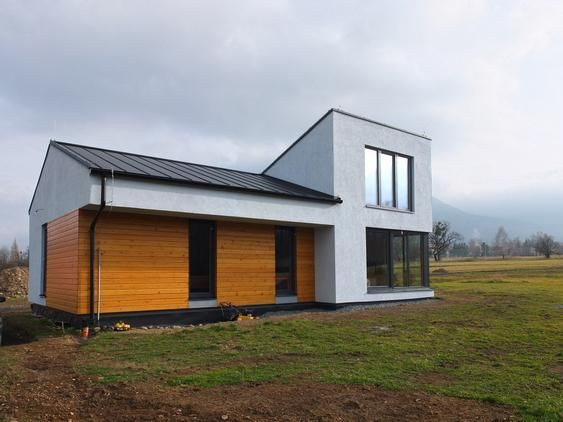 Dům má čistě obdélníkový půdorys, což se příznivě odráží jak ve vnitřním uspořádání místností, tak v energetické úspornosti domu. Delší strany půdorysu jsou otočeny k východu a západu a dům sám tak tvoří přirozenou bariéru mezi cestou a zahradou. Stavba je umístěna co nejvíce k cestě, aby byla v maximální ploše využita zahrada. Dům je zastřešen sedlovou a pultovou střechou. Dominantním prvkem je „oko“ vystupující ze střechy západním směrem do zahrady. Tento prvek výrazně rozbíjí monotónnost domu. Okolo vystupujícího oka obíhá bílá linka, která vytváří smyčku a dále pokračuje podél hmoty domu až na jeho konec. Ze západní strany jsou využity tepelné zisky z velkého prosklení do všech obytných místností. Z východní strany je proslunění pouze menšími pásovými okny. Severní strana je bez oken a na jižní straně je více skla jednak opět z důvodu proslunění a navíc jsou tímto směrem nejhezčí výhledy na hory.