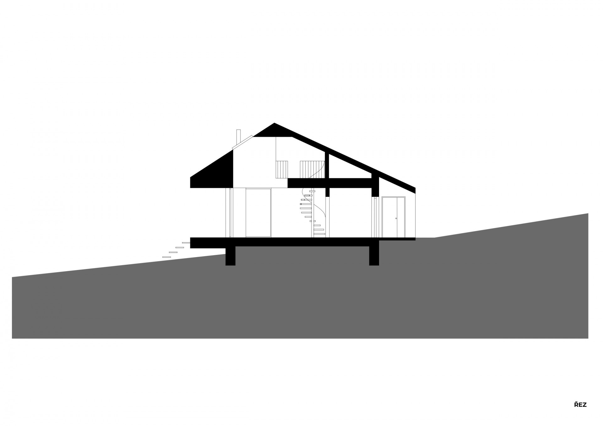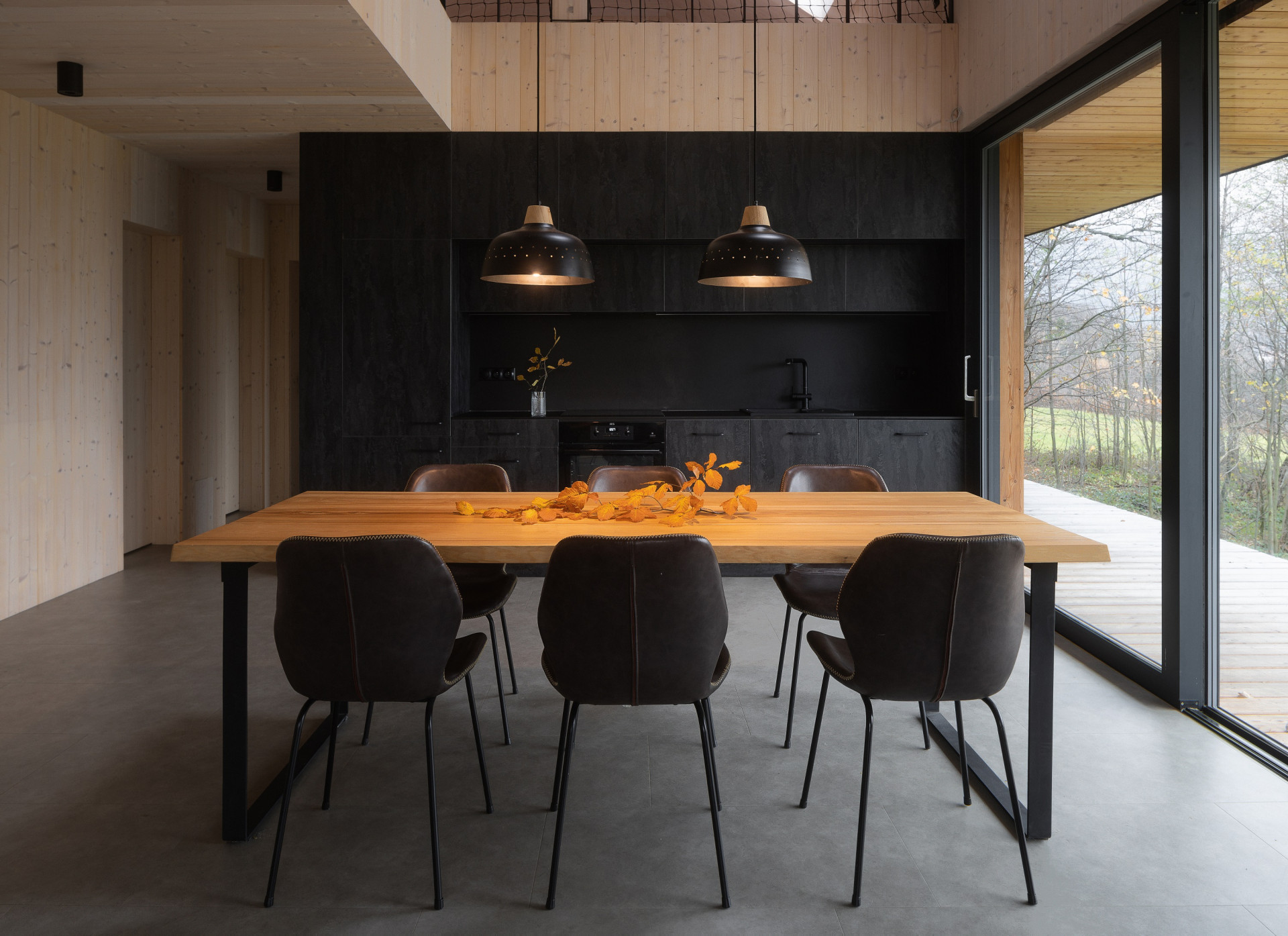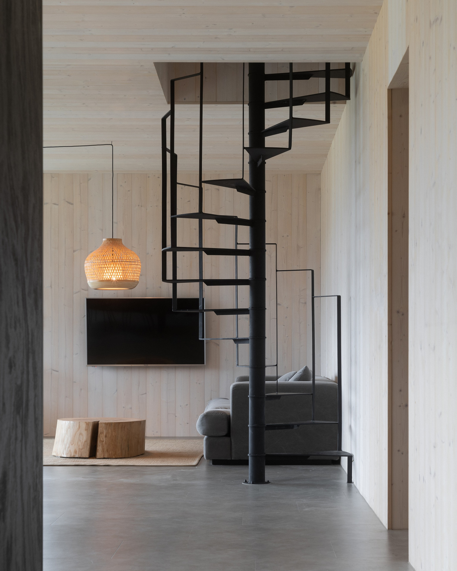 Dřevo převažuje také v interiéru. Stěny a stropy nechali architekti obložit smrkovými palubkami, jejichž světlou barvou doplňují šedé podlahy a černé vybavení. Nejvýraznějším prvkem obývacího pokoje se stala právě černá kuchyňská linka nebo točité schodiště vedoucí do obytného podkroví.