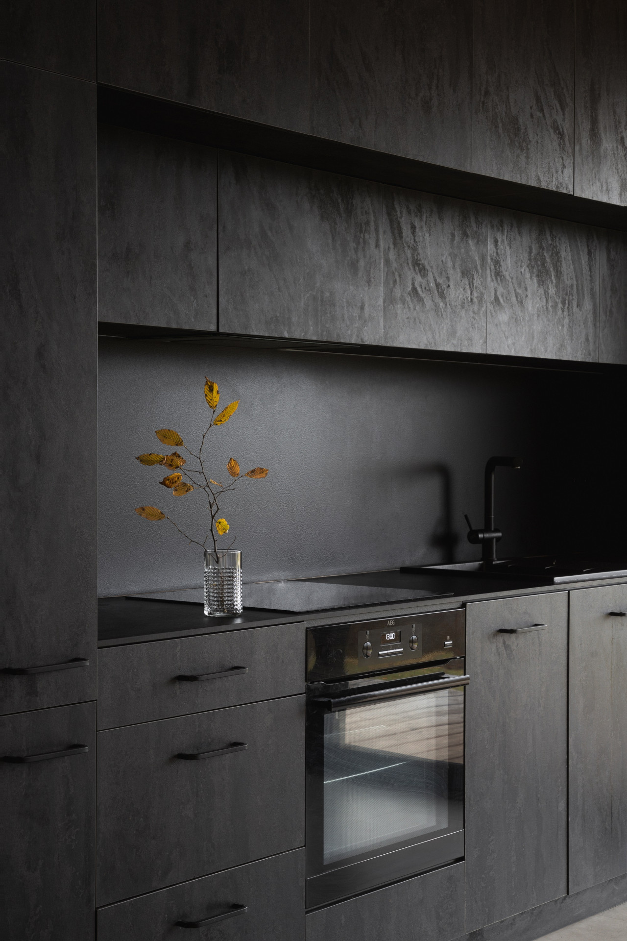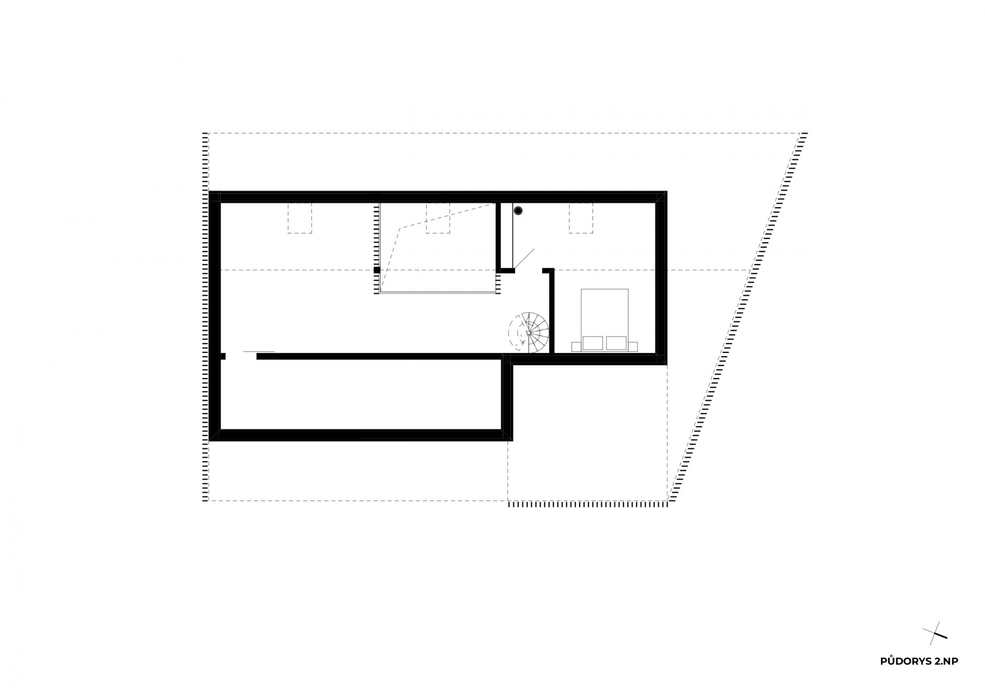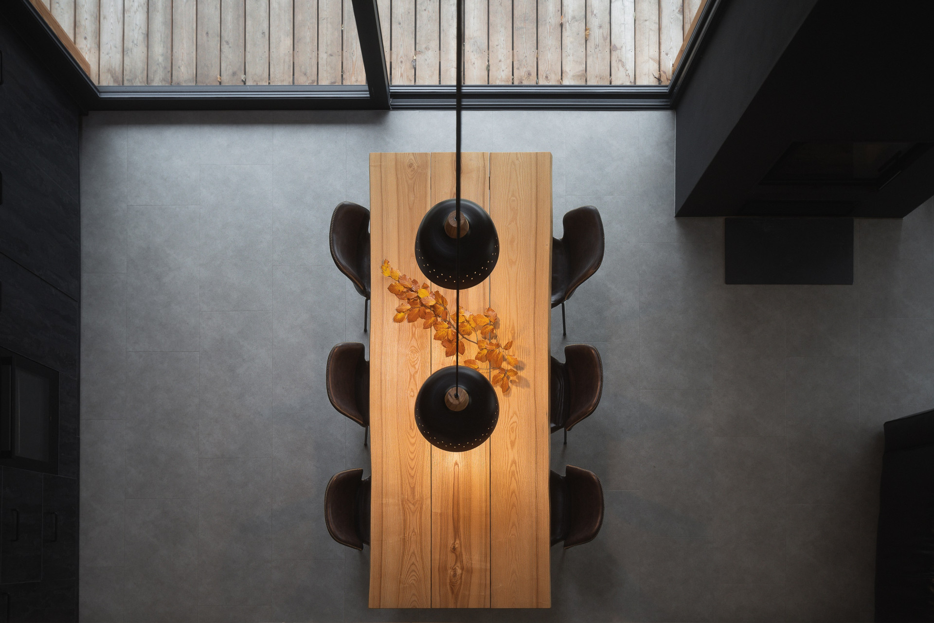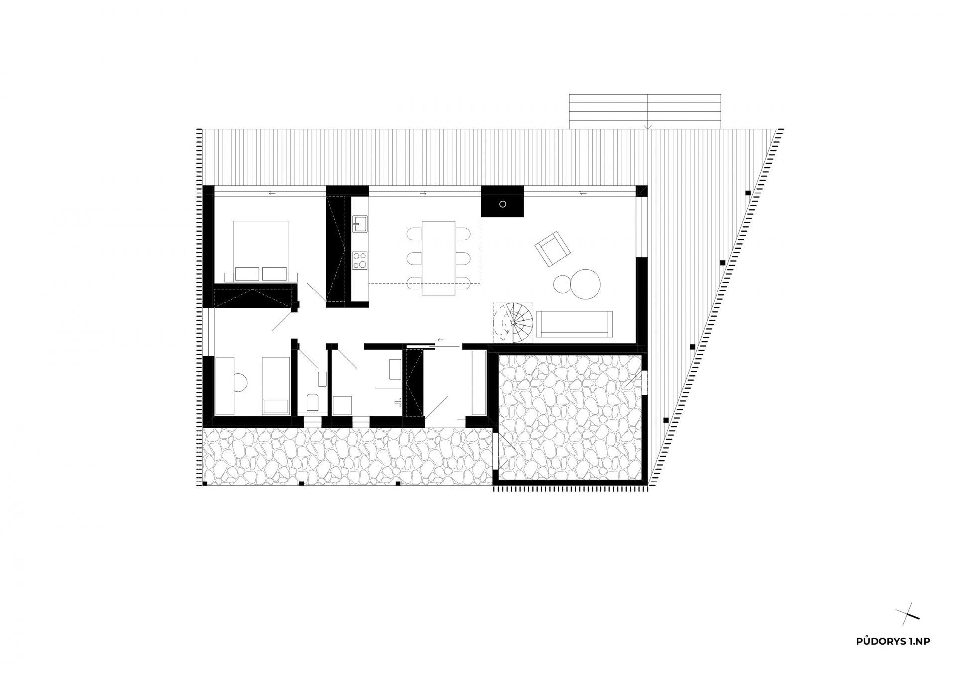 Dřevo převažuje také v interiéru. Stěny a stropy nechali architekti obložit smrkovými palubkami, jejichž světlou barvou doplňují šedé podlahy a černé vybavení. Nejvýraznějším prvkem obývacího pokoje se stala právě černá kuchyňská linka nebo točité schodiště vedoucí do obytného podkroví.