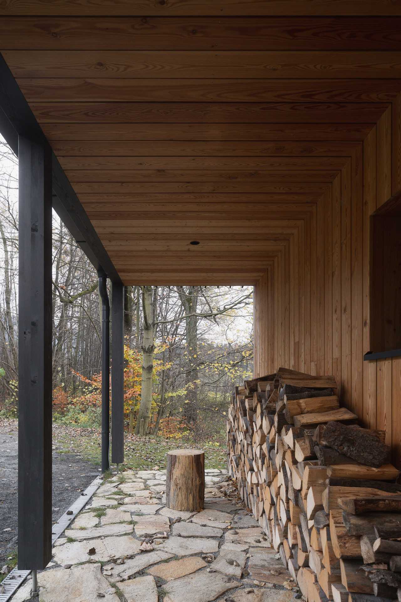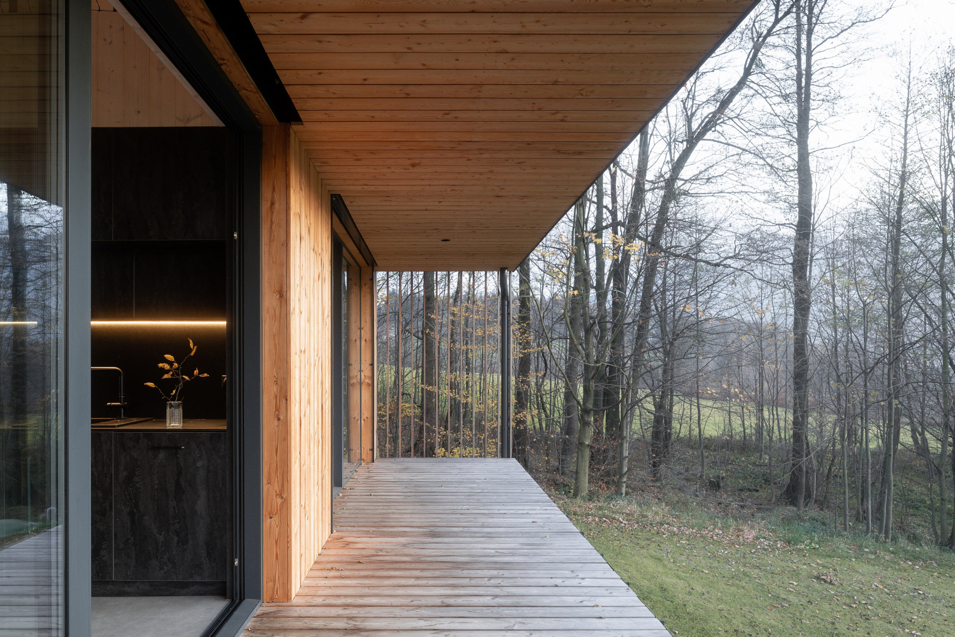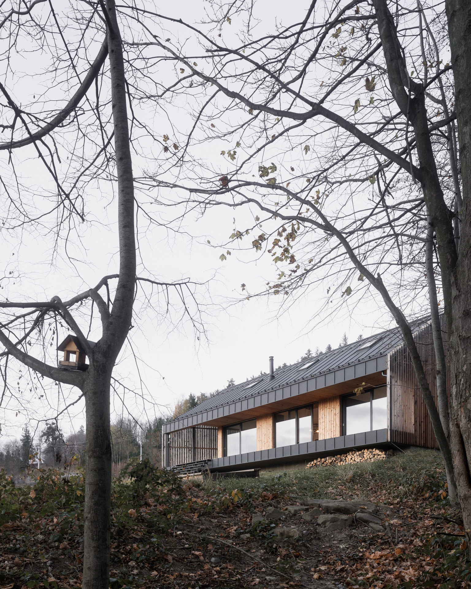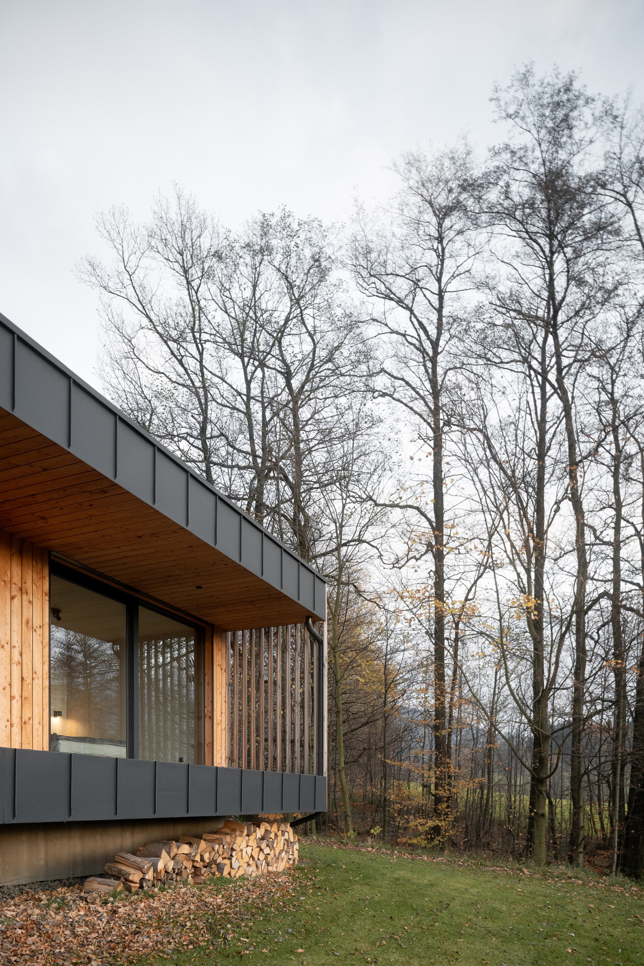 „Modřínové laťování vytváří nejen charakteristický vzhled objektu, ale zároveň svým natočením zajišťuje soukromí na terase vůči příjezdové cestě se zachováním výhledů do okolní krajiny,“ vysvětlují architekti studiaArk.