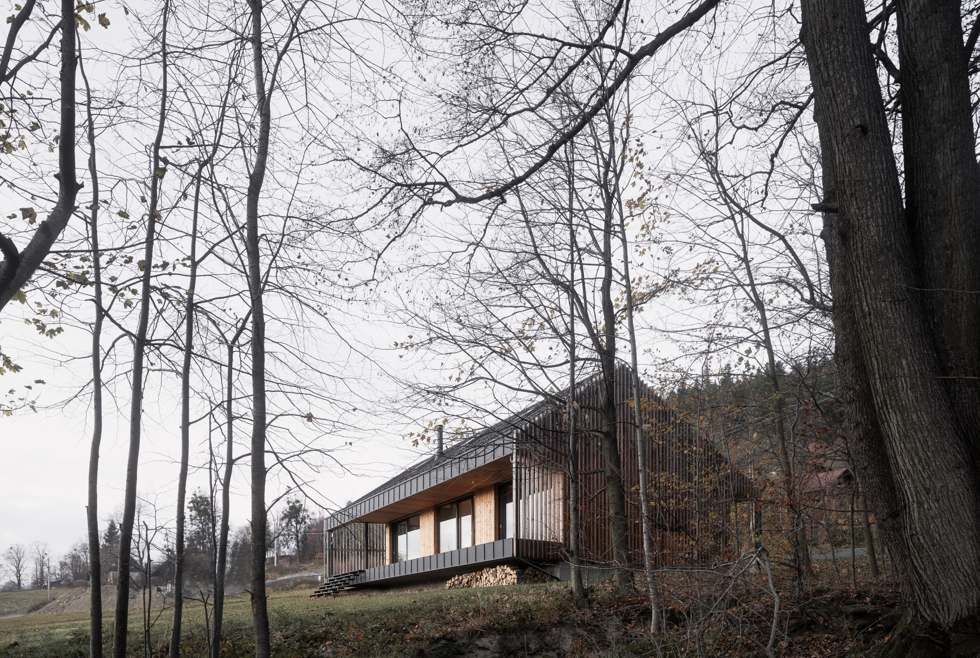 Dům v Ostravici s dřevěnou konstrukci na betonovém základě oplášťuje fasáda z neošetřeného modřínového dřeva a kryje plechová střecha. „V rámci kontextu pracuje návrh s tradičním archetypem sedlové střechy s vyoseným hřebenem,“ popisují autoři.