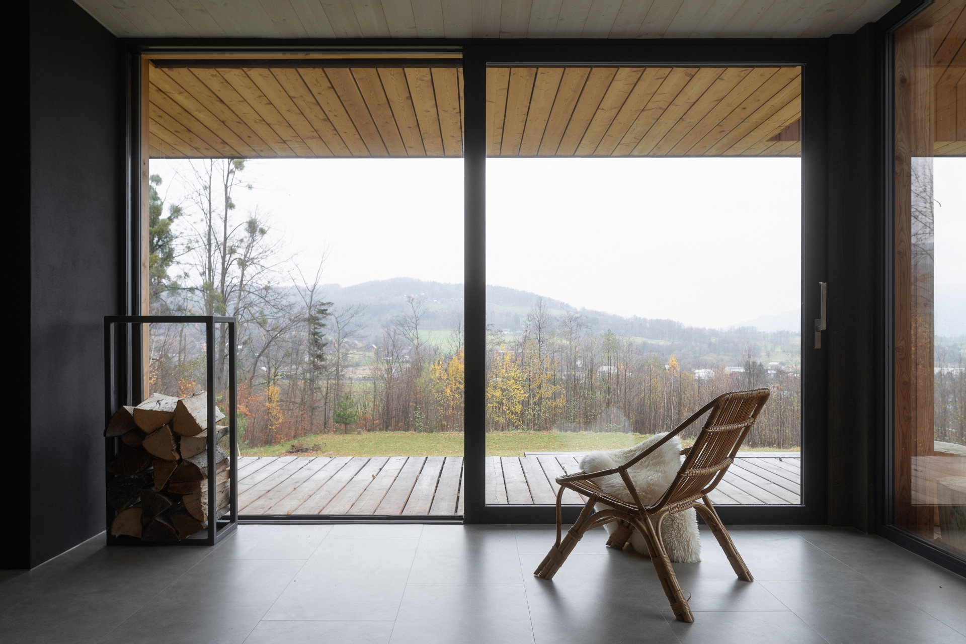 Výhledy do krajiny zajišťuje stavba svým zahradním průčelím. Architekti zde obytné prostory propojili s exteriérem prostřednictvím velkoformátových posuvných oken. Z ložnice a obývacího pokoje se také dá vyjít přímo na terasu a z té sejít dál do zahrady.