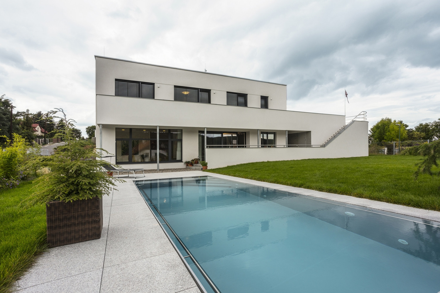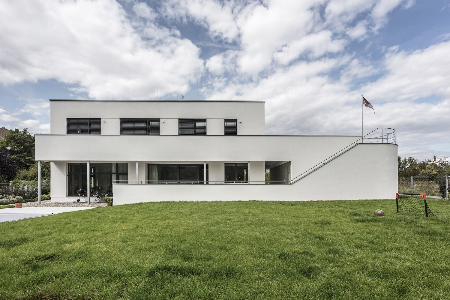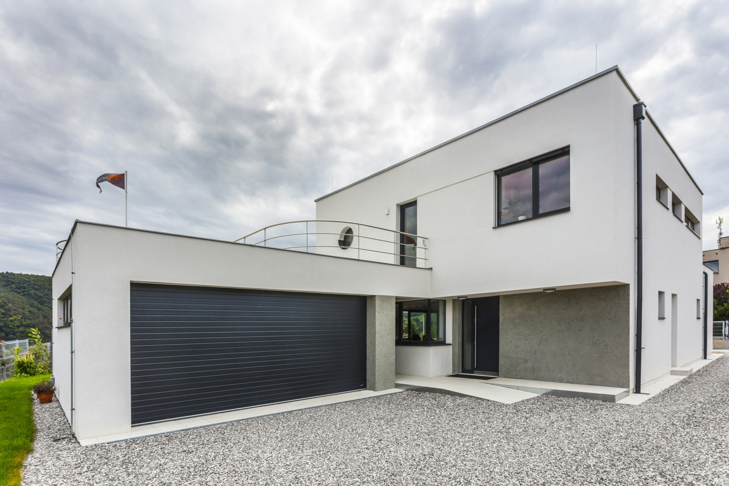 Vyvýšená poloha pozemku s výhledem na Berounku se spojila s investorovým úzkým vztahem k architektuře stylu Bauhaus a dovedla architekty z ateliéru Air k návrhu elegantního rodinného domu nabízejícímu daleké pohledy po okolní krajině včetně české metropole. Vedle velkoformátových oken v přízemí dům disponuje také rozměrnou terasou pro posílení vztahu mezi domem a exteriérem. Na domě najdeme také řadu nautických prvků vztahujících se právě k modernistické architektuře meziválečného období.
