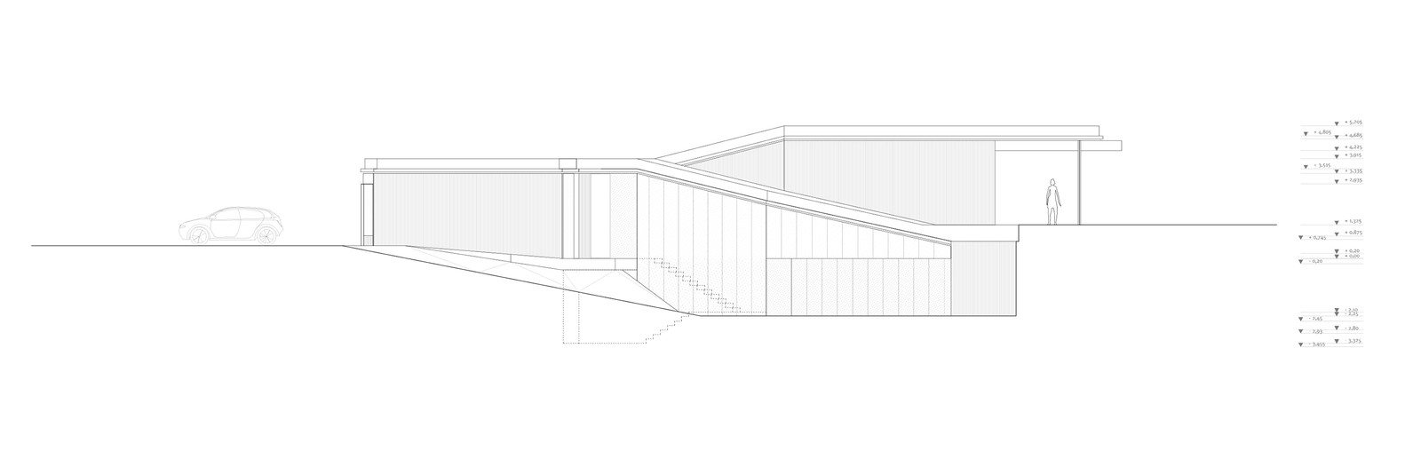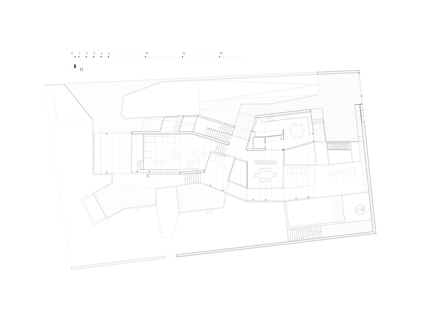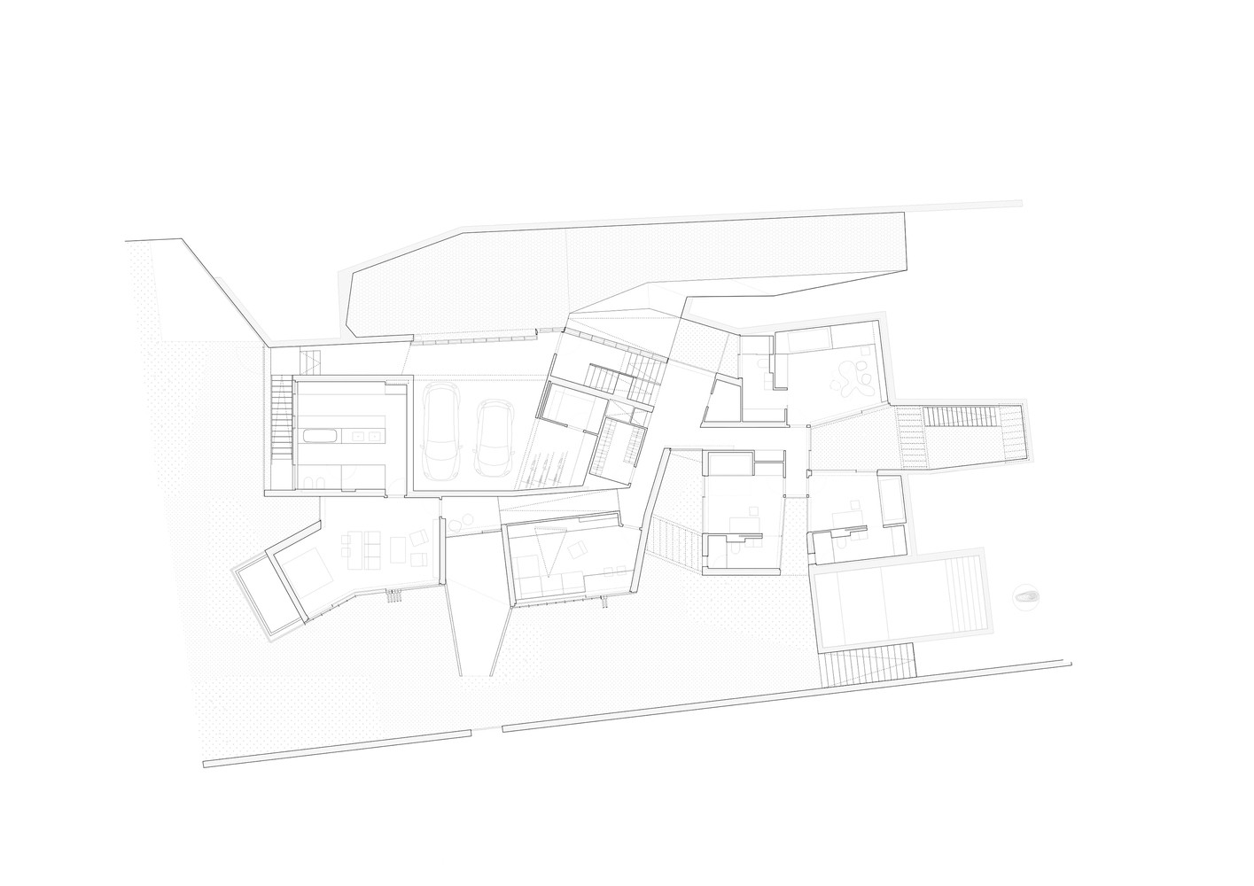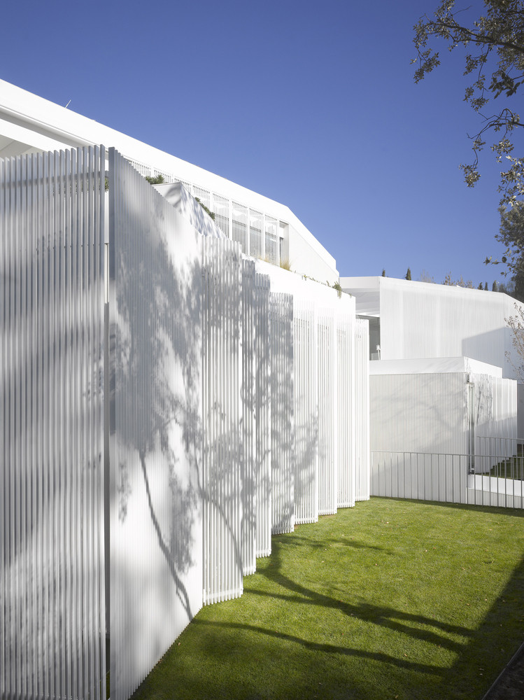 Zavedená architektonická kancelář Estudio.Entresitio sídlí v současnosti na dvou adresách – v Madridu a New Yorku. A právě v hlavním městě Španělska vznikl podle jejich návrhu před několika lety nezvykle řešený rodinný dům o velikosti přes 500 metrů čtverečních. Stavbu umístěnou na podlouhlý pozemek mírně se svažující k jihu architekti kompozičně rozdělili do dvou členěných protáhlých hmot, které dohromady vytvářejí výrazně horizontální formu. Hmotu spodního podlaží s vybíhajícími „prsty“ nechali architekti částečně zapustit do terénu, horní patro pak díky svému ustoupení vytváří pobytové terasy i plochy pro střešní zeleň.