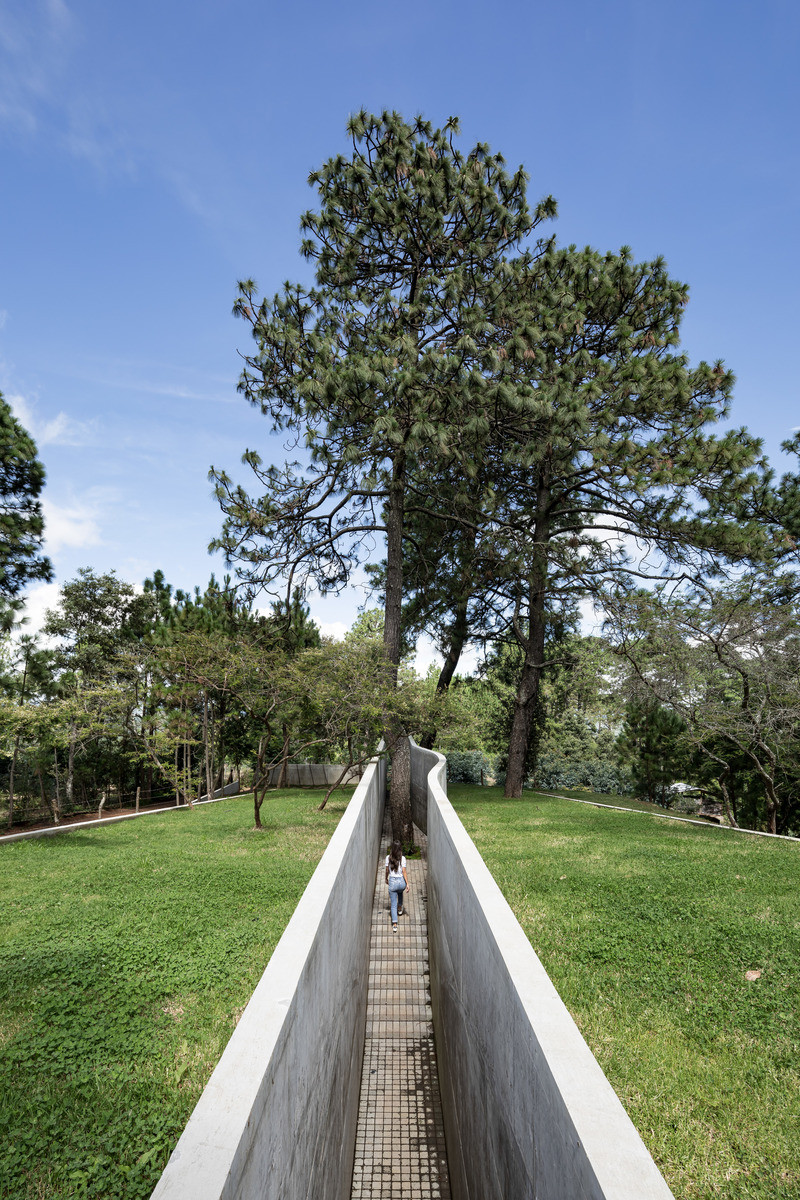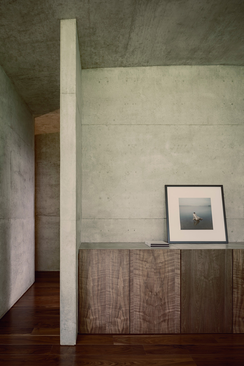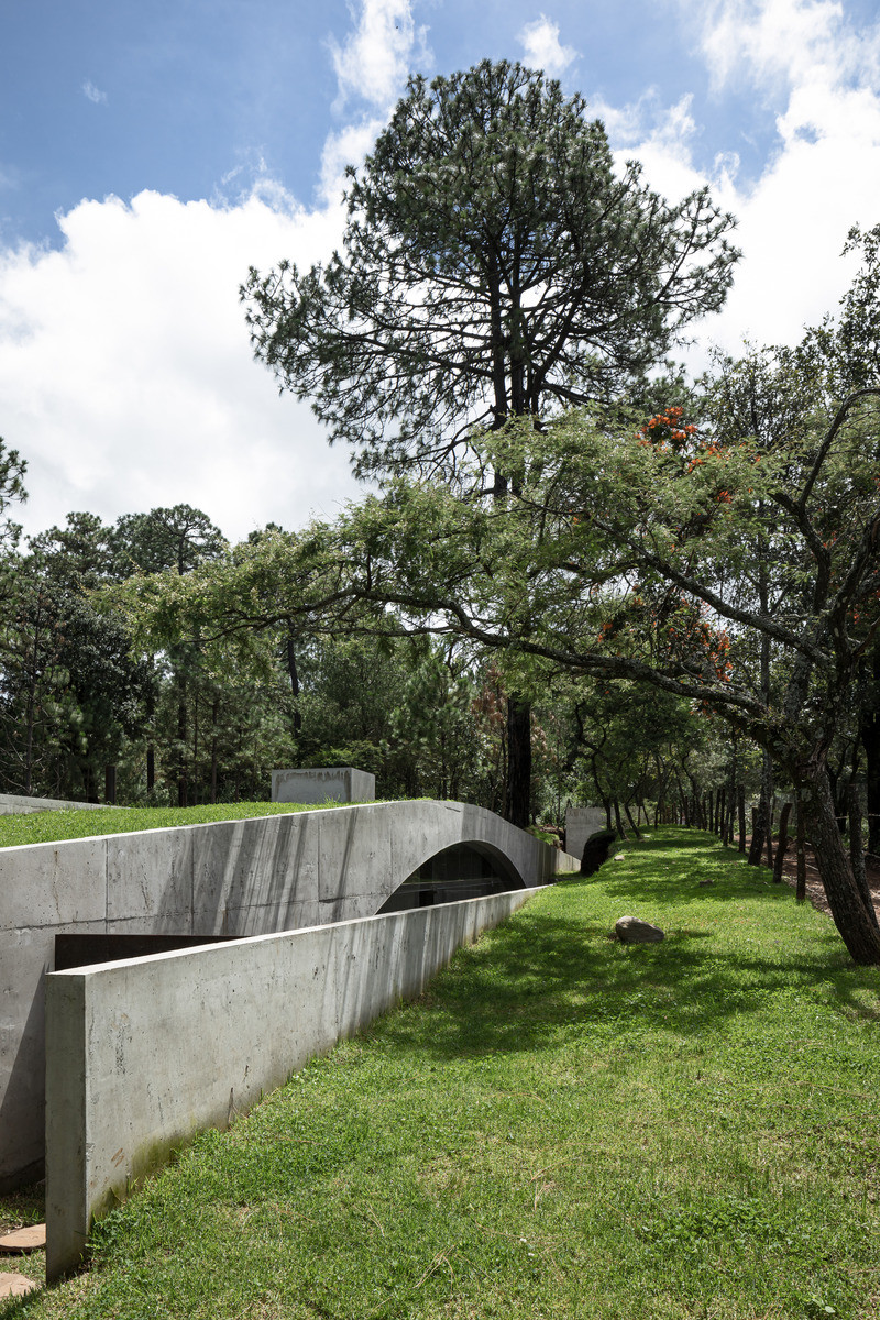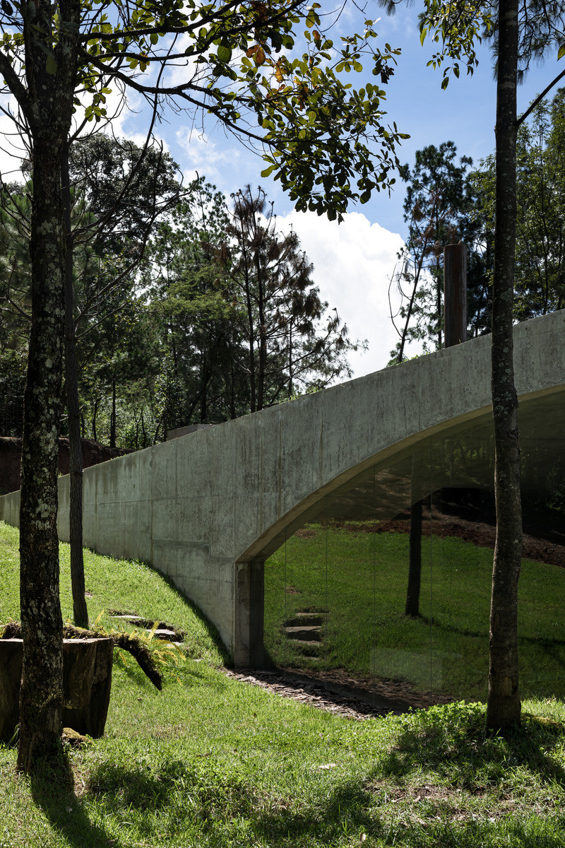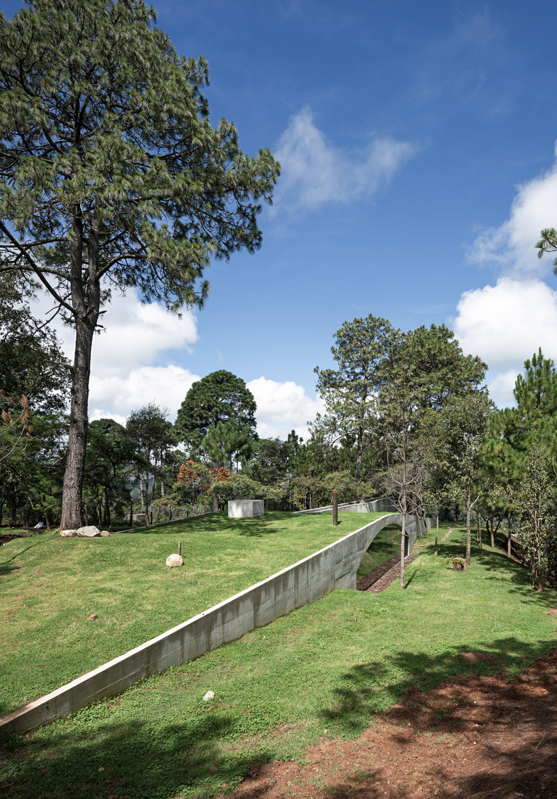 Rodinný dům je částečně zasazen do kopcovitého terénu. Betonové klenby navozují pocit jakési zabudované jeskyně a jsou dostatečně silné na to, aby bylo možné celou střechu pokrýt zelení. „Vytvořením krásného živého povrchu navázal projekt na okolní půdu a stal se tak jedním z mnoha kopců v krajině,“ uvádí HW Studio.