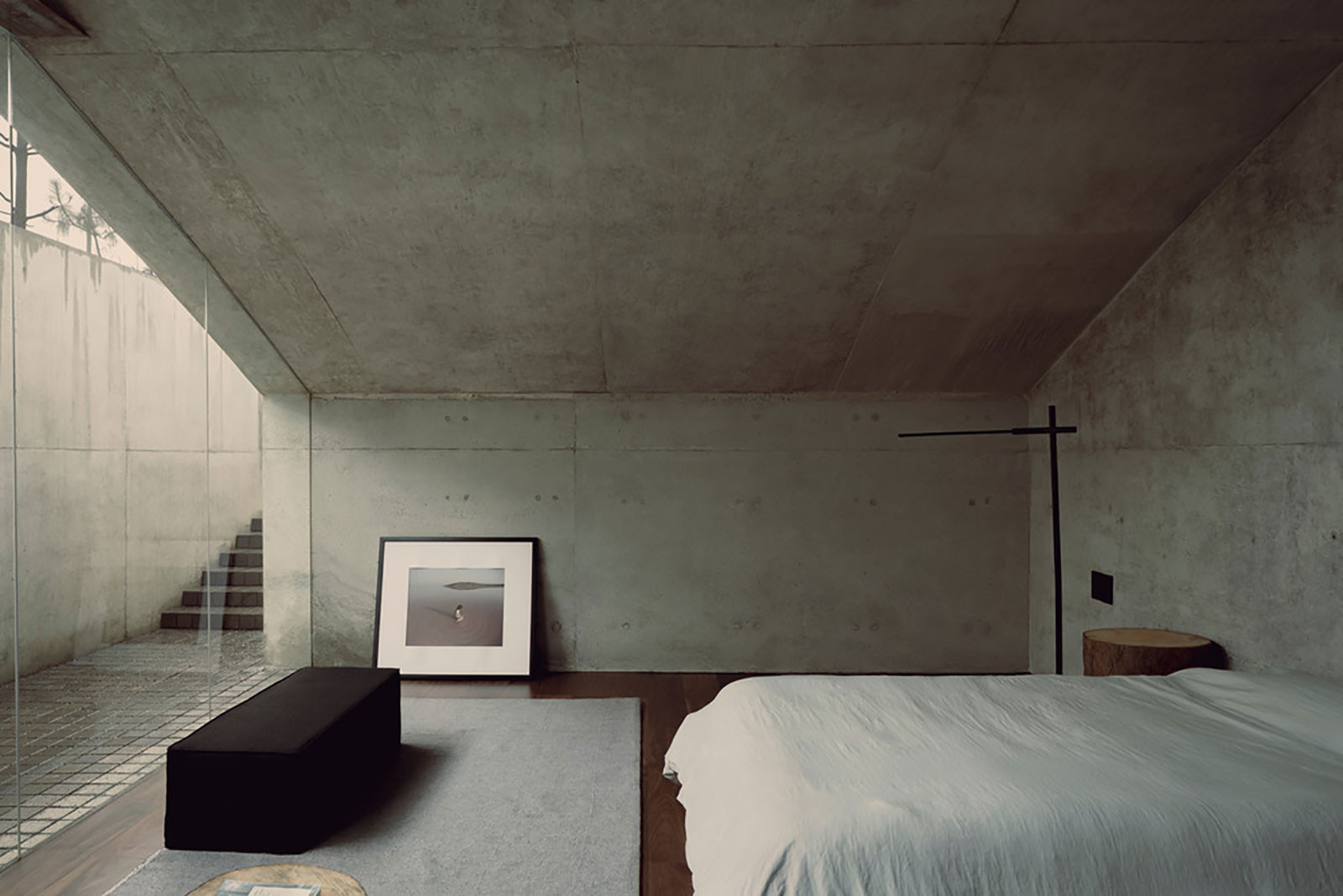 I po vstupu do interiéru na návštěvníka čeká strohý, minimalisticky řešený prostor. Architekti ponechali všechny stěny v podobě odkrytého betonu. Dřevěná podlaha odkazuje na okolní les a vyvažuje chladnost betonových stěn. Na levé straně domu se rozkládá otevřený obytný prostor s kuchyní a jídelnou. Spotřebiče jsou umístěny tak, aby na sebe neupozorňovaly. Nábytek z dřevěných klád a oceli mluví za vše. Velkorysé prosklení obrací zrak diváka k zalesněné rokli. Na pravé straně domu jsou tři ložnice s vlastním sociálním zázemím. Výhled je zde orientován do korun stromů a nebe.