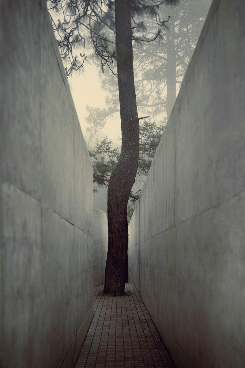 Pro vstup do domu byla vybudována cesta, která je lemována dvěma betonovými stěnami. Cesta je přesně tak velká, aby zde člověk prošel pouze sám. Úzký koridor po chvíli narušuje solitérní strom. Jeho majestátnost se odráží v lehkém zakřivení betonové zdi, která ho respektuje stejně jako samotní architekti. Jakmile návštěvník strom obejde, stačí mu již pouze sejít pár schodů z perleťového kamene, aby mohl otevřít ocelové vstupní dveře.