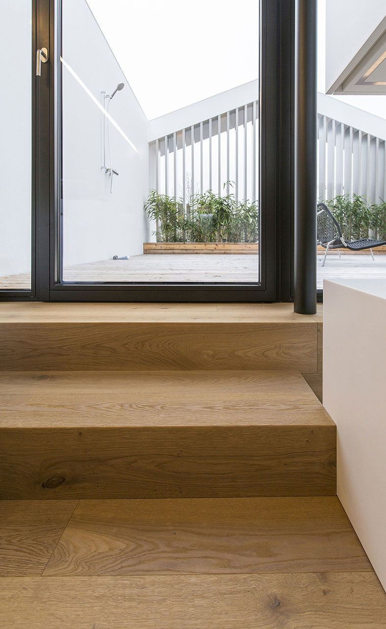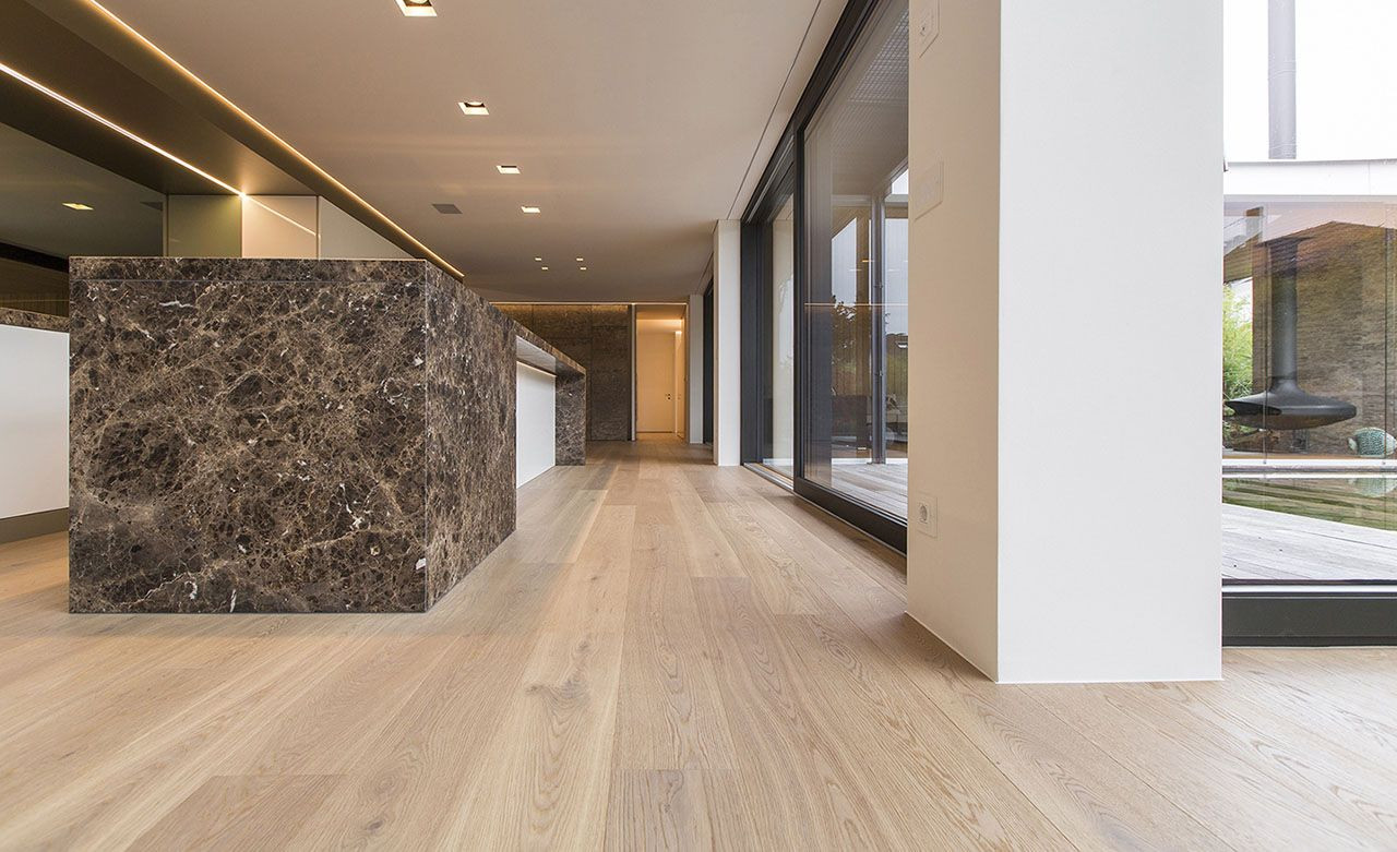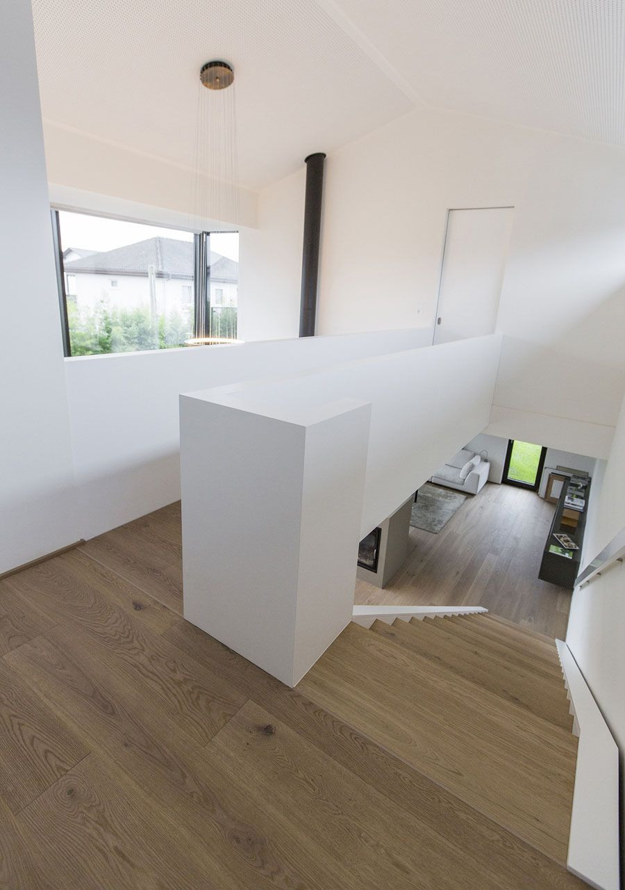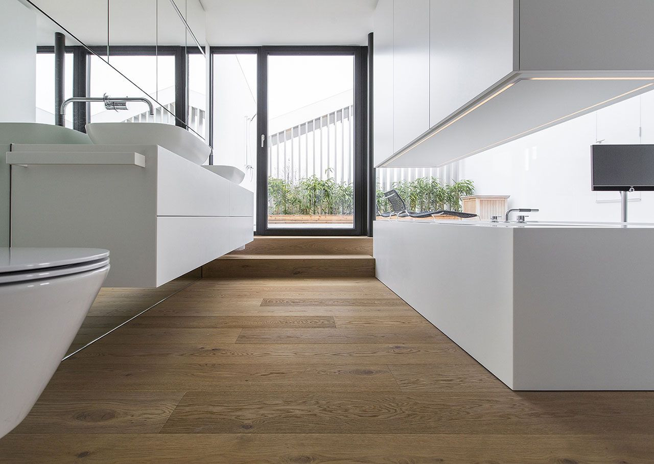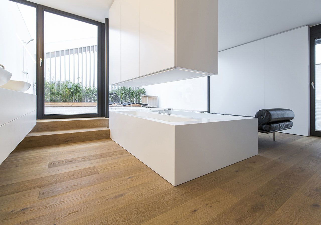 „Čisté linie a celkově klidný charakter interiéru jsme volili v kombinaci s výraznější dřevěnou podlahou Admonter dub salis. Ta byla vybrána vzhledem ke svým vlastnostem a díky tomu, mohla být použita i v koupelnách a chodbách. Miluji přírodní materiály a zároveň moderní architekturu a věřím že se nám povedlo zkombinovat obojí.“ Říká stavitel a investor v jedné osobě pan Mathias.