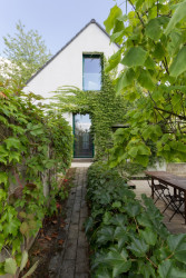 Návrh rodinného domu v Čakovicích od studia Stempel & Tesar architekti využívá terénní nerovnosti k propojení stavby s okolní zahradou, na níž je možné vstoupit ze dvou podlaží. Tvarově jednoduchou hmotu domu se sedlovou střechou rozehrávají velká francouzská okna se zelenými rámy. V tradičním duchu je řešen také interiér, kterému vévodí dřevěné trámy a sloupy.