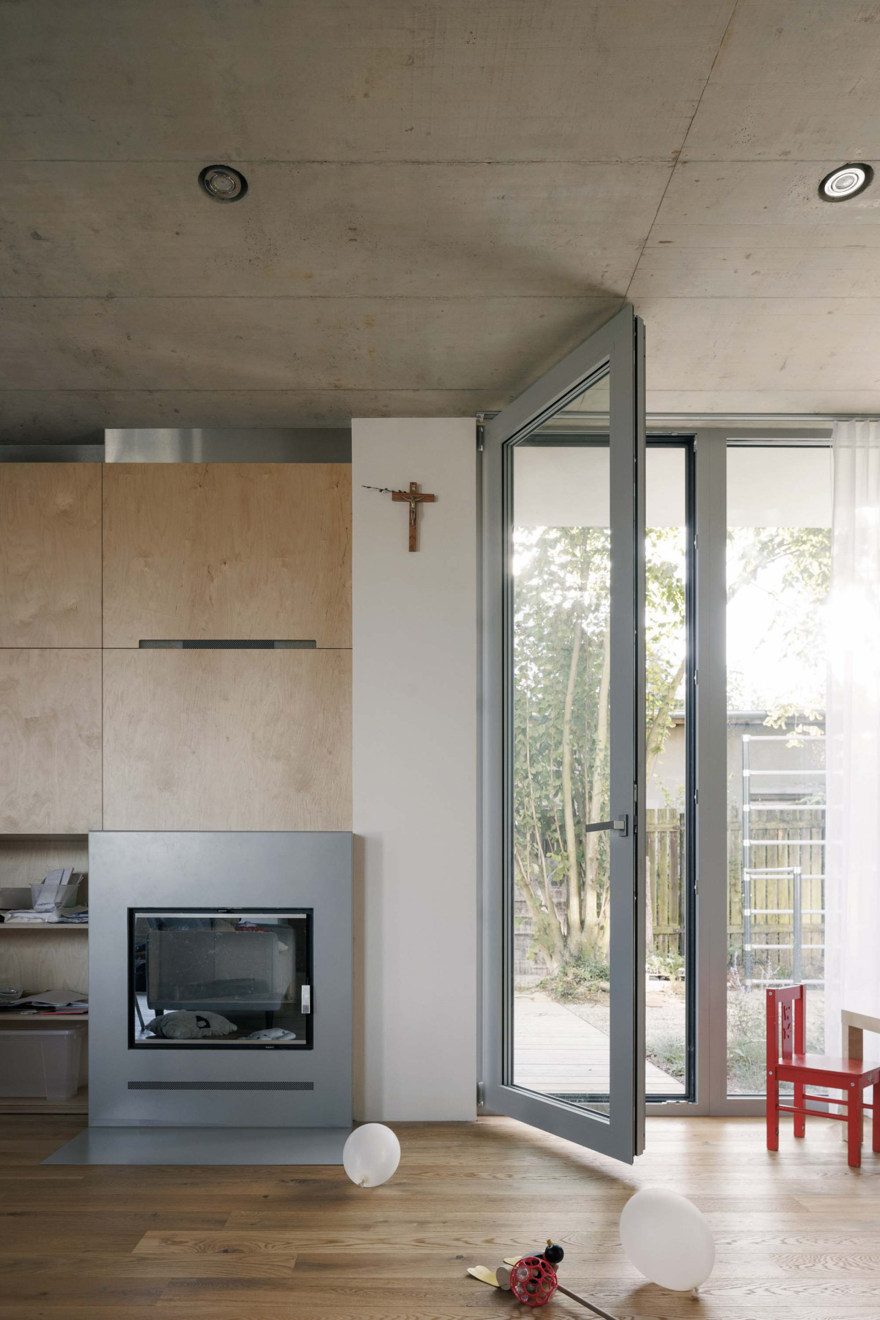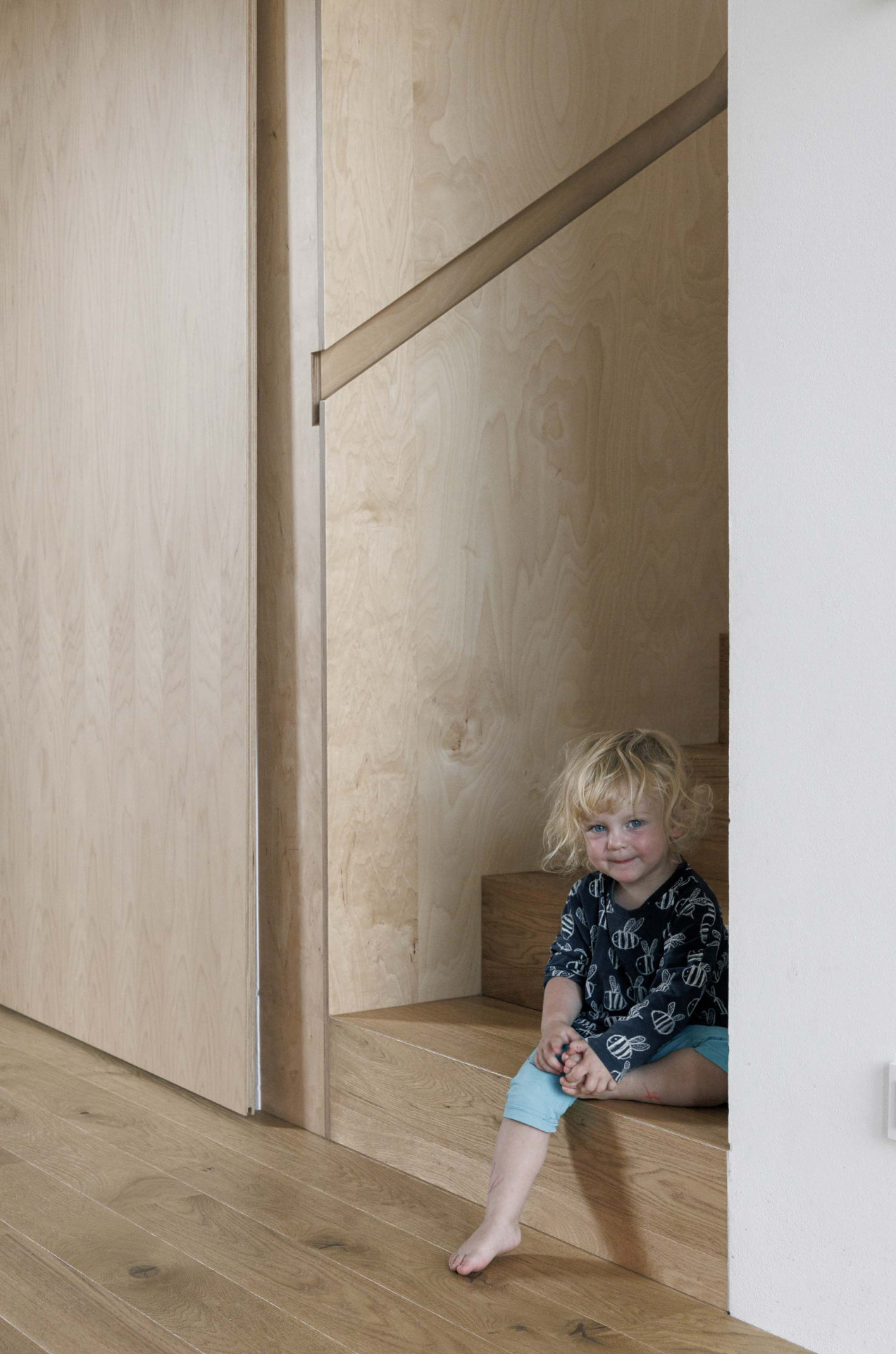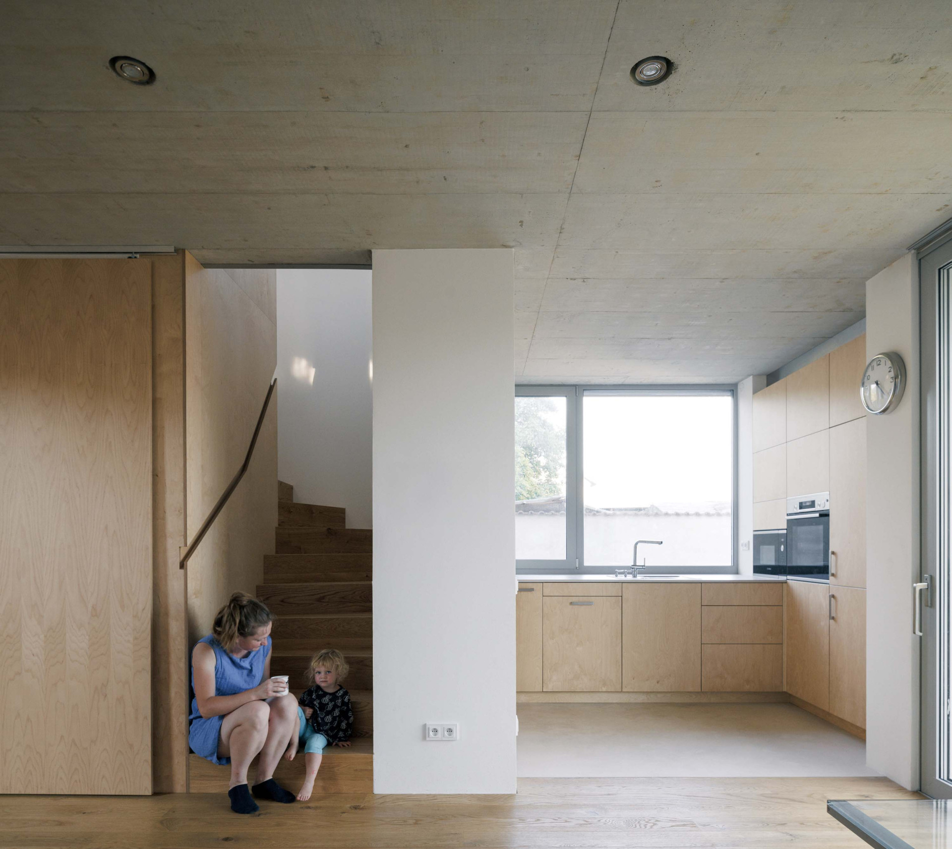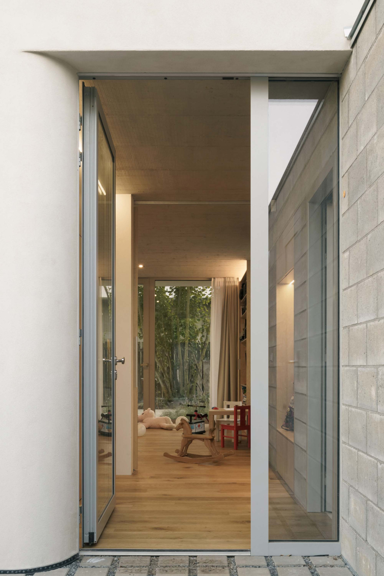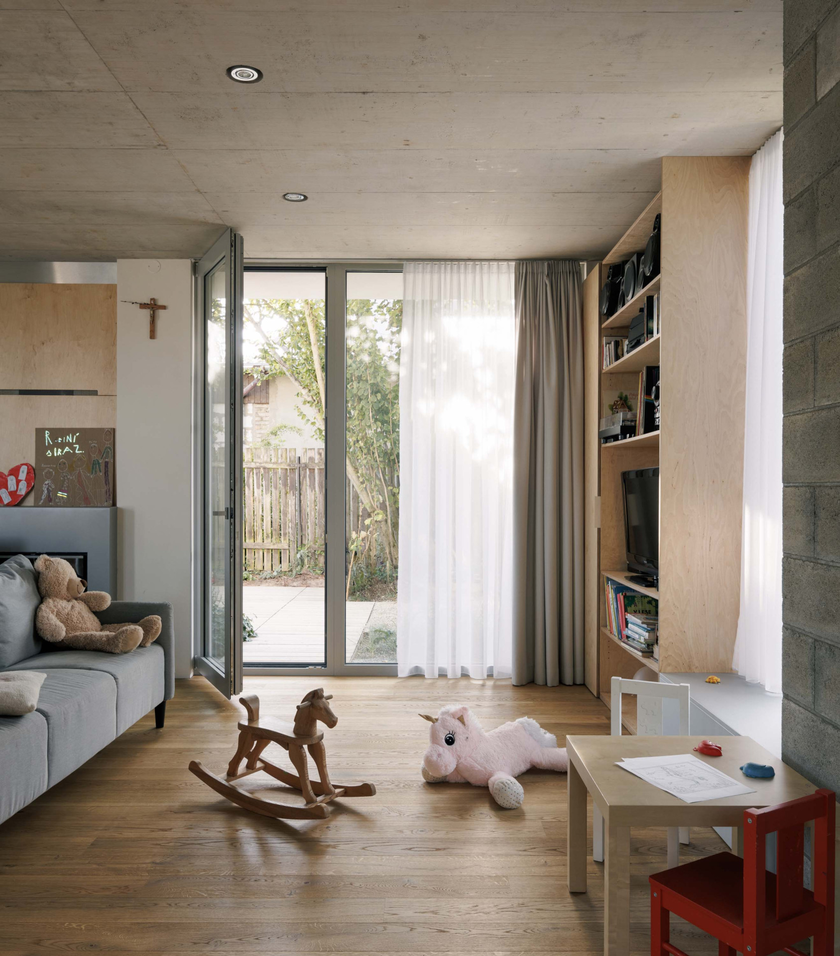Jemná barevná paleta materiálového řešení je vizuálním pojítkem celého domu: betonové tvárnice, teplý povrch dřeva a bílá omítka. Architekti zde vytvořili neutrální kulisu připravenou na barevný život, který do domu vnesou členové rodiny. Koláž dřevěných, betonových a bílých ploch v některých místech doplňuje obnažená konstrukce.