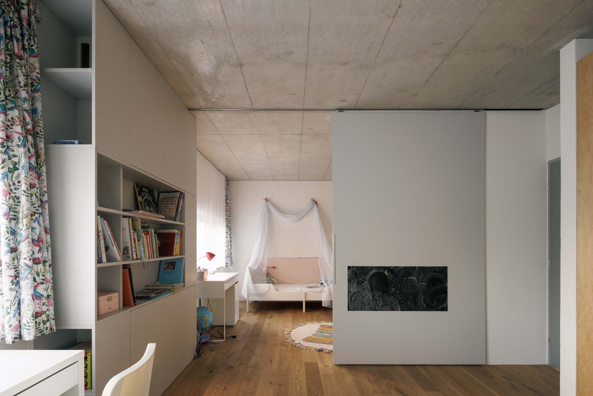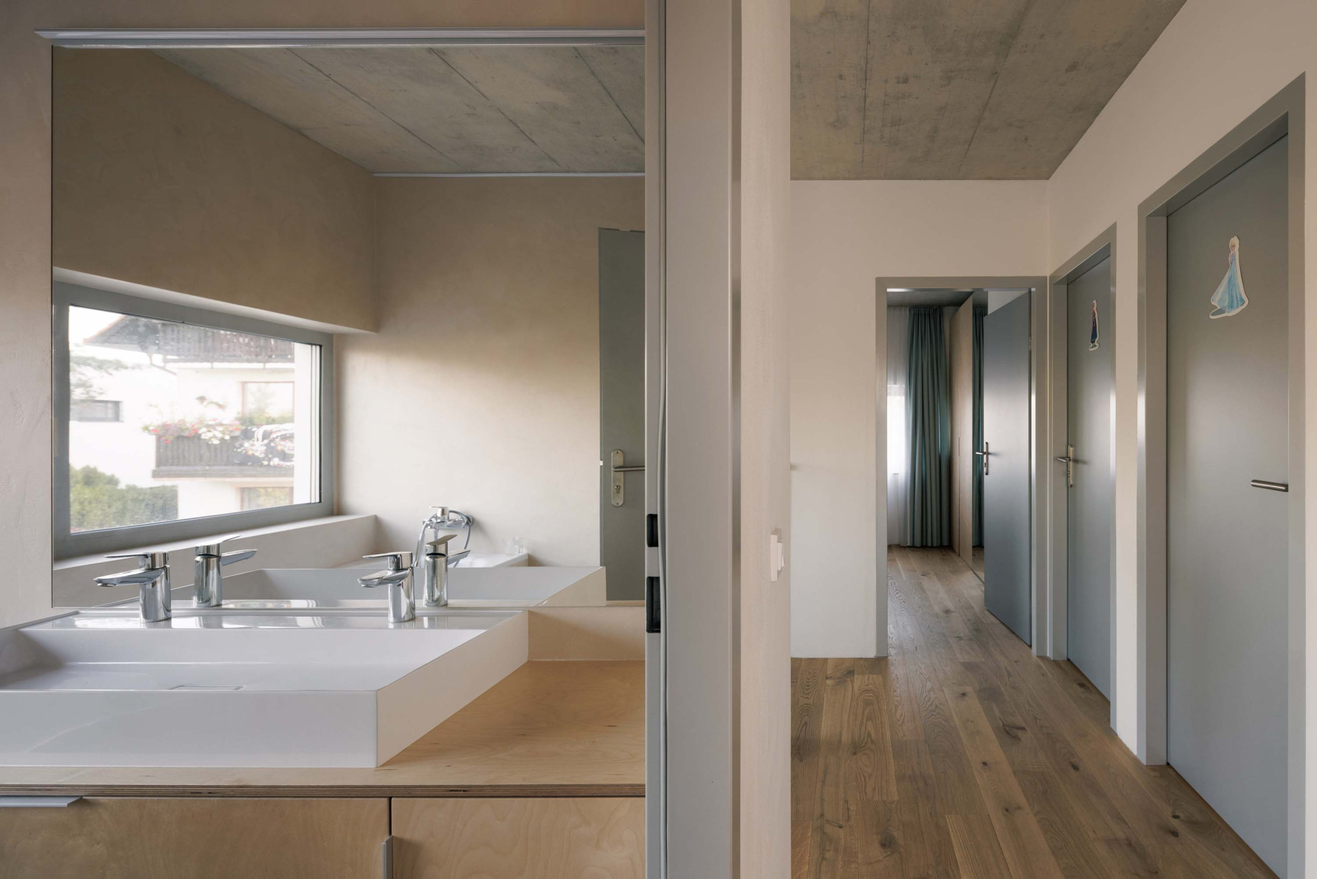 V druhém nadzemním podlaží beton ustupuje dřevu a bílé barvě. Klidnější atmosféra a teplejší tóny. V tomto patře se spí. Jsou zde umístěny dva dětské pokoje, hlavní ložnice a velká společná koupelna.