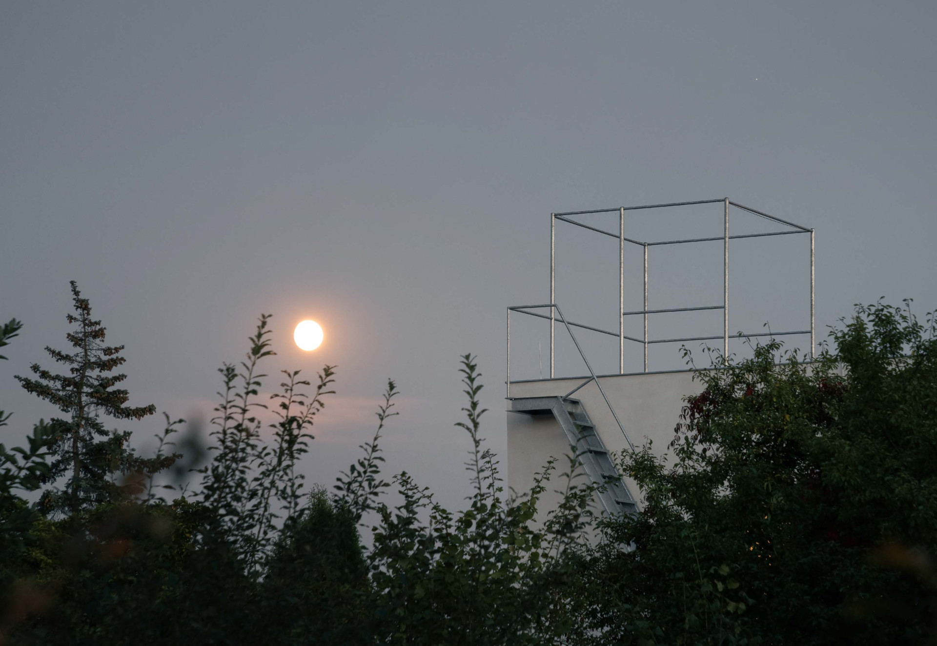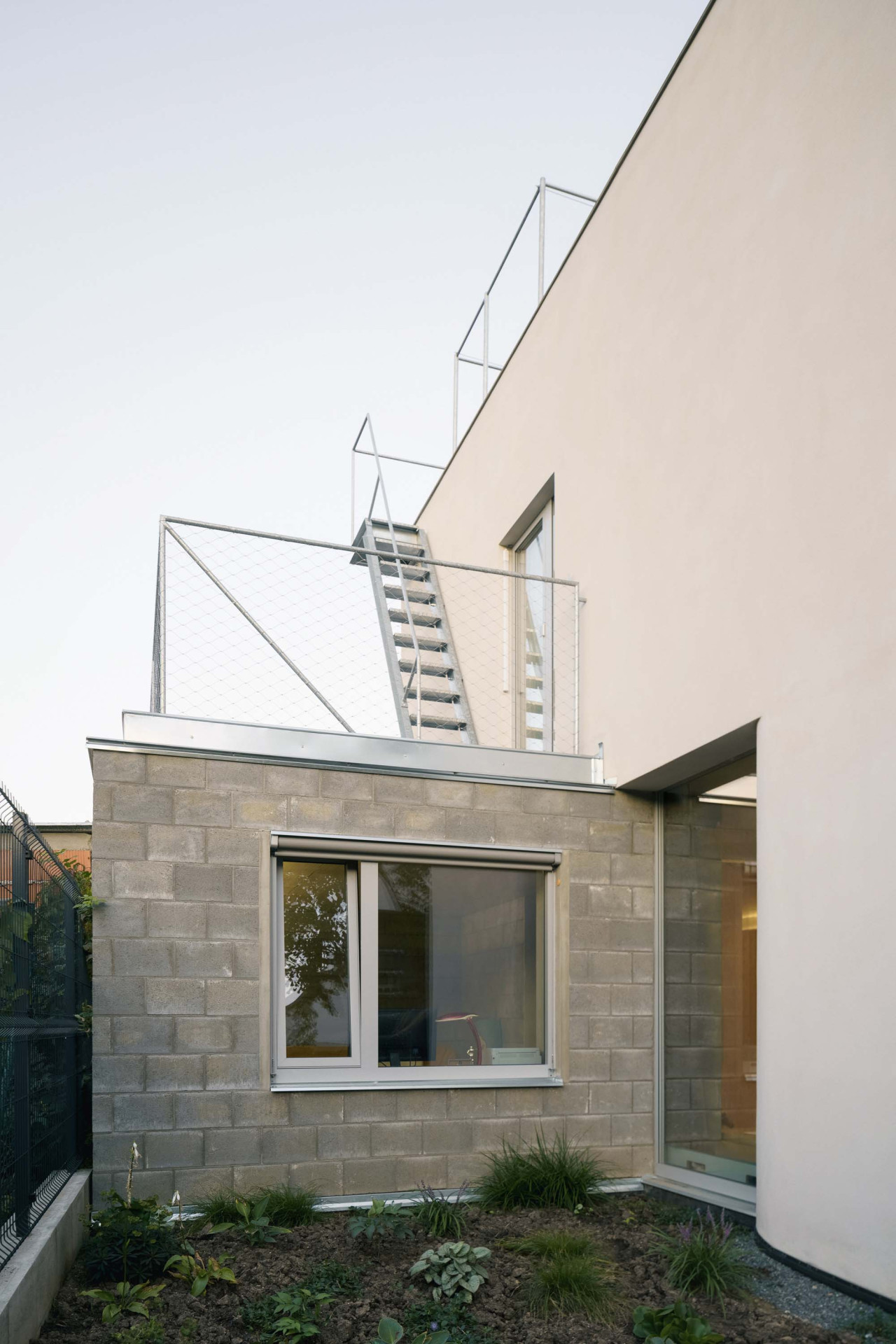 Na střeše rodinného domu se kromě extenzivní zeleně nachází vyhlídka z ocelových trubek se stahovatelným látkovým stíněním. Členové rodiny se tam dostanou po pozinkovaném ocelovém schodišti, které vede podél severní fasády ze střechy jednopodlažního appendixu.