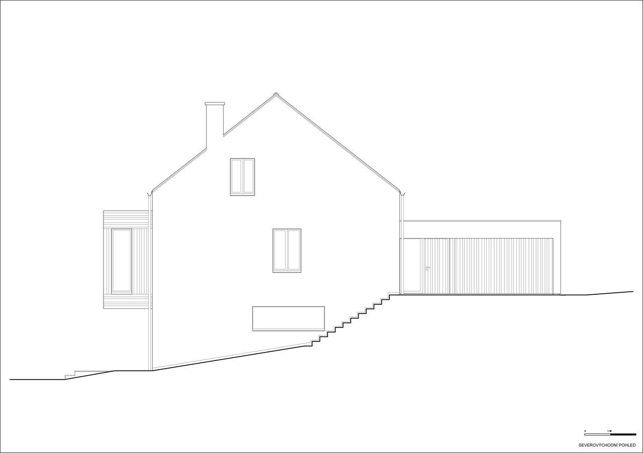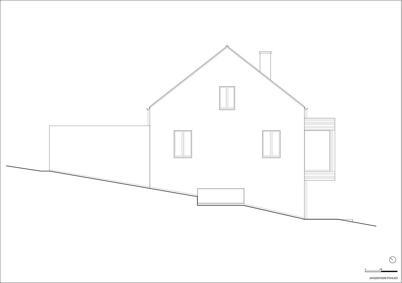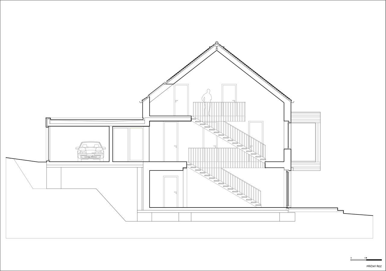 Základním motem návrhu je “chytré“ usazení hmoty a dispozic domu do svažitého terénu a jeho návaznost na zahradu a ulici. Návrh respektuje původní terén a co nejméně ho „znásilňuje“. Tvar domu je vymezen hranicí pozemku a je lehce lichoběžníkový. Jedná se o archetypální tvar, jednoduchou hmotu se sedlovou střechou.