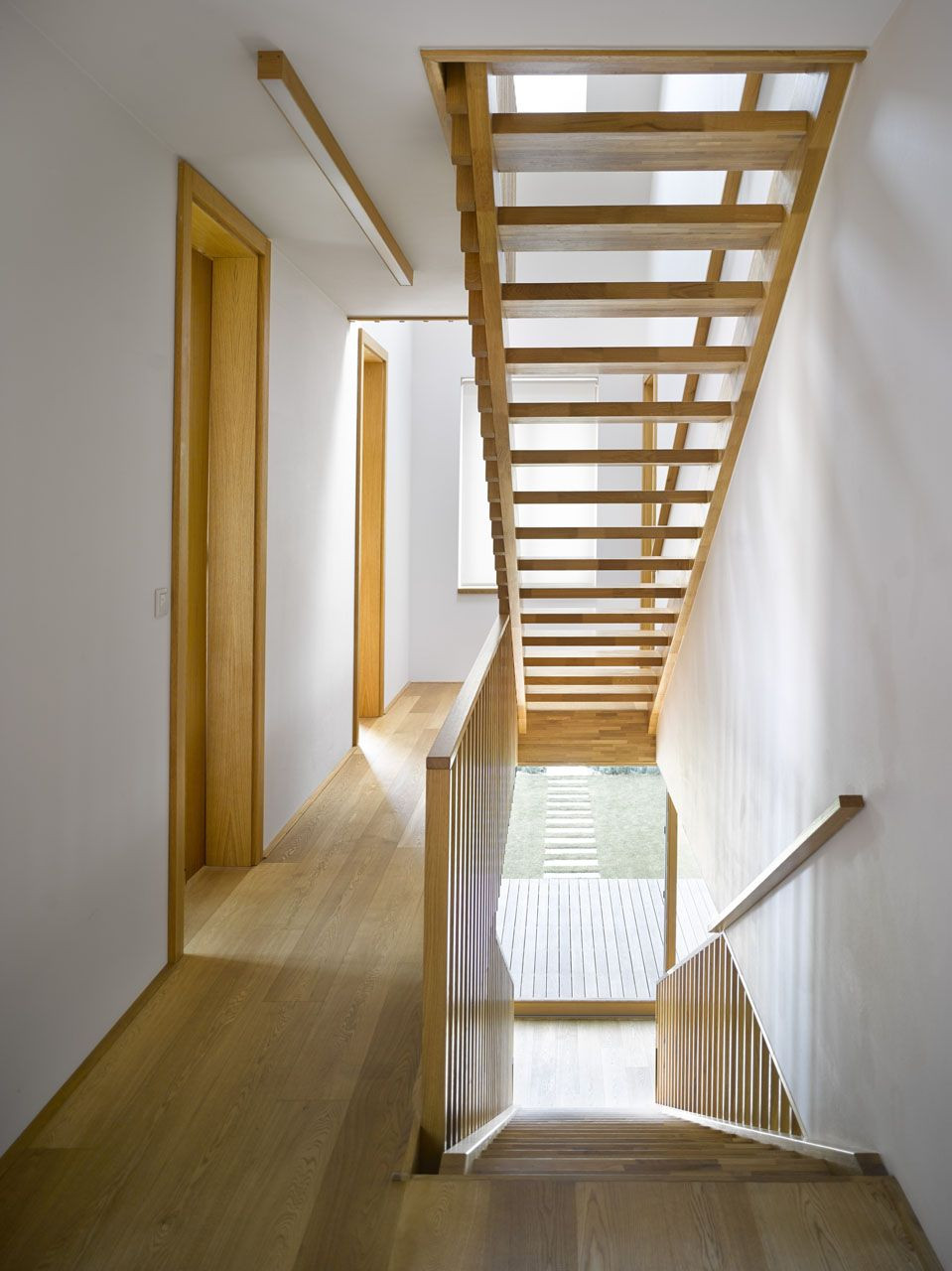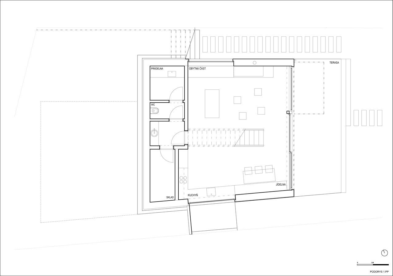 Z haly se po schodišti sestoupí do obytné části s kuchyní a jídelnou. Toto polotransparentní dubové schodiště odděluje obytnou část od kuchyně a jídelny. Hlavní prostor je propojen se zahradou a terasou velkým posuvným oknem. V obytné části je umístěn krb. V zadní části dispozice je situováno wc, prádelna a technická místnost.