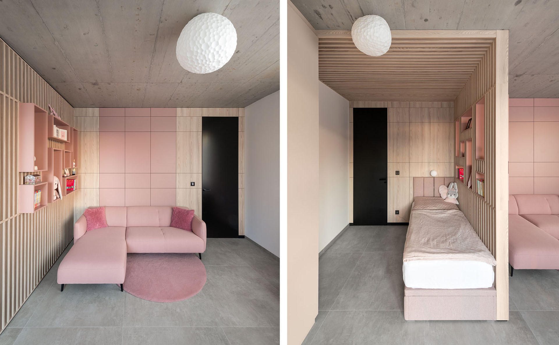 Otevřená kuchyň a jídelna tvoří jeden obytný prostor. Spodní kuchyňské skříňky jsou částečně obloženy kamennými dlaždicemi, což plně kontrastuje s vrchními skříňkami, jež jsou v dřevěném dekoru. V obývacím pokoji je rozmístěn jen volně stojící nábytek, aby byla zachována pohodlná rozlehlá prostorová kvalita. Dětský pokoj je rovněž v tvrdých površích, ale zjemnělý světlejšími barevnými odstíny.