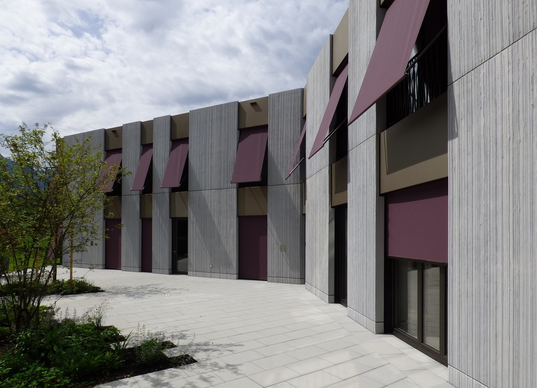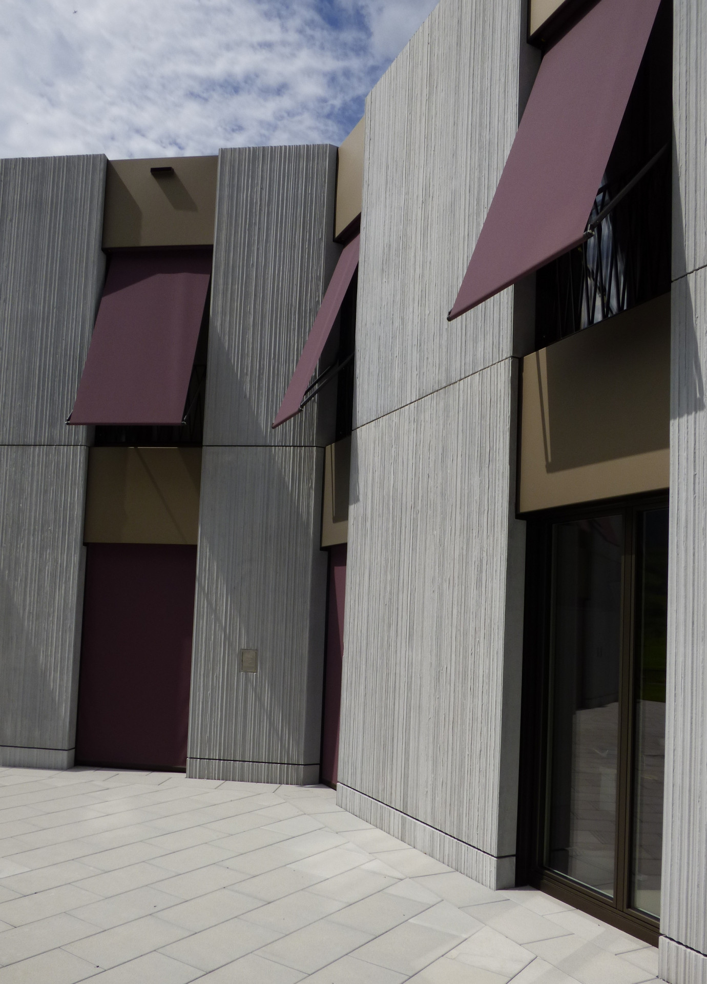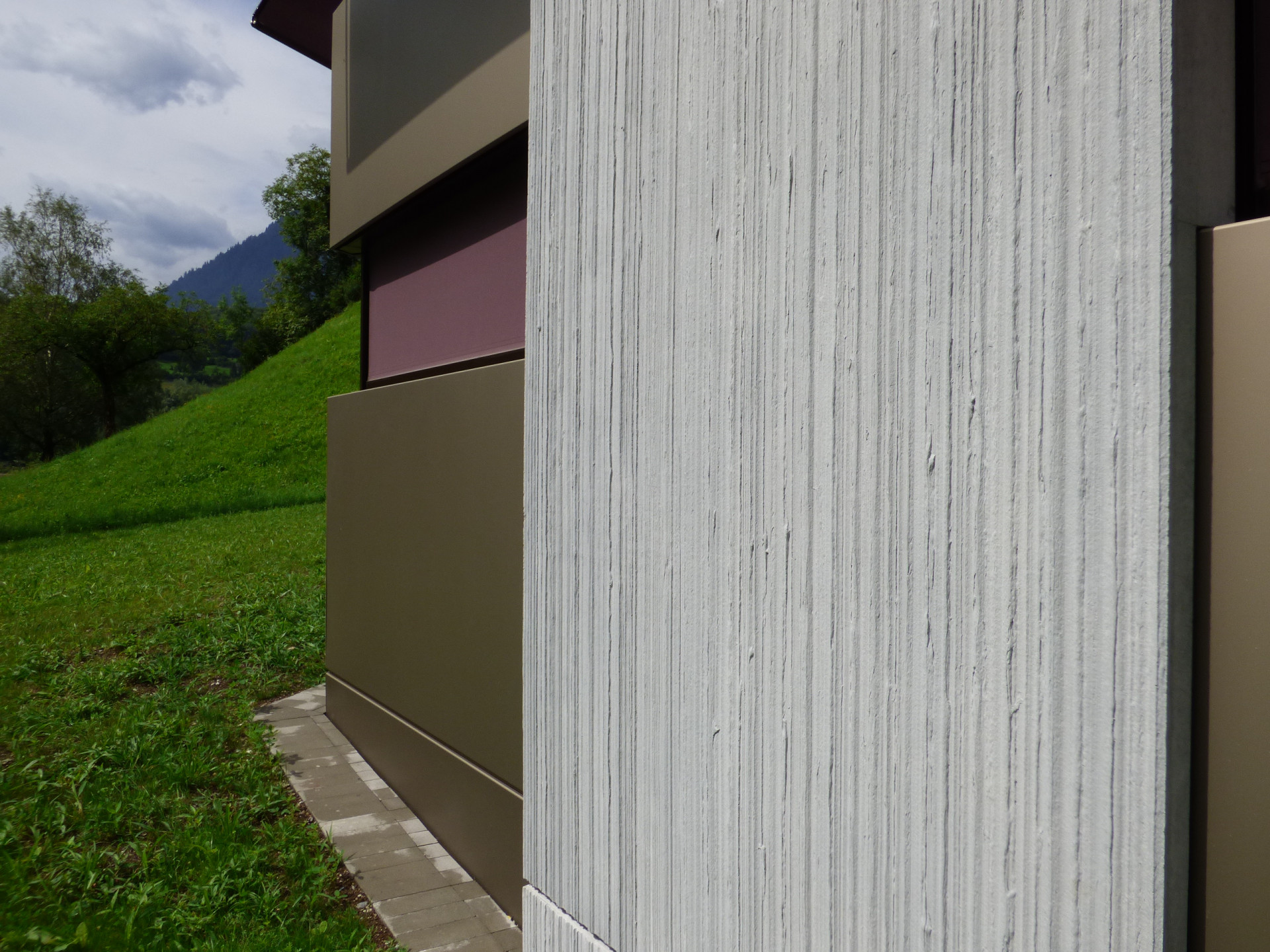 Fasáda ze sklovláknobetonových (GFRC)1 desek je stejná jako u stávajícího objektu, odlišuje se vertikálním dekorem s jemnou texturou. Firma Reckli nabízí hned několik standardních struktur matric, v tomto projektu využili architekti dvou druhů texturovaných matric ze série SELECT. Abstraktní vzor Naab s lineární texturou s různě širokými drážkami jemně rozbíjí betonovou plochu a vytváří decentní kontrast s hladkými plochami fasády Nedobytnost betonové fasády připomínající okolní masivy příhodně prořezávají francouzská okna vpouštějící dovnitř dostatek světla. Neutrální odstíny světlých betonových desek střídajících se s tlumeně bronzovými hladkými panely doplňují také výrazné, temně fialové markýzy.