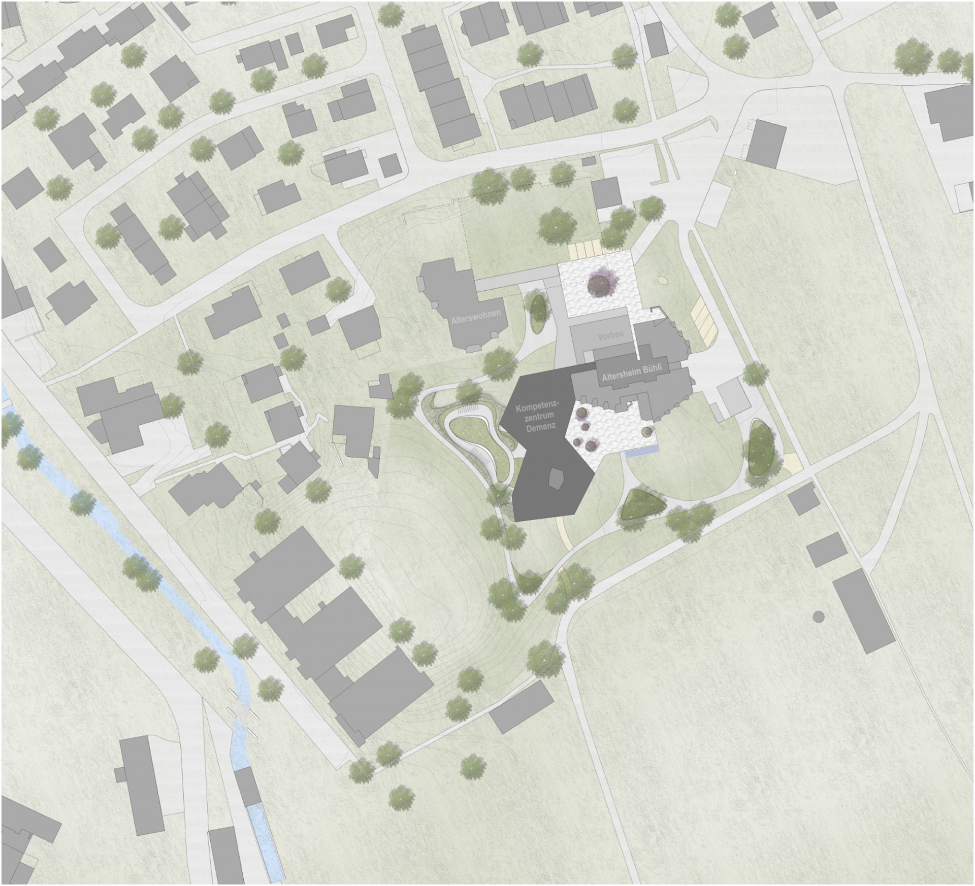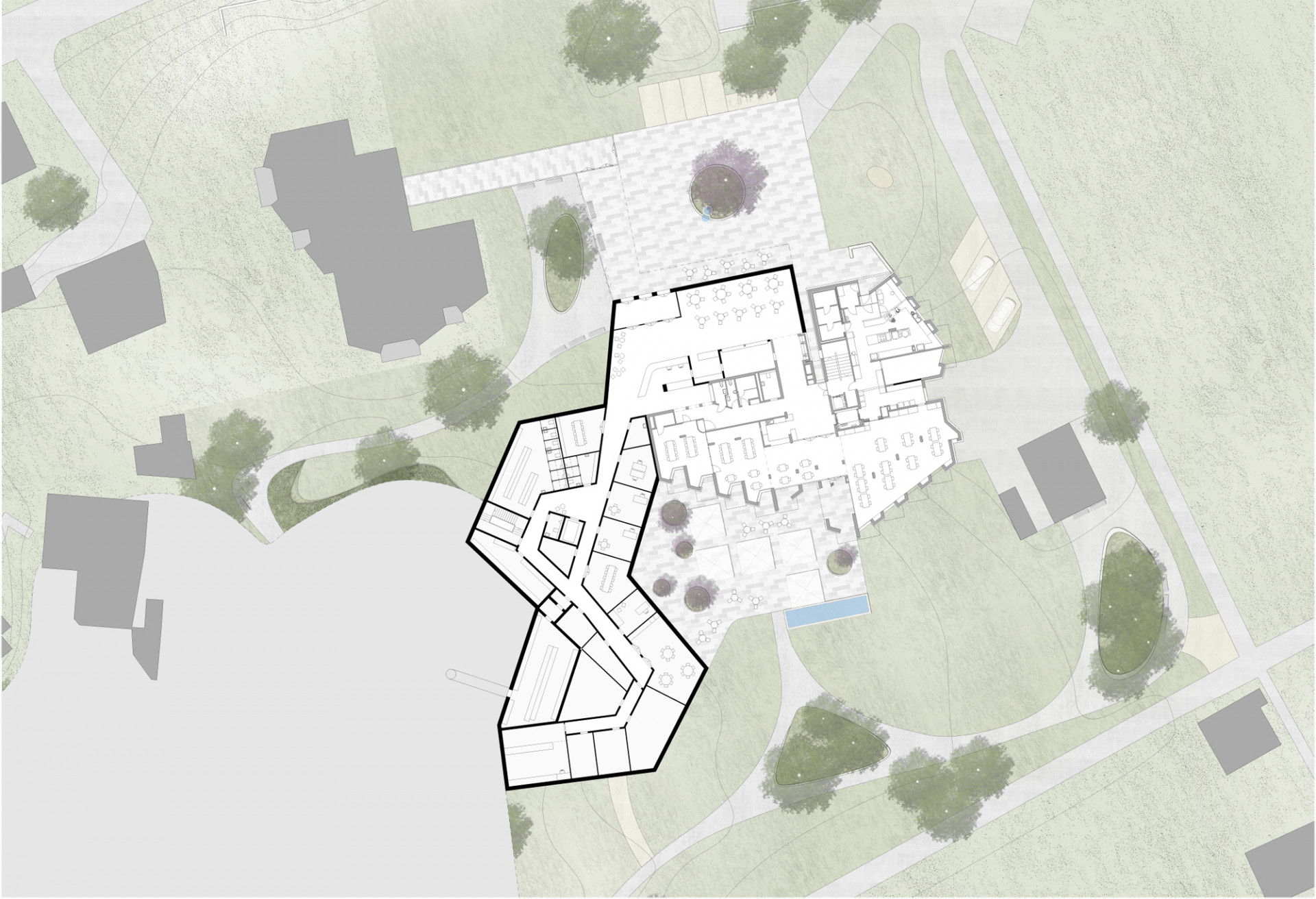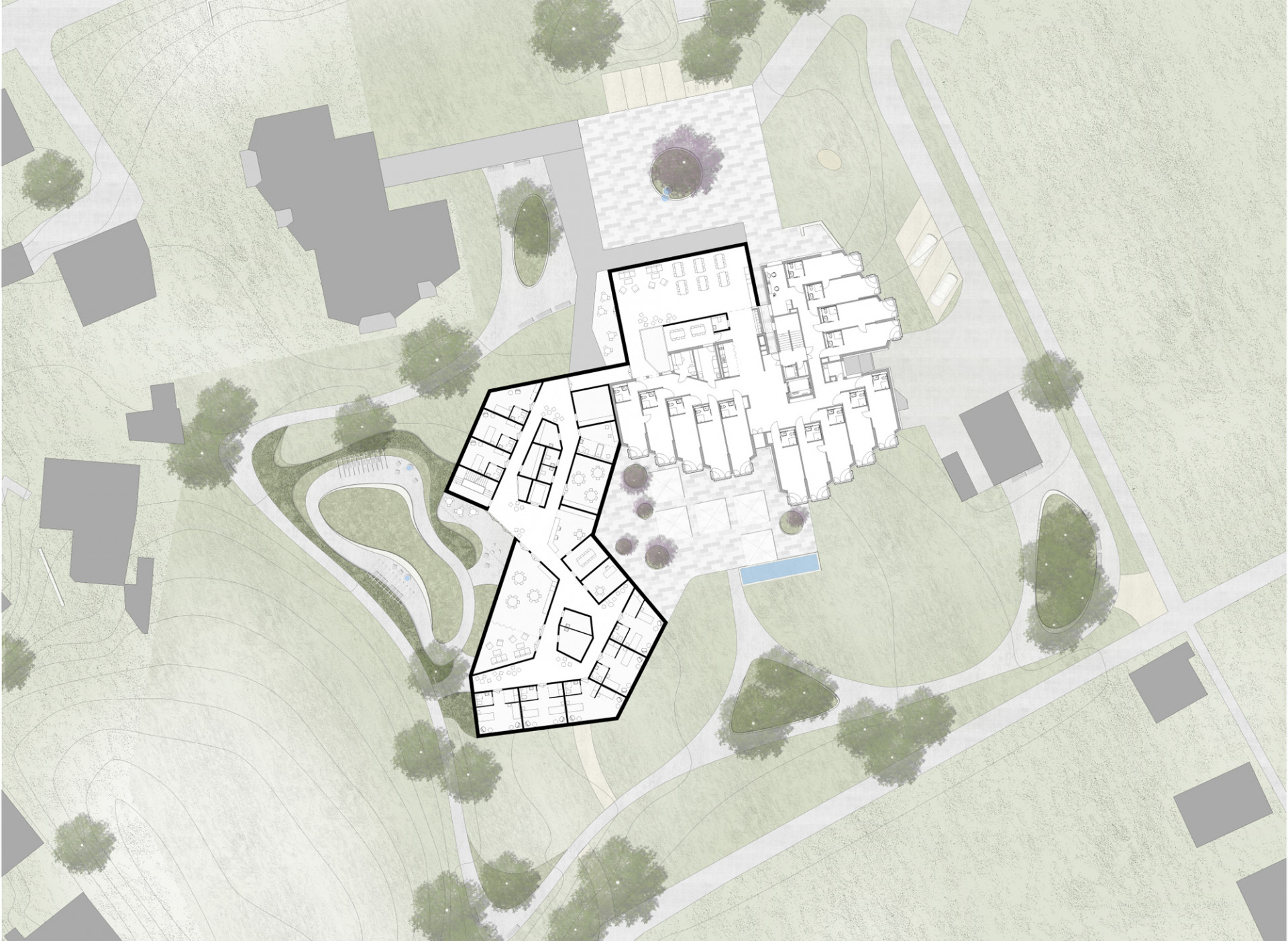 Architekti upravili i okolí zařízení. Venkovní terasy rozšiřují společenské vnitřní prostory a nabízejí možnost posezení s ostatními nebo o samotě. Vlnící se stezky ve stínu stromů vybízejí k procházce s možností osvěžit se v drobném bazénku poblíž jedné z teras. Celá přístavba jasně prokazuje citlivost, s jakou architekti k uživatelům stavby přistoupili. Právě tím se stavba odlišuje od drtivé většiny podobných zařízení.