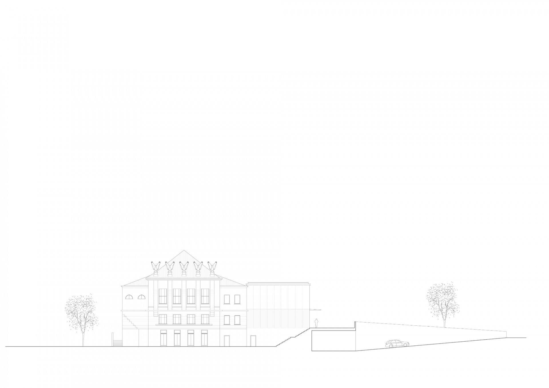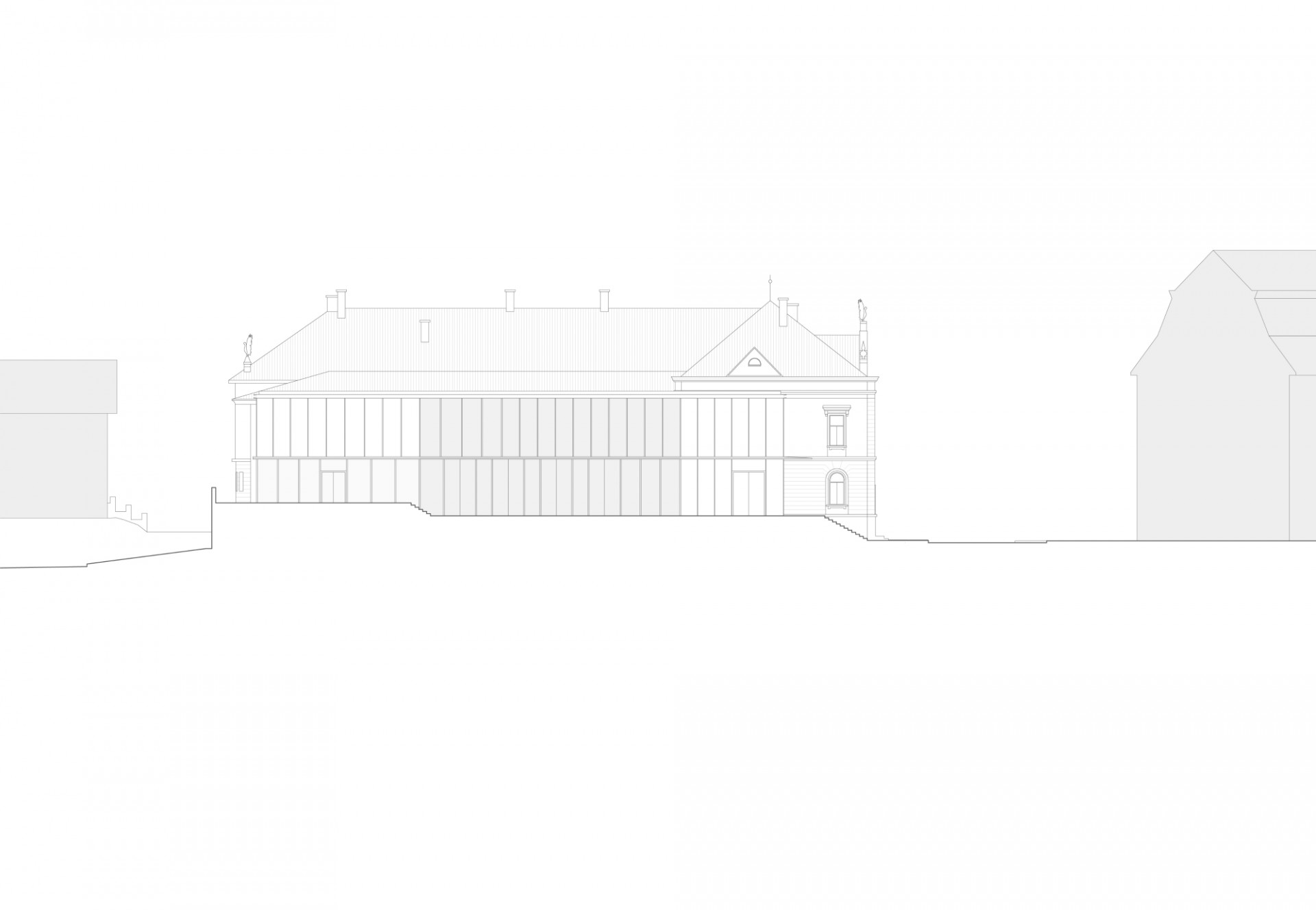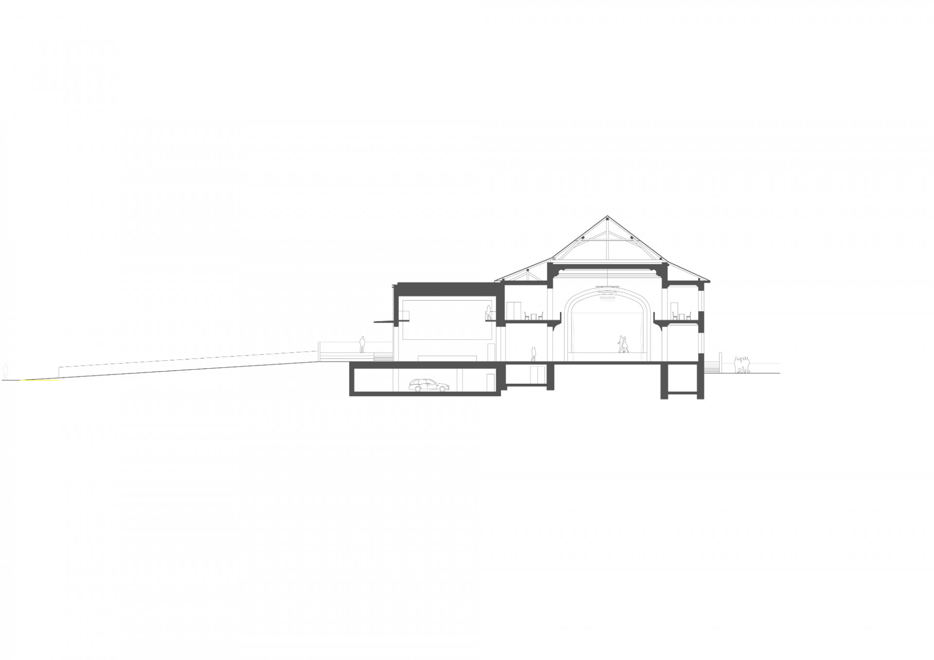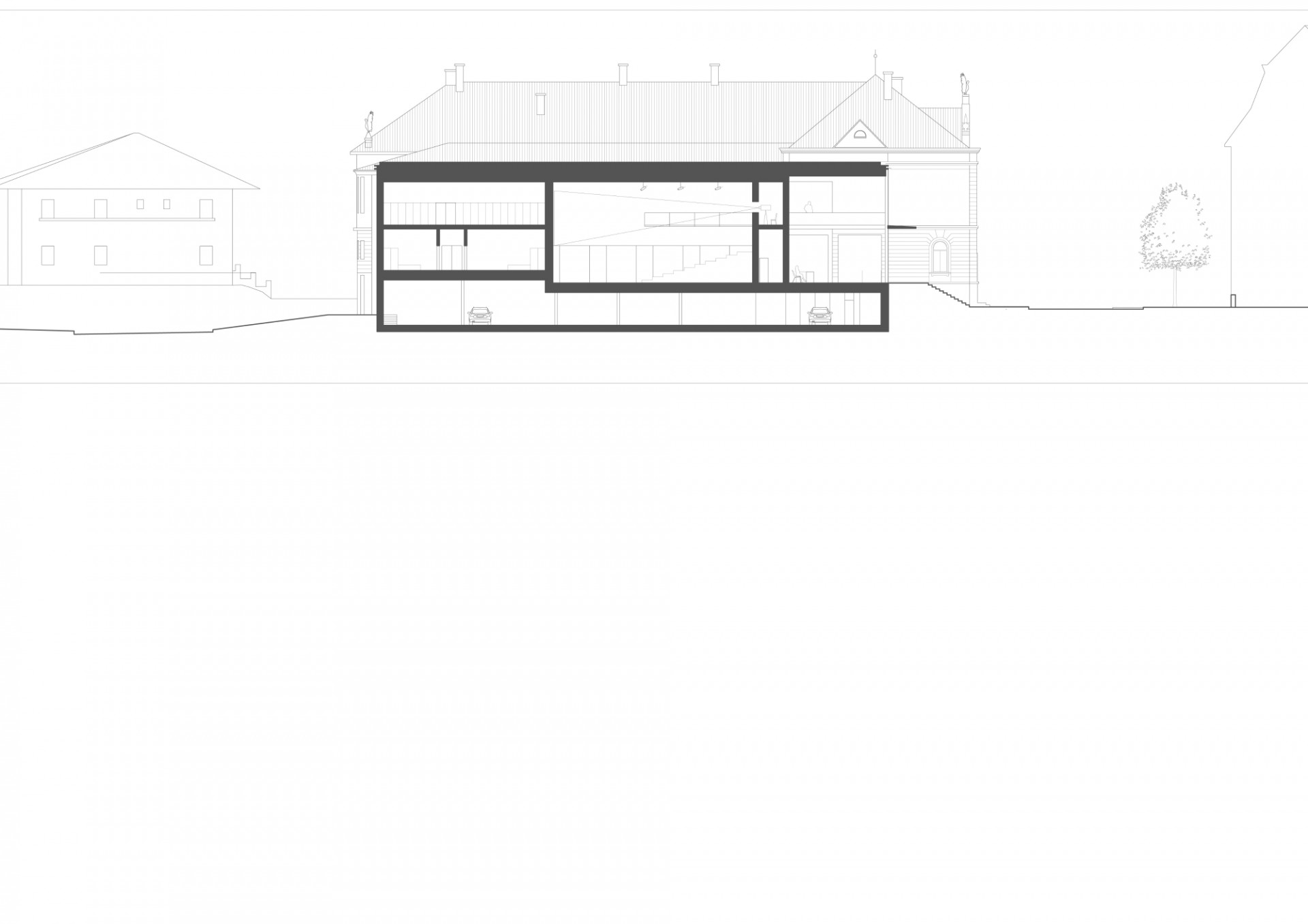 Revitalizace areálu Sokolovny v Rokycanech, Rusina Frei architekti / Martin Rusina, Martin Frei, Gabriela Sládečková, řez