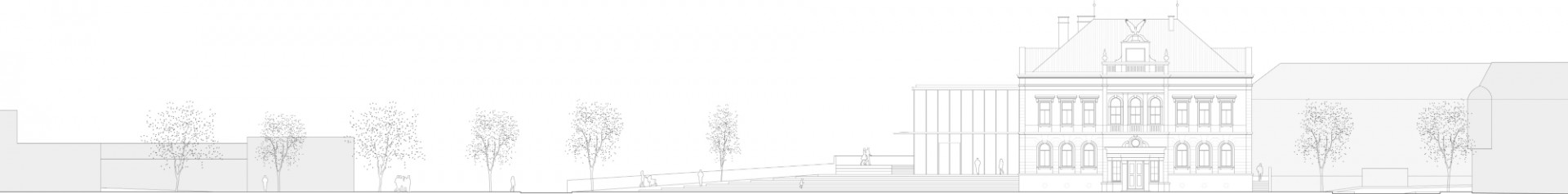 Revitalizace areálu Sokolovny v Rokycanech, Rusina Frei architekti / Martin Rusina, Martin Frei, Gabriela Sládečková, řez E-E, pohled