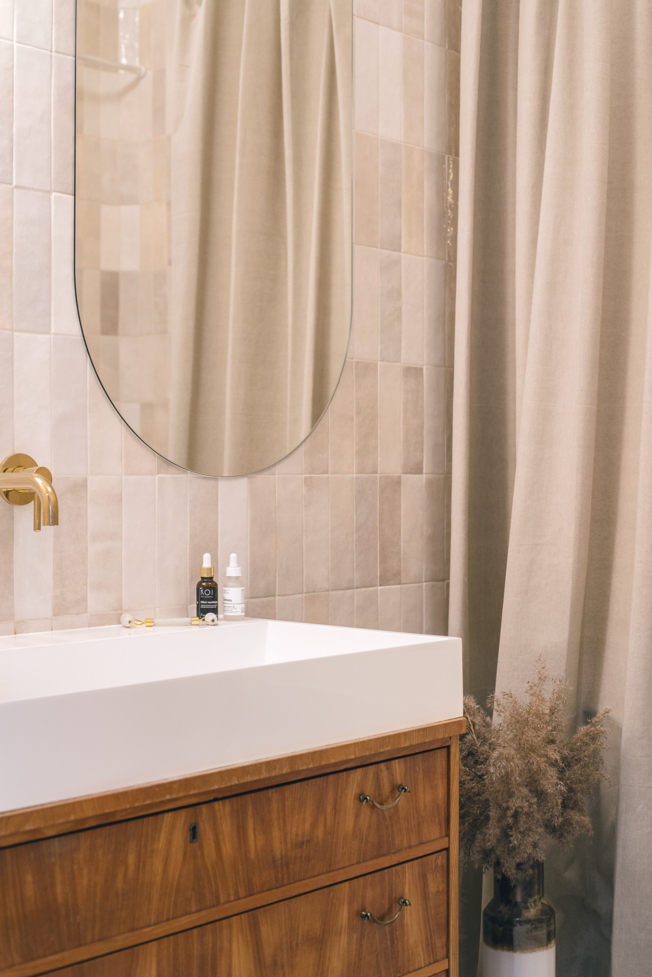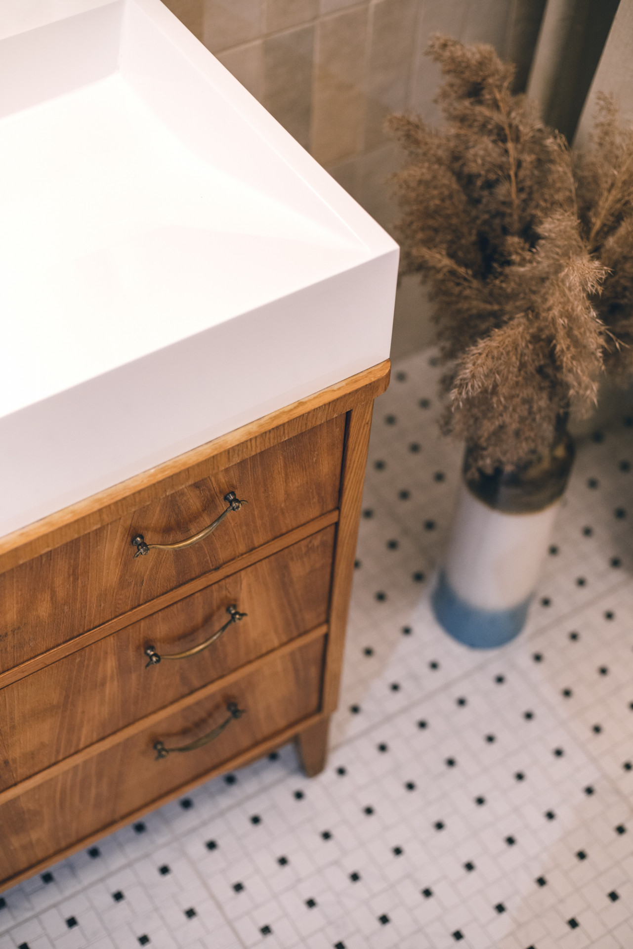 Pastelové skříňky a šedou desku TechniStone® nakonec doplnila zlatými detaily – úchytkami a baterií – které navazují na další zlaté prvky v ostatních místnostech. Jednotlivé odvážné vstupy nakonec provázala volbou organicky tvarovaného nábytku, a vytvořila tak prostor s uceleným výrazem. „Šedá kuchyňská deska TechniStone®, černá lampa a vintage dřevěný stůl v této roli fungovaly skvěle,“ podotýká autorka na závěr.