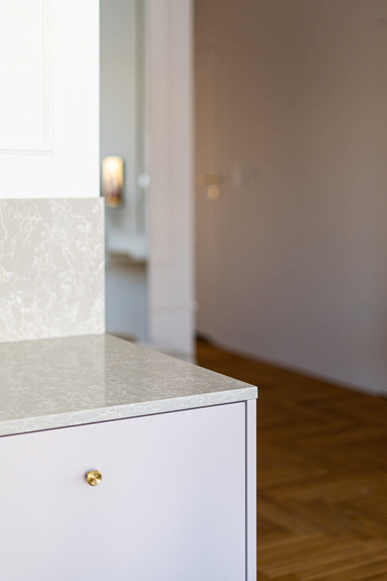 Právě kuchyňská linka osazená pracovní deskou z tvrzeného kamene TechniStone® v dekoru Noble Olympos Mist se stala součástí nejodvážnějšího prvku celého interiéru – pastelově růžové kuchyně, kterou mladí investoři přijali s nadšením. „Znala jsem jejich vkus a byla jsem si téměř jistá, že se setkám s úspěchem. To, co vidíte na fotografiích, je první verze projektu, nic jsem nezměnila,“ vysvětluje Natalia Mielczarek-Prym.